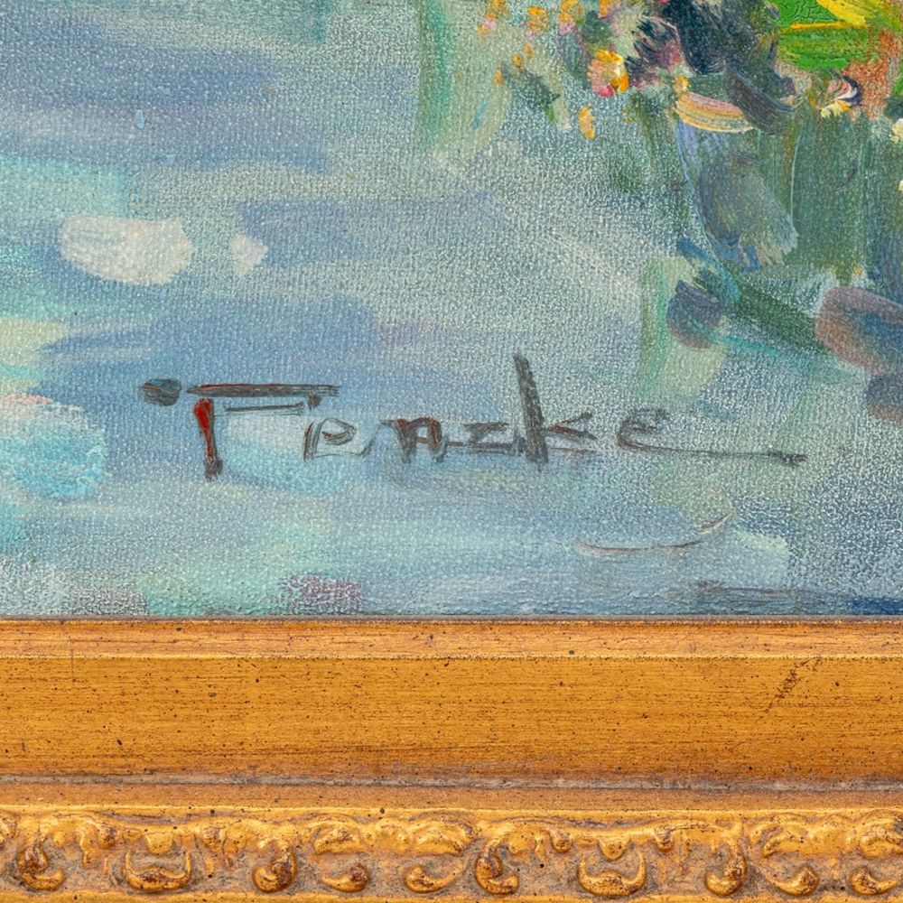 T. E. Pencke (French, b. 1929), Parisian Street Scene, Oil on Canvas, signed lower right, giltwood frame. Some buckling of canvas to top corners. Image: 23.25" H x 35.25" W; frame: 34.5" H x 46.25" W. Provenance: From a United Nations Plaza, Manhattan Estate. Keywords: Painting, Oil painting, Works on Canvas, Figures, Figural, Figurative, Cafe, Cityscape, Post-Impressionist, Impressionism, 20th Century School, Contemporary Art, Fouquets