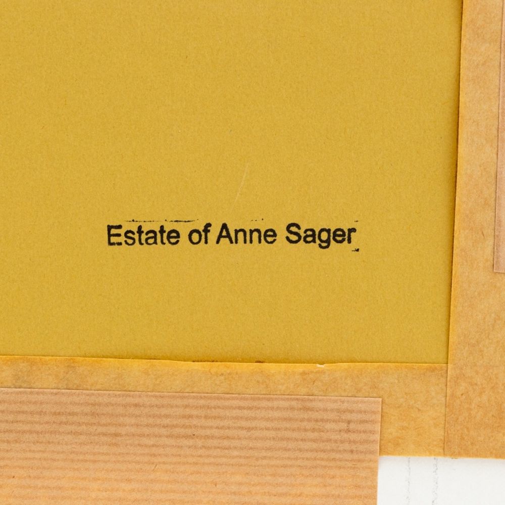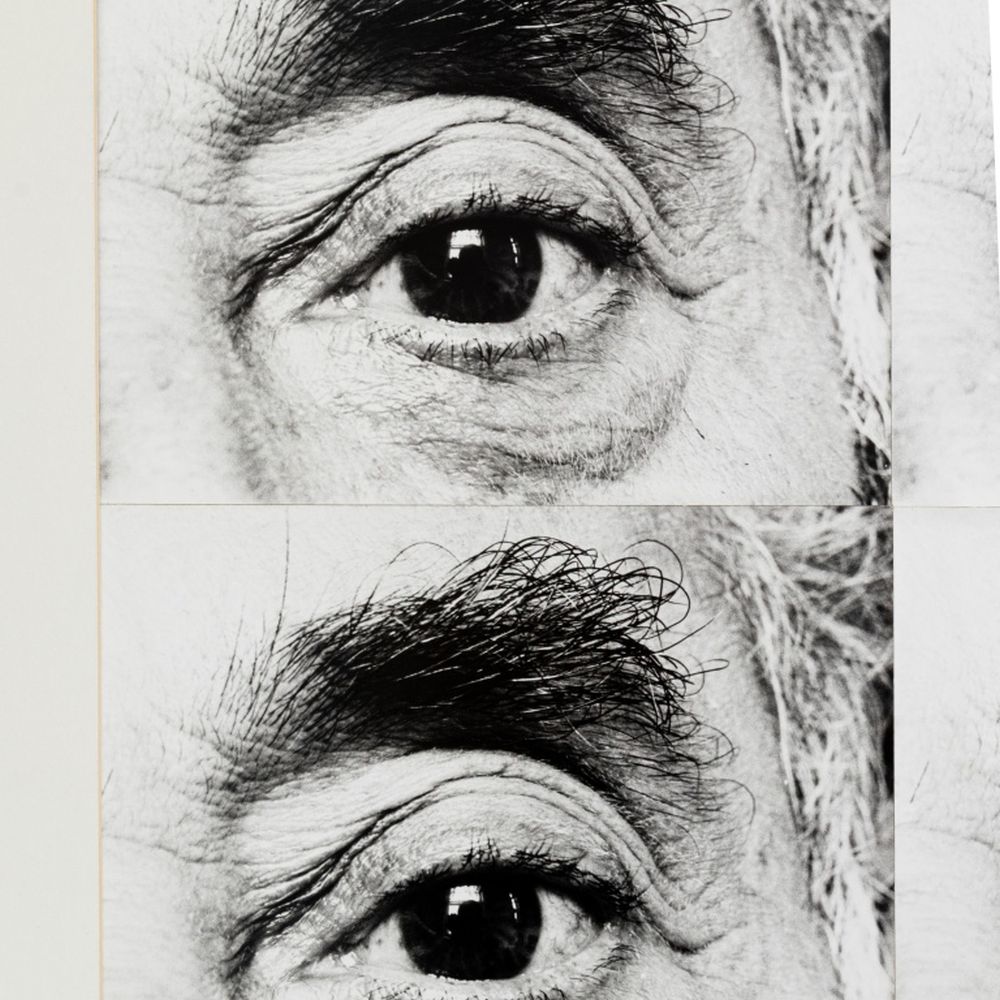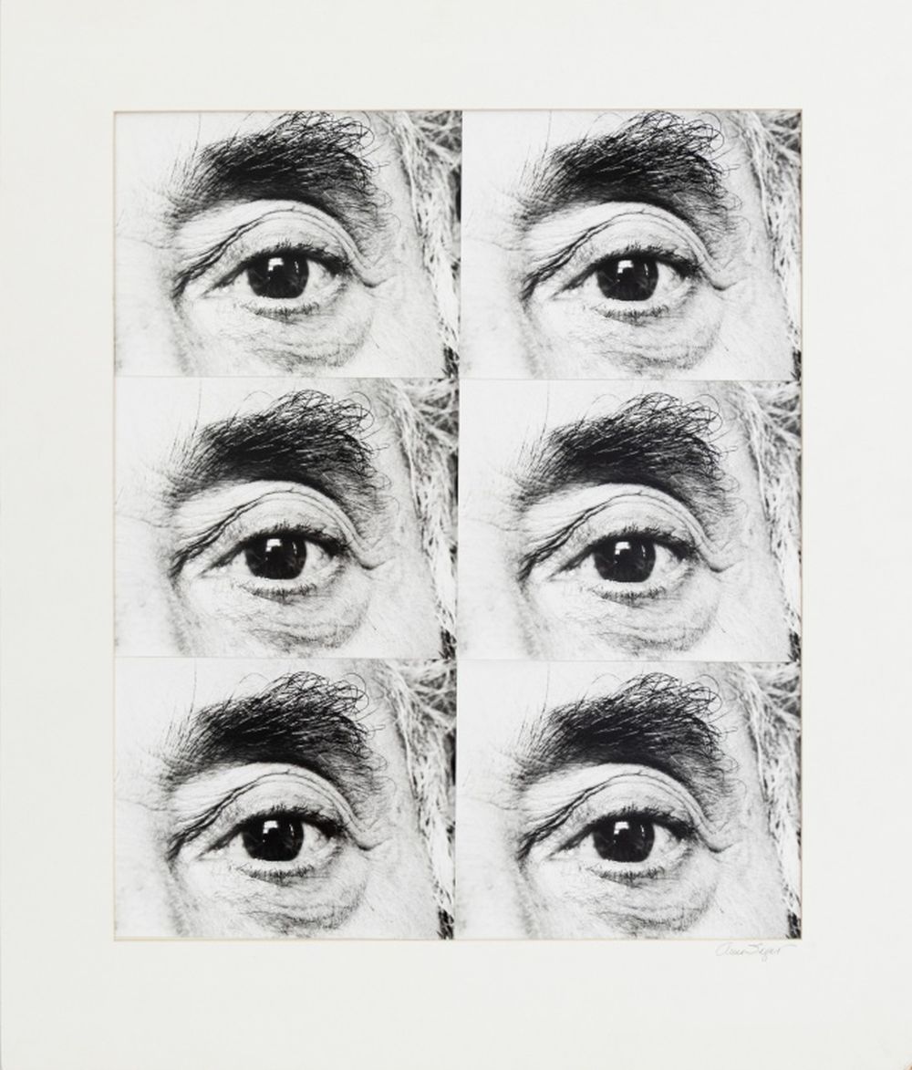 Anne Sager (American, 1930-2024), "The Eye of Eisenstaedt", Black and White Photograph Collage, depicting the eye of Alfred Eisenstaedt (American, 1898-1995) in repetition, signed lower right, with artist's estate stamp to verso, in mat, unframed. Image: 23.5" H x 19.5" W; mat: 30.5" H x 26" W. Provenance: From a 35 East 75th Street Estate. Keywords: Photography, Prints, Multiples, Photojournalist, Portrait, Portraiture, Macro, Close up, Grid, Women Artists, Contemporary Art