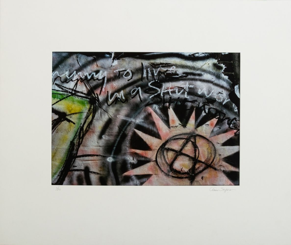 Anne Sager (American, 1930-2024), "Trying to Live in a Shit World", Color Photograph Chromogenic Print on Paper, signed lower right, signed and with artist's estate stamp to verso, in mat, unframed. Image: 12.75" H x 18" W; sheet: 16" H x 20" W; mat: 23.5" H x 28" W. Provenance: From a 35 East 75th Street Estate. Keywords: Photography, Prints, Multiples, Graffiti, Anarchy, Anarchist, Protest, City, Trying to Live in a Shit World, Abstract, Abstraction, Women Artists, Contemporary Art