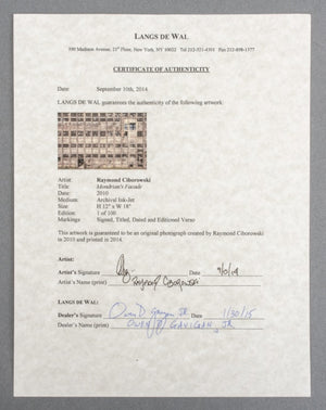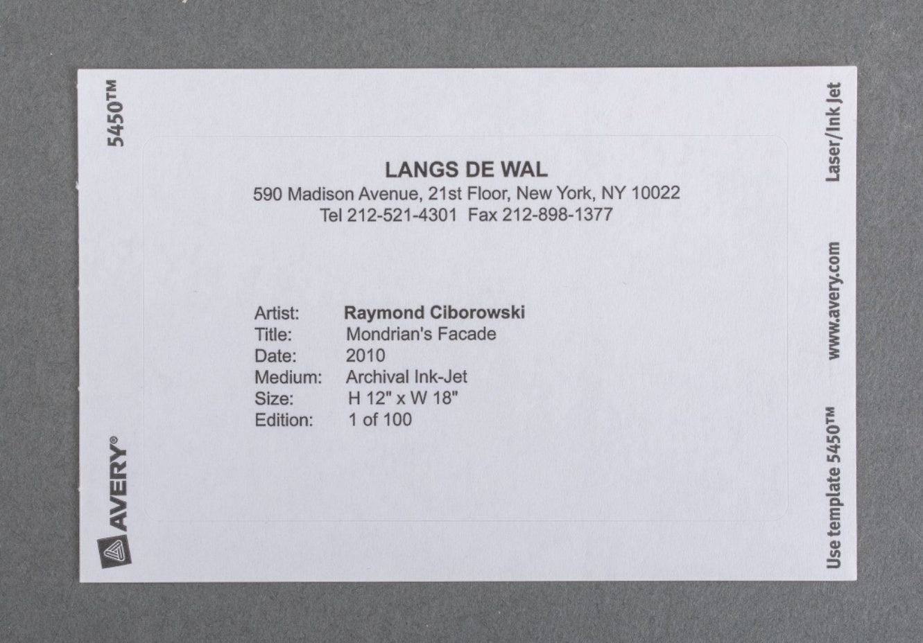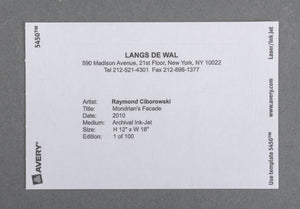 Raymond Ciborowski (American, b. 1970), "Mondrian's Facade", Archival Inkjet Print on Paper, numbered edition "1/100" and signed to verso, 2010, unframed. This work is accompanied by a certificate of authenticity signed by the artist. 13" H x 19" W. Provenance: From a New York City Collection.