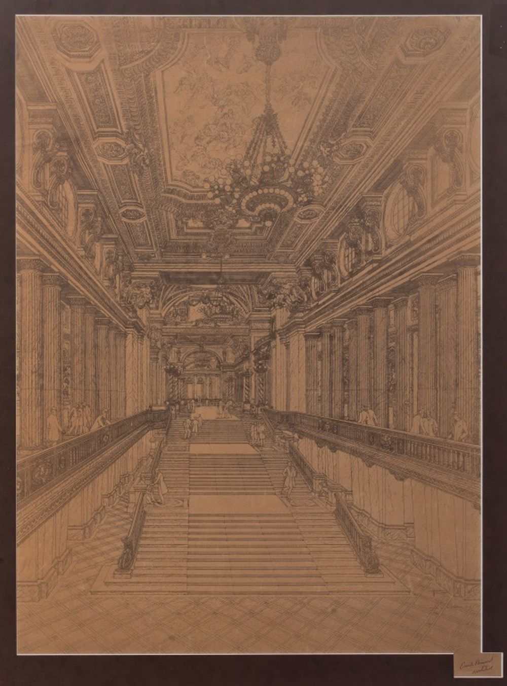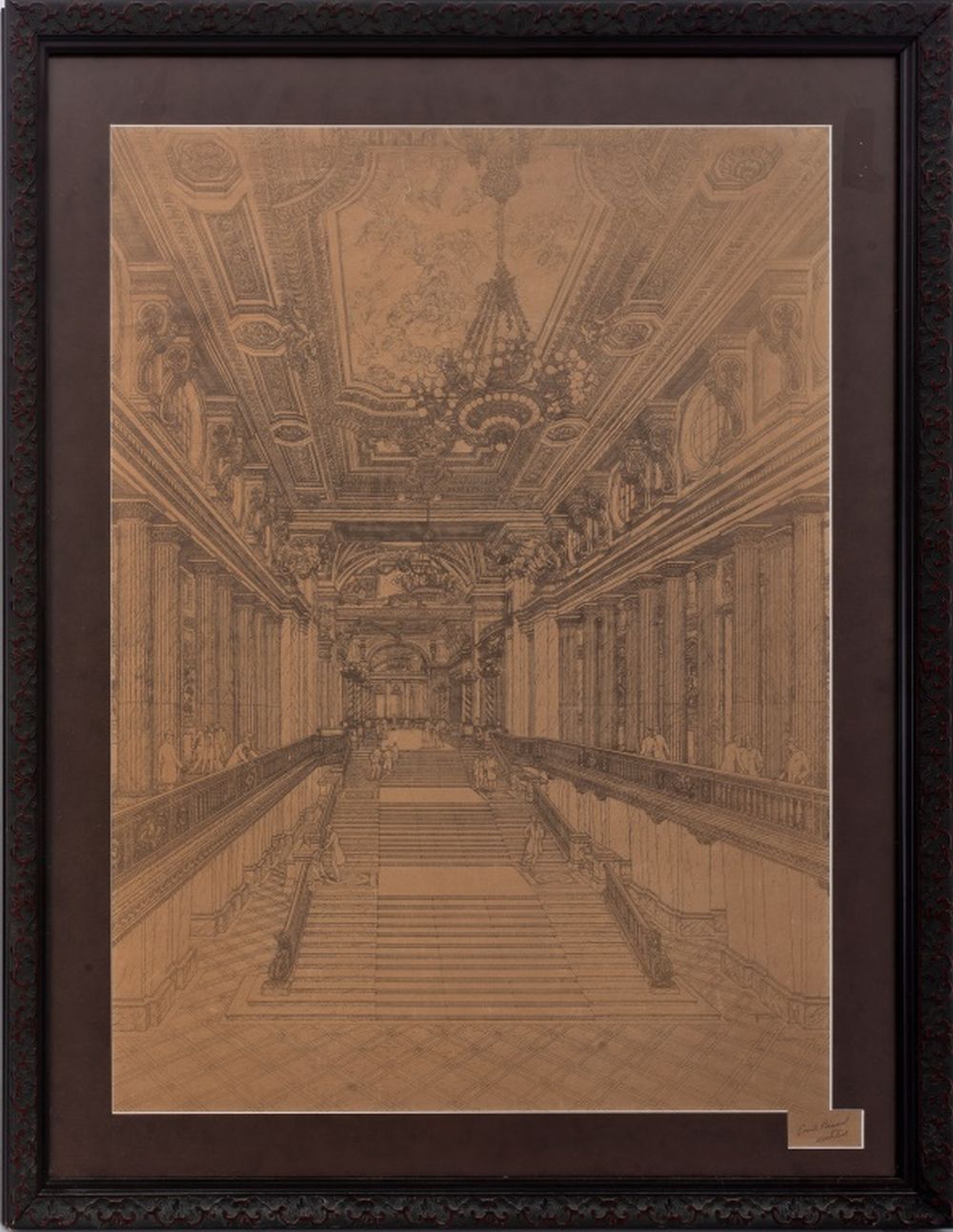 Emile Benard (French, 1844-1929), Beaux Arts Interior, Architectural Rendering, Etching, signed in ink "Emile Benard / Architect" lower right, wood frame. Image: 33" H x 24" W; frame: 40.25" H x 32" W. Provenance: From a Jersey City Collection. Keywords: Prints, Multiples, Intalgio, Belle Epoque, Napoleon III, Second Empire, Building, Charles Garnier, Architectural competition drawing, Interior design, Gilded Age, Antique, Turn-of-the-Century Art