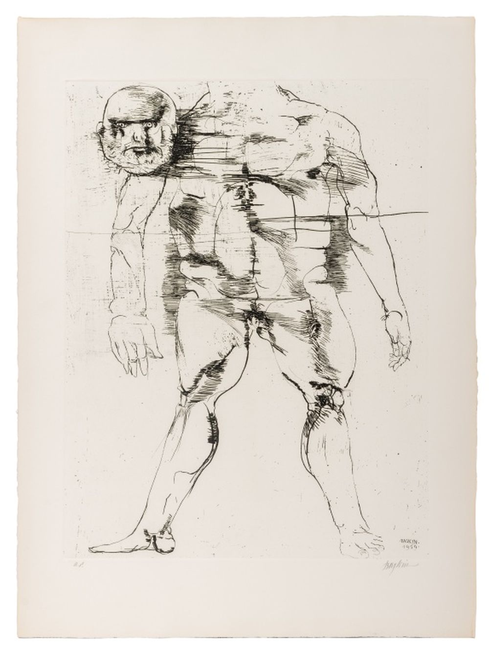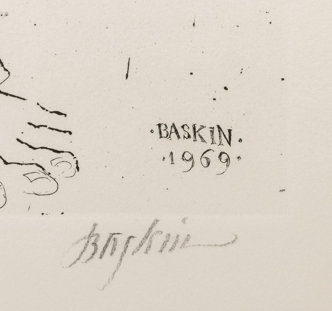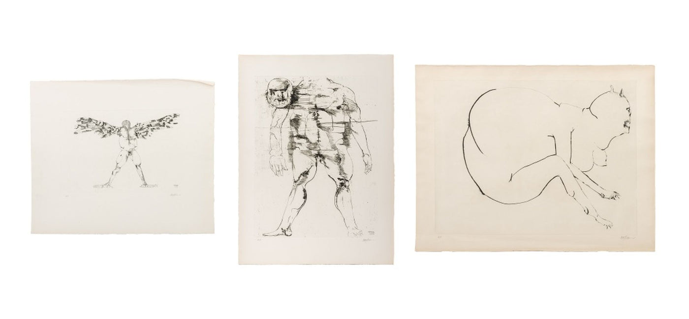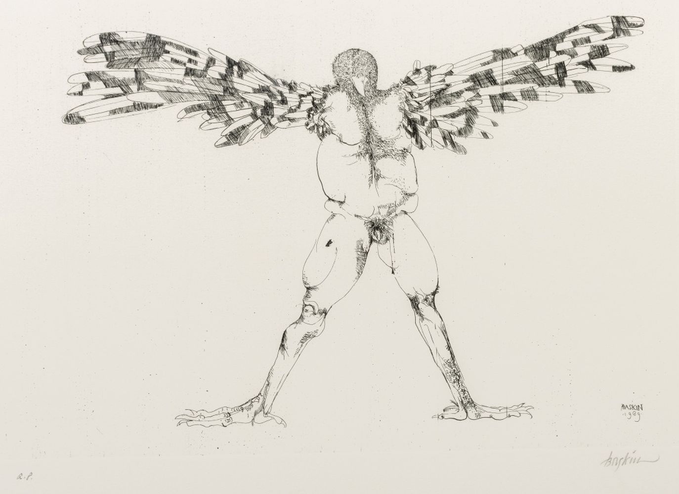 Leonard Baskin (American, 1922-2000), Three Surrealist Figural Compositions, Etching on Wove Paper, each marked edition "A.P" lower left and signed in pencil lower right, comprising: seated devil figure, decapitated man signed and dated "1969" in plate, and bird-man signed and dated "1969" in plate, each unframed. Largest image: 17.5" H x 25.5" W; sheet: 23.5" H x 30" W. Provenance: From a New York City Collection. Keywords: Prints, Multiples, Intaglio, Artist's Proof, Nude Figure, Figurative, Demon, Headless, Winged, Grotesque, Horror, Harpy, Surrealism, 20th Century School, Post-War and Contemporary Art