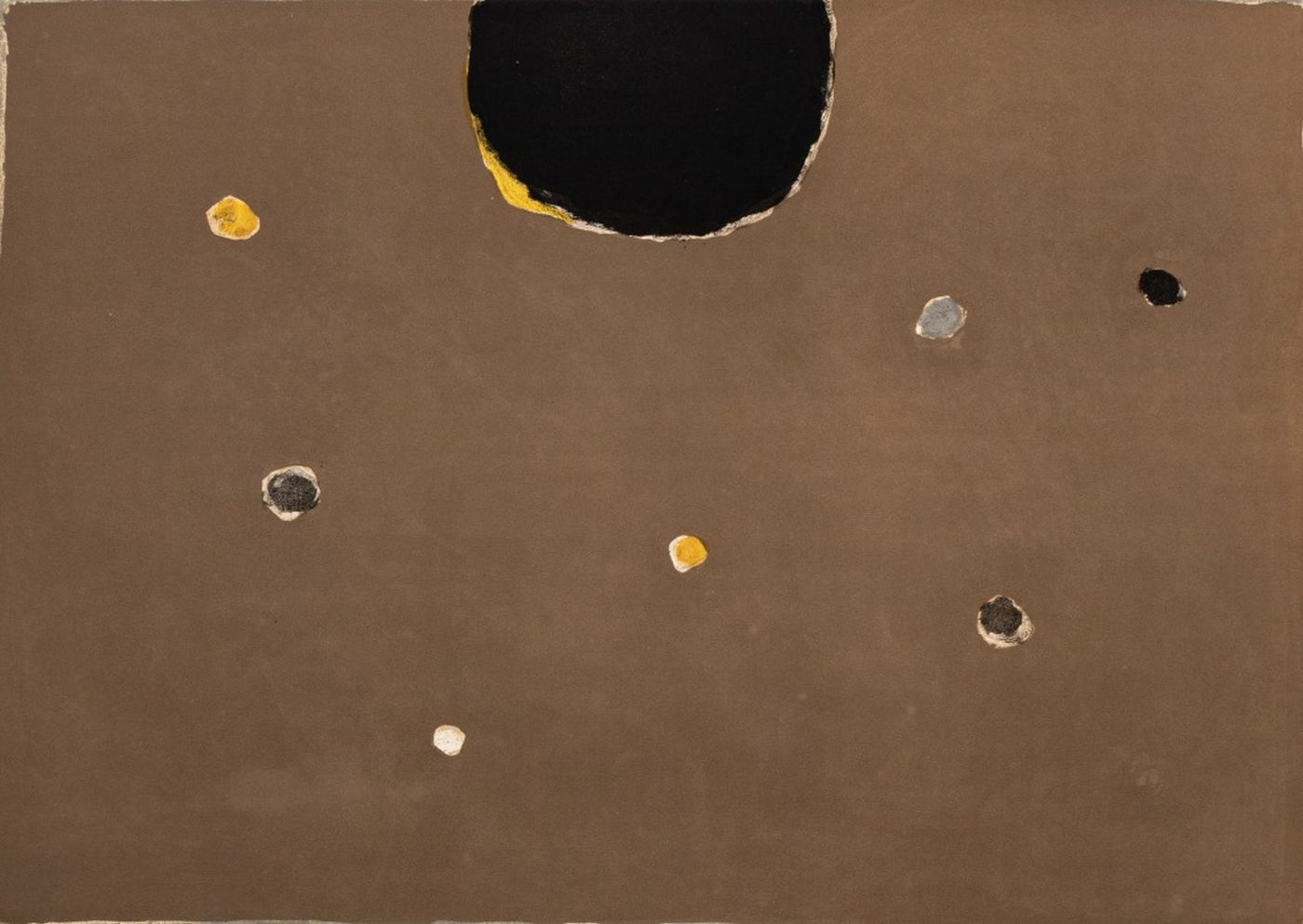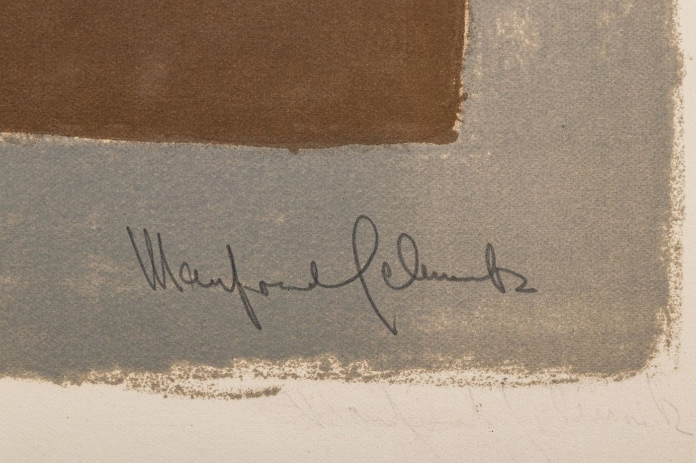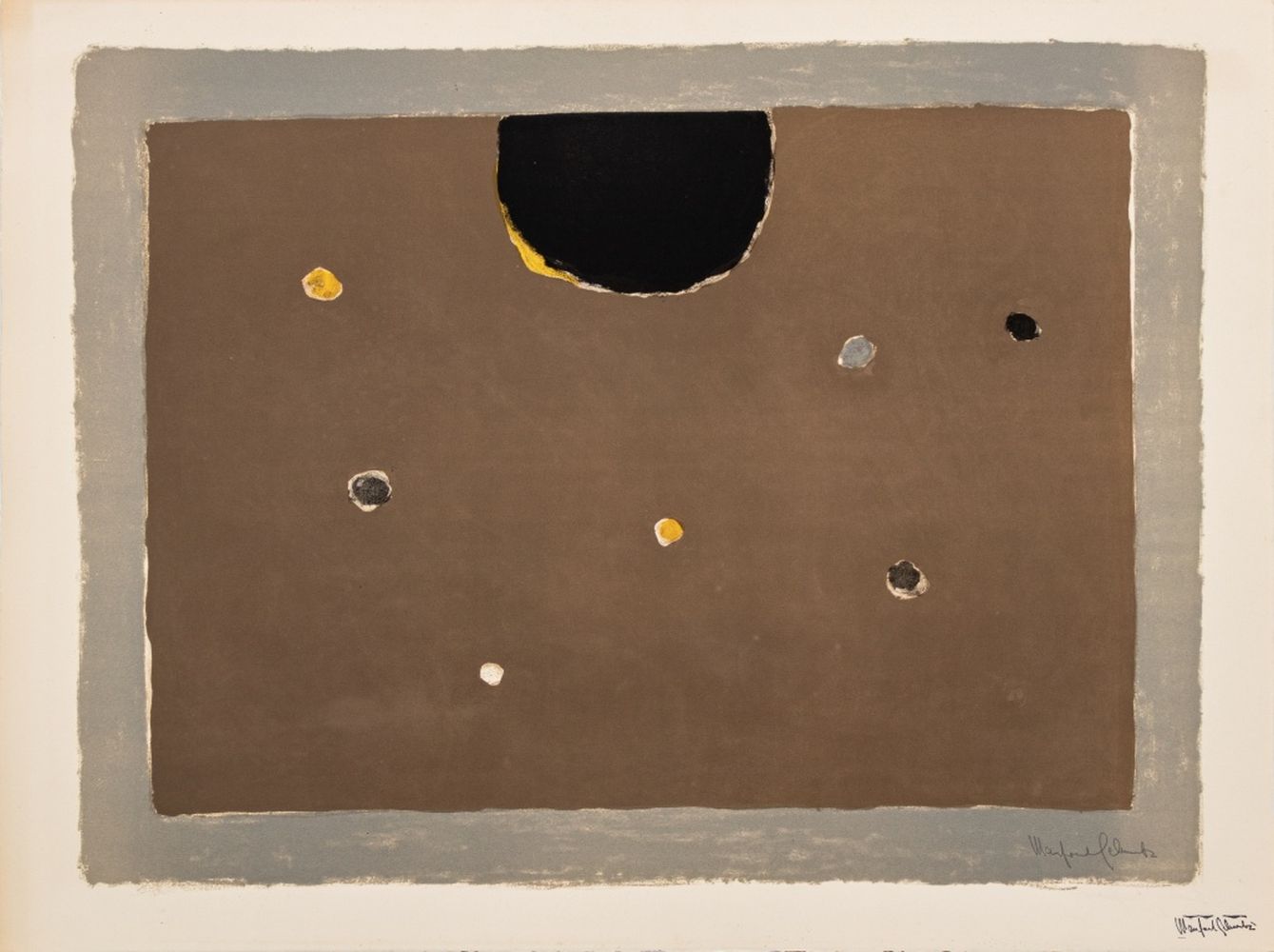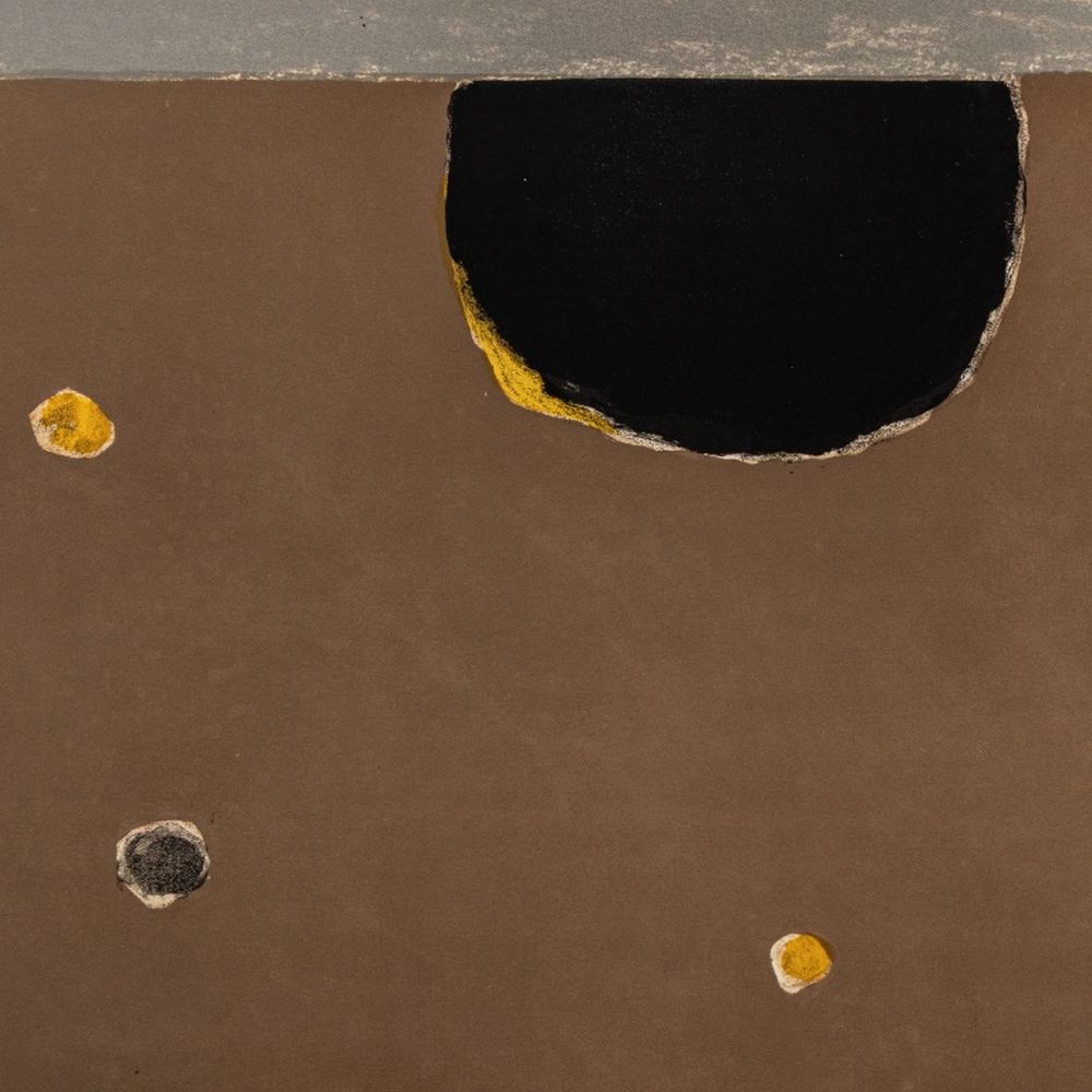 Manfred Schwartz (American, b. Poland, 1909-1970), "Somber Planet", Lithograph on Paper, mid 20th century, signed in pencil and with the artist's signature stamped lower right, unframed. Image 18.5" H x 25" W; sheet: 21.5" H x 28.25" W. Provenance: From a 35 East 75th Street Estate. Keywords: Prints, Multiples, Abstract Composition, Abstraction, Geometric, Rising Sun, Earth Tones, Polychrome, Provincetown, P-town Artist, Post-War Art