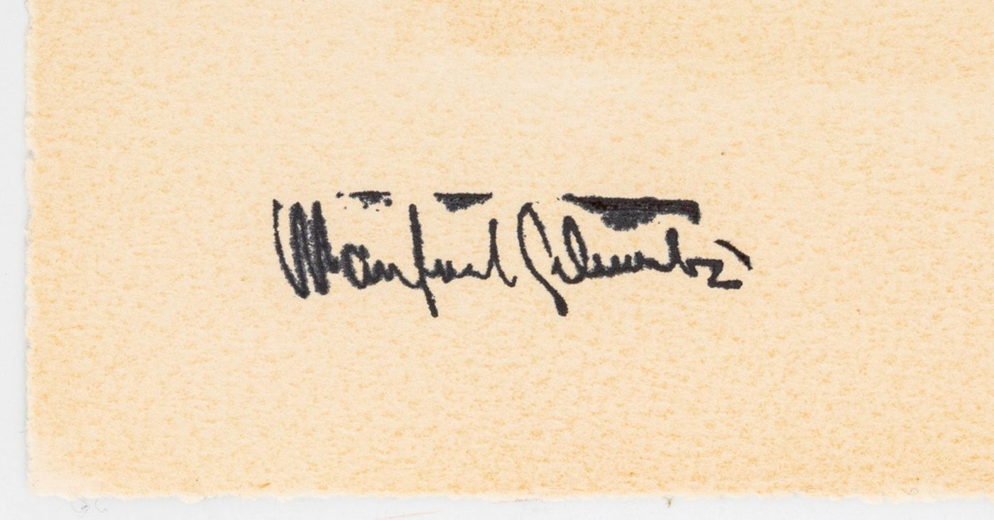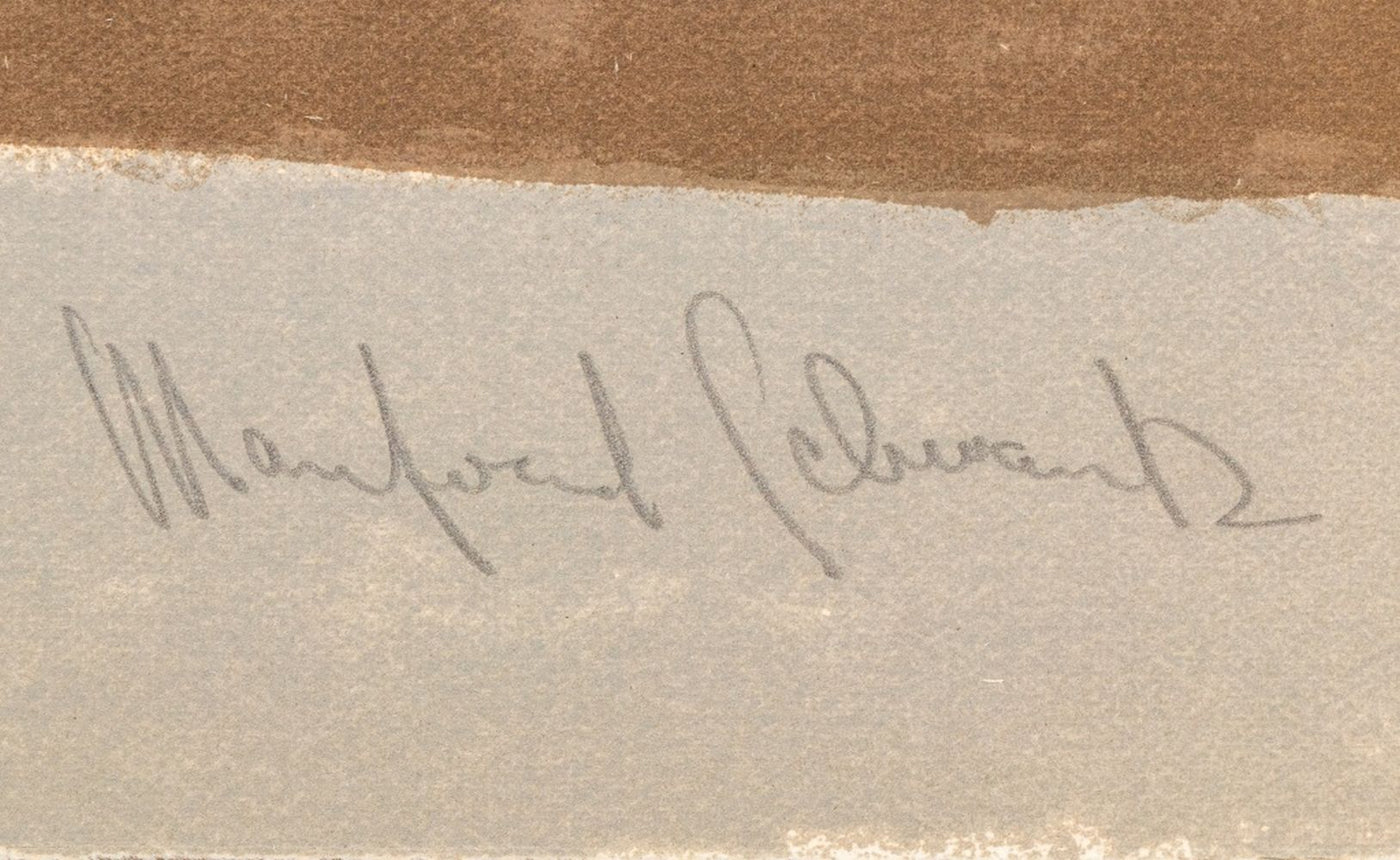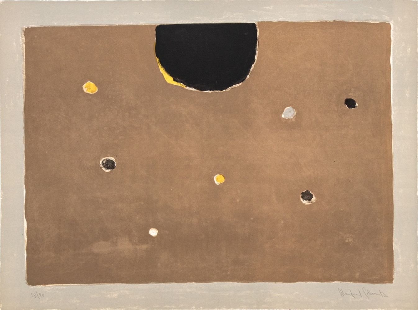 Manfred Schwartz (American, b. Poland, 1909-1970), "Somber Planet", Lithograph on Paper, mid 20th century, numbered edition "13/90" lower left, signed in pencil lower right, with the artist's signature stamped to verso, unframed. Sheet: 21.5" H x 28.25" W. Provenance: From a 35 East 75th Street Estate. Keywords: Prints, Multiples, Abstract Composition, Abstraction, Geometric, Rising Sun, Earth Tones, Polychrome, Provincetown, P-town Artist, Post-War Art