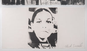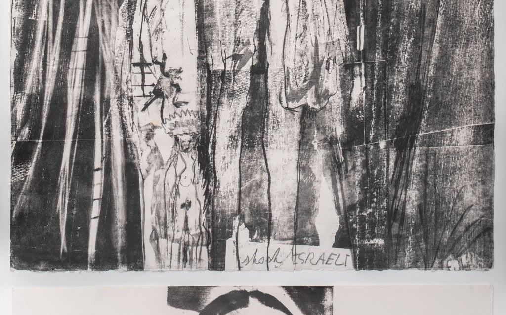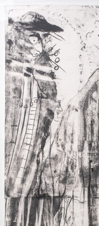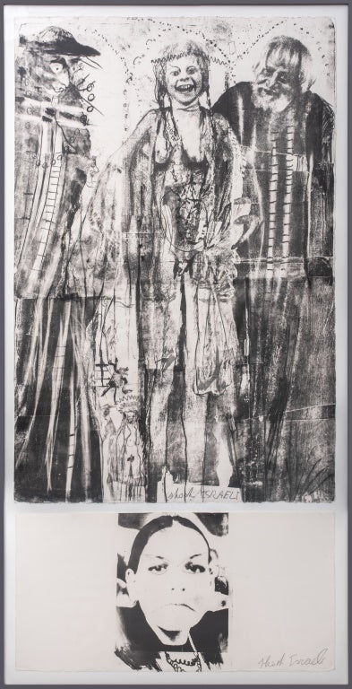 Shosh Israeli (Israeli, b. 1947), Surrealist Figural Composition, Lithograph on Paper, depicting three standing figures and a face below, signed center below and lower right, gray metal frame. Image: 62" H x 31" W; frame: 67.25" H x 34.5" W. Provenance: Property from a 900 Park Avenue Estate. Keywords: Prints, Multiples, Figurative, Surrealism, Modernist, Modernism, Women Artists, Israeli Modern Art, Contemporary Art