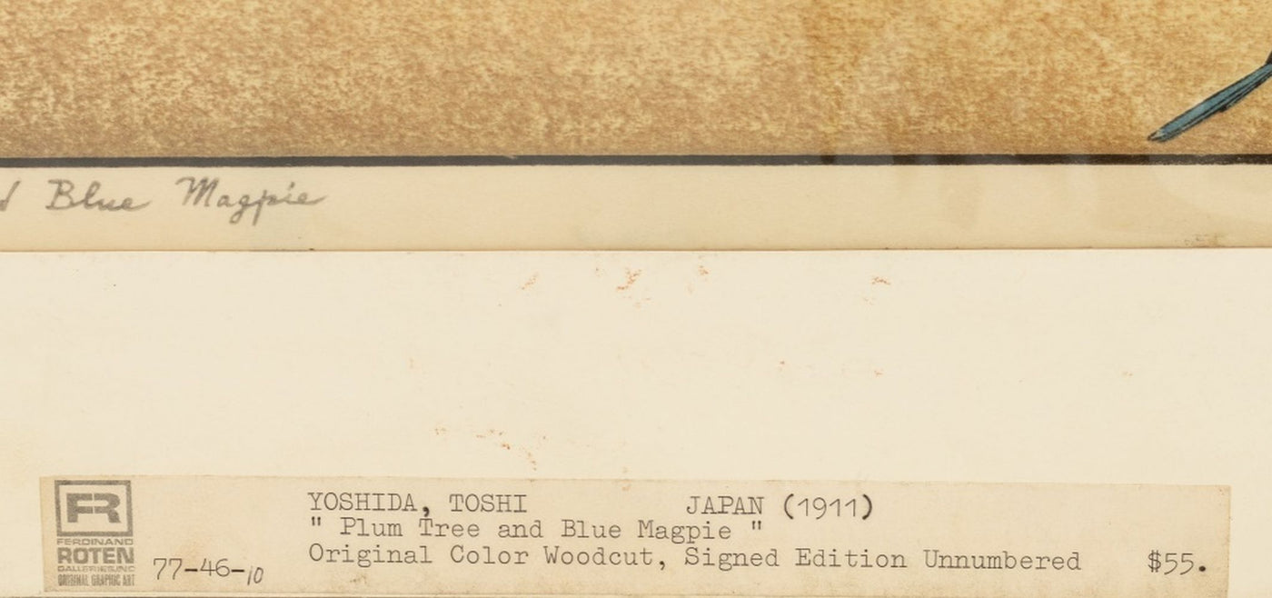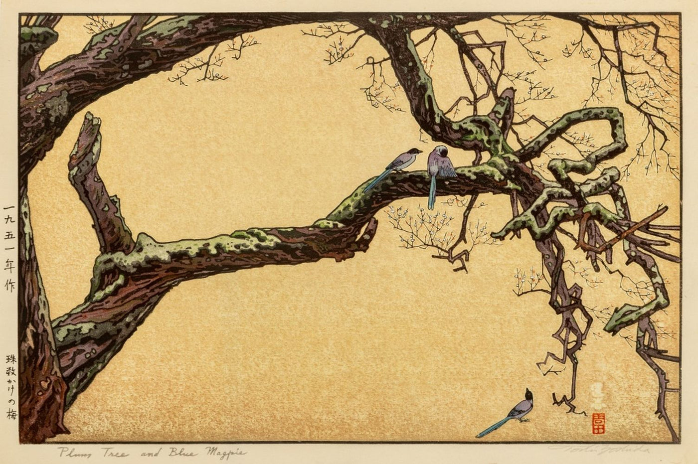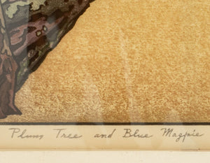Toshi Yoshida "Plum Tree and Blue Magpie" Woodcut