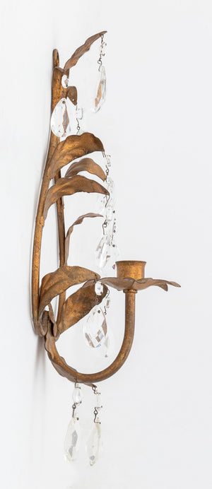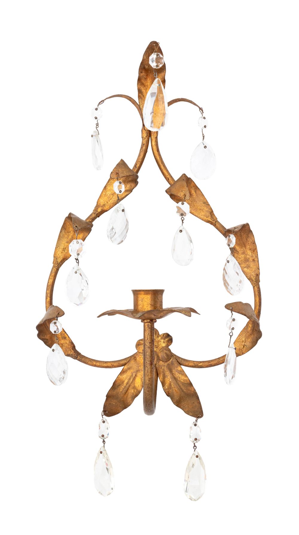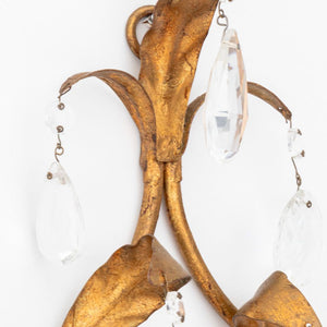 Floriform Gilt Painted Tole Applique, with faceted crystal drop pendants. 17.5" H x 8.5" W x 5.25" D. Provenance: From a New York City Collection. Keywords: Lighting, Candelabra, Candleholders, Candlesticks, Tole peinte, Wall sconces, Floral design, Flowers motif, Interior design, Decorative Arts