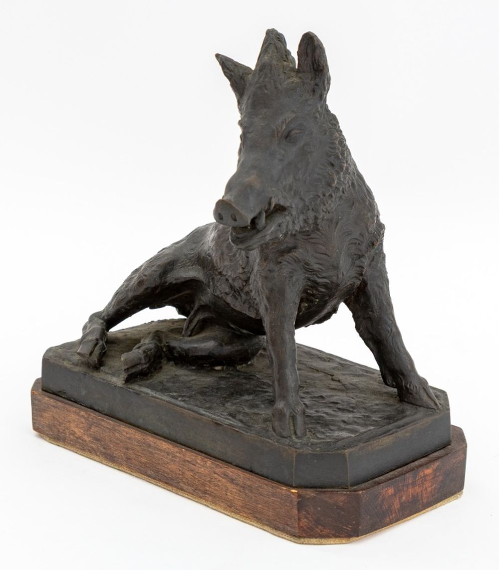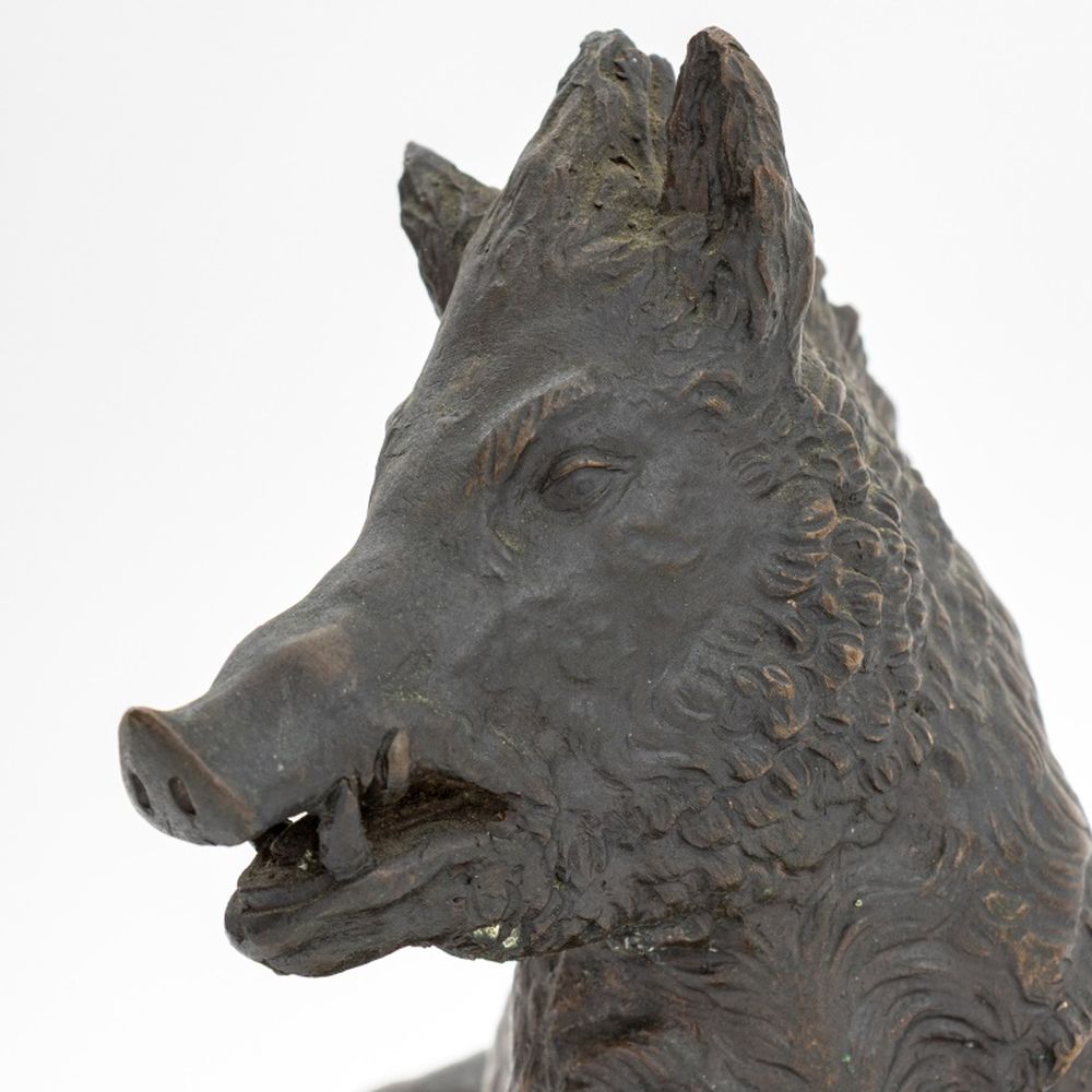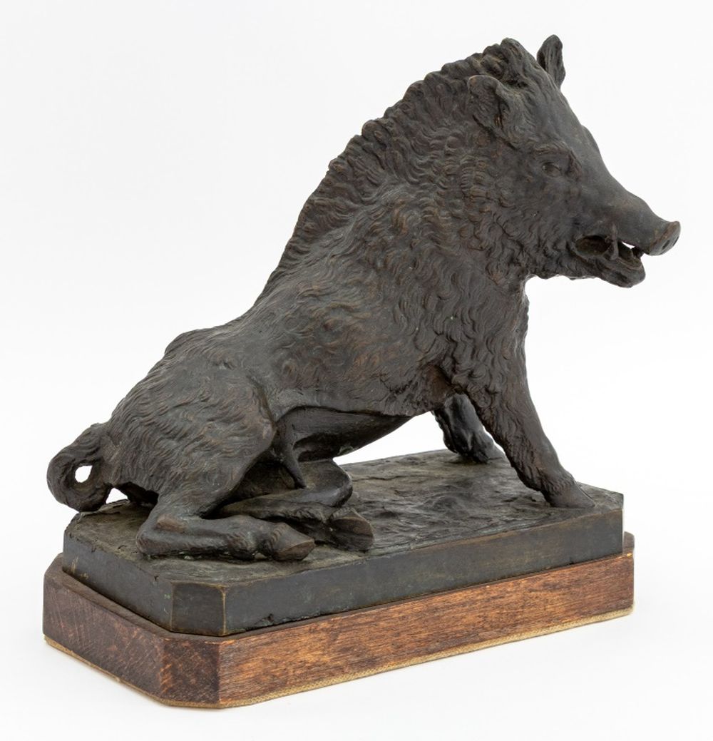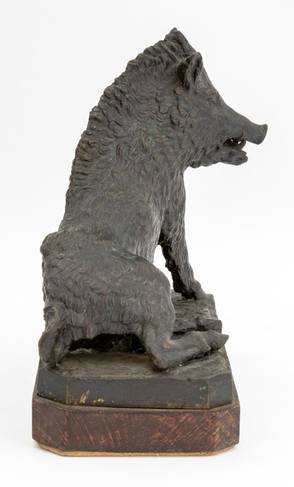 After Pietro Tacca (Italian, 1577-1640) "Il Porcellino" [The Little Pig] Patinated Bronze Sculpture, 20th century, mounted on wood base. Overall: 8.25" H x 8.25" W x 4.25" D. Provenance: From an Upper East Side Collection. Keywords: Statue, Three-dimensional, Figurine, Boar, Wild Boar, Animalier, Fountain, Baroque style, 20th Century Art, Decorative Arts
