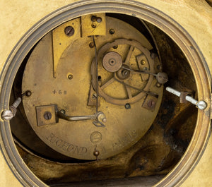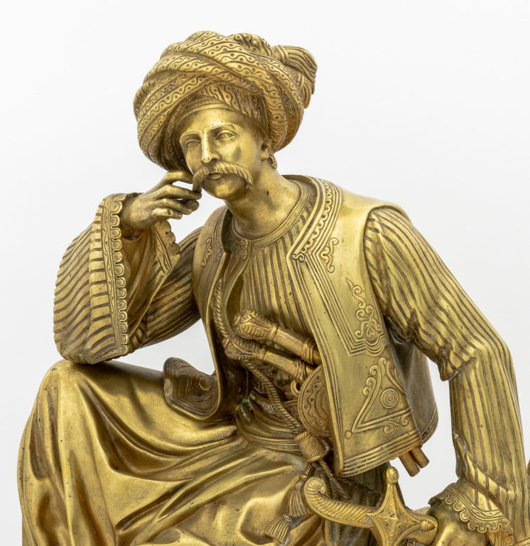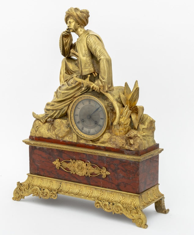 Charles X Gilt Bronze and Rouge Griotte Marble "Mamelouk" Clock, circa 1830, after the model by Louis Dupre (French, 1789-1837), surmounted by a seated figure holding a scimitar, silvered guilloche dial, the movement signed "Richond A Paris" and "Medaille D'Or 1827", strike on bell. Note: A similar clock is illustrated in Stephan Adler, "Les Heures du Philhellenisme, les pendules philhelleniques francaises," Olkos, Athens, 2018, p. 249, no. 119. Keywords: Mantel Clock, Horologe, Horology, Timepiece, Time keeping, Antique, Ormolu, Orientalist, Orientalism, Turkey, Turkish, Mameluke, French Empire, Continental, European, Decorative Arts.