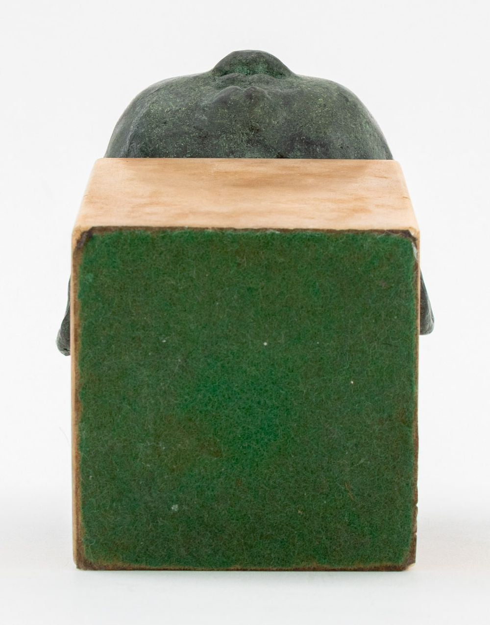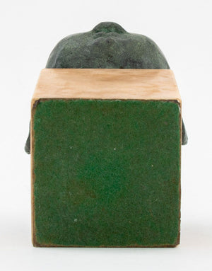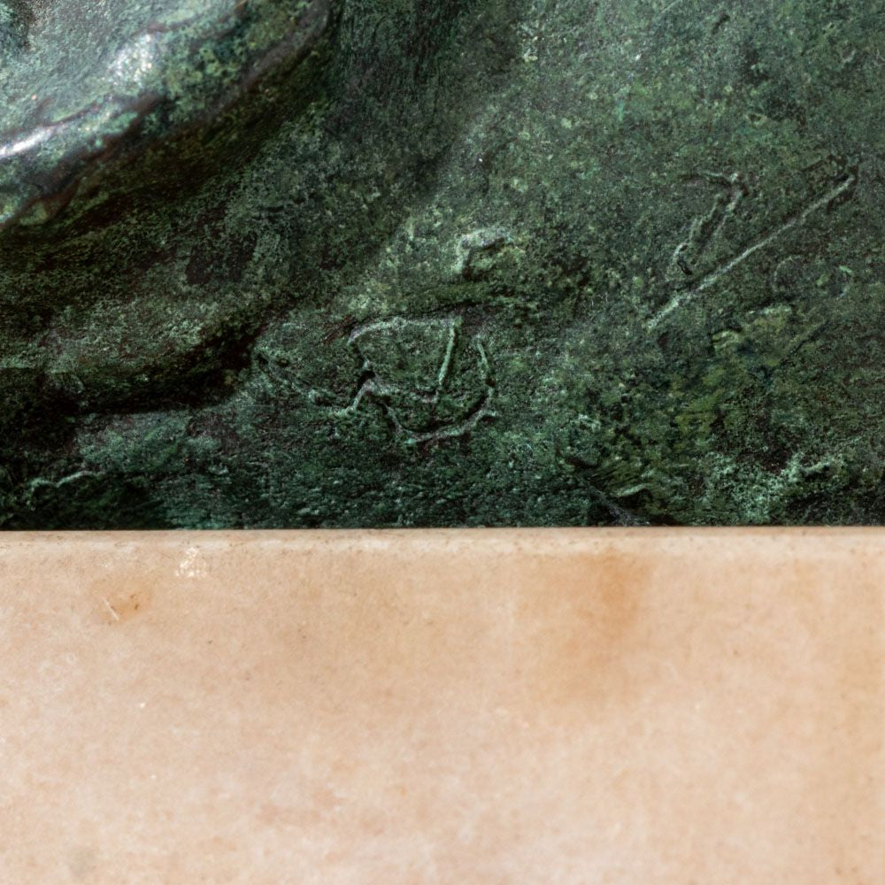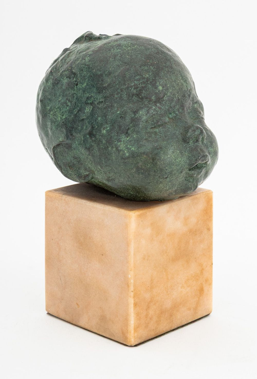 Jacob Epstein Style Sleeping Baby Verdigris Patinated Bronze Sculpture, numbered edition "1 / 8" to the underside of the head, mounted on tan marble base. Overall: 7" H x 4.5" W x 5.5" D. Provenance: The Upper East Side Estate of Anne Kaufman Schneider, the daughter of Pulitzer Prize-winning playwright George S. Kaufman. Keywords: Statue, Bust, Head, Metalwork, Realism, French artist, Aime Jules Dalou, Child, Infant, Newborn, Decorative Arts