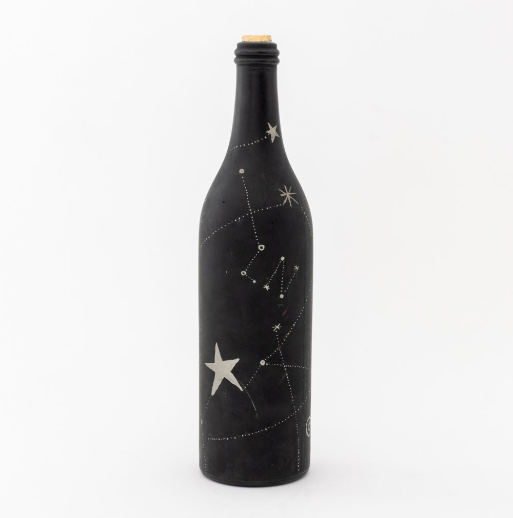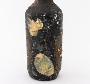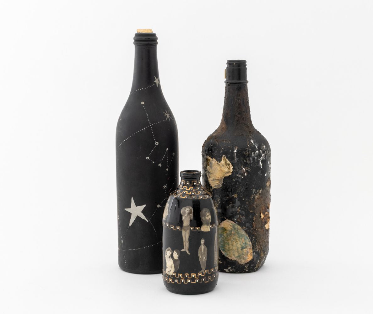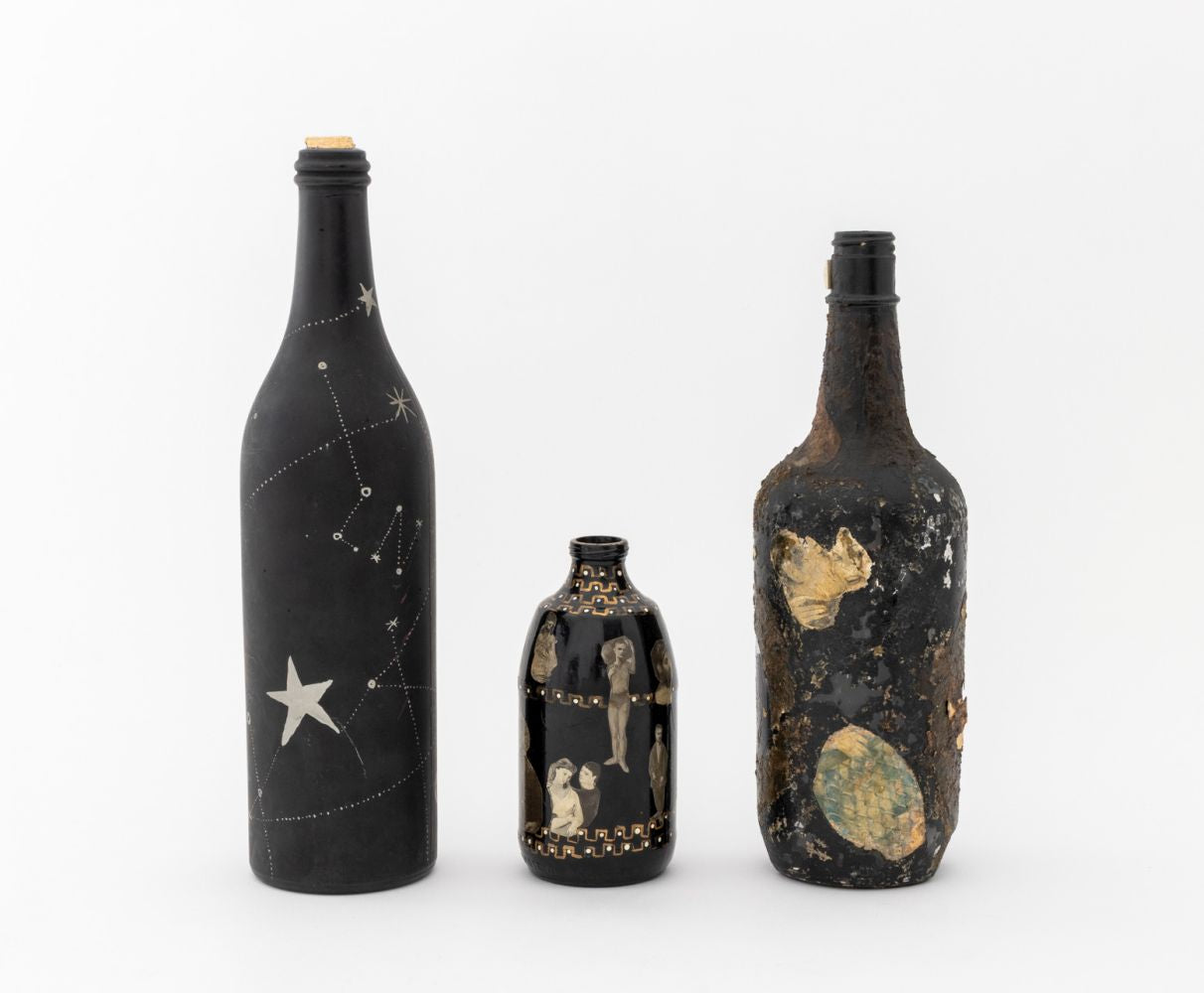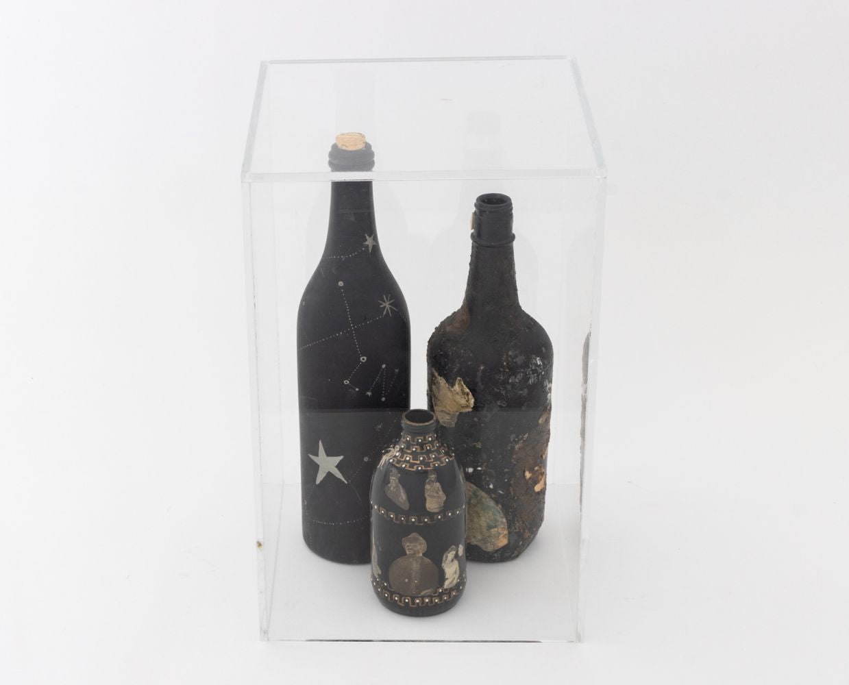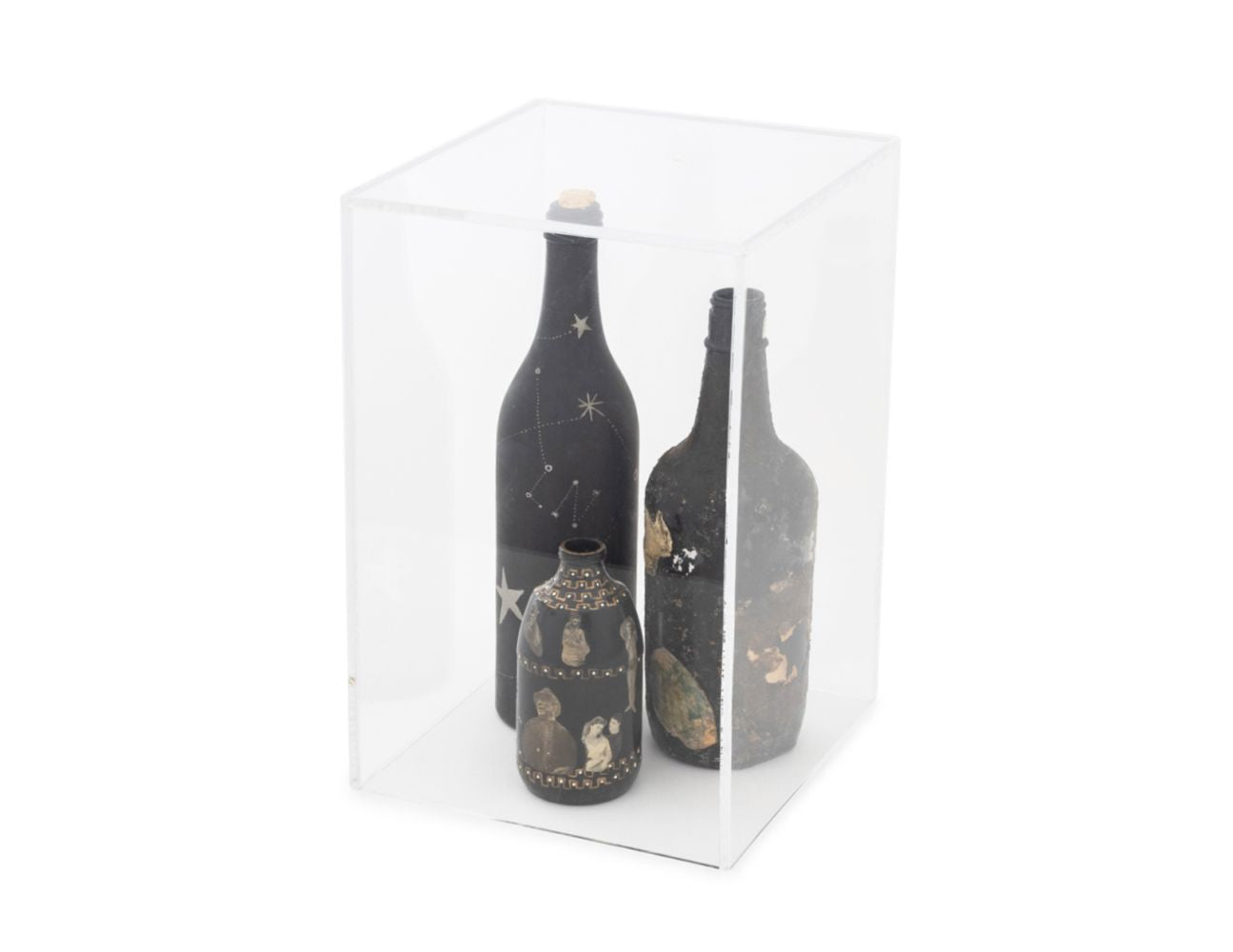 Collection of Three Painted and Collage Glass Bottles, comprising: small bottle with gold painted accents, 1977, signed "HA" and dated to the underside, one bottle with silver-painted constellations, and one bottle with textured collage, "Laurence Vail" label to the underside, each with Stamford Auction label, with acrylic display case.