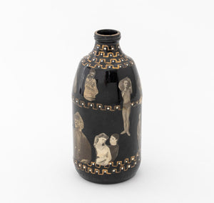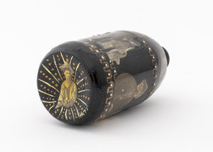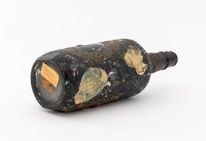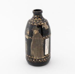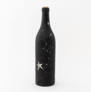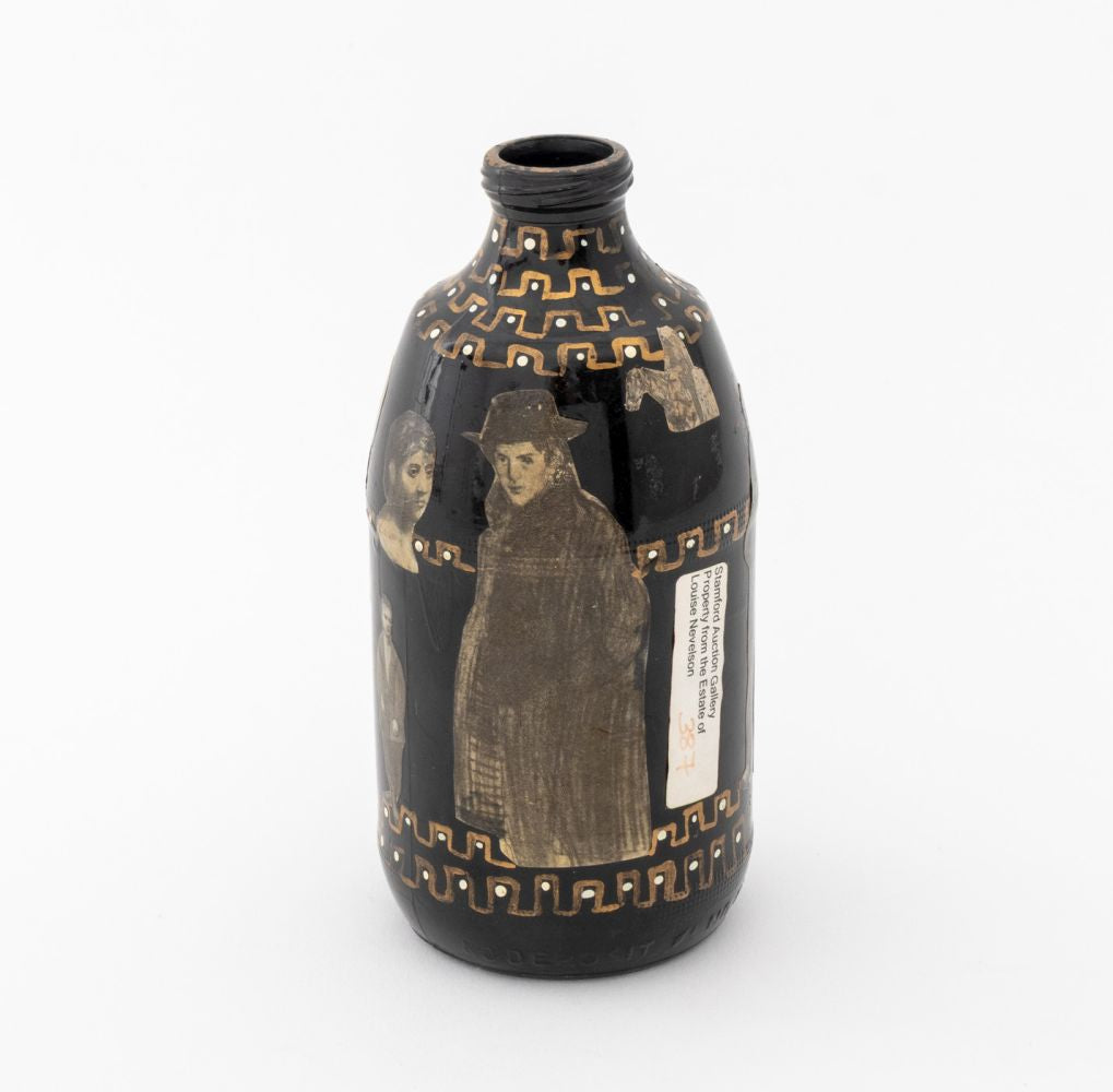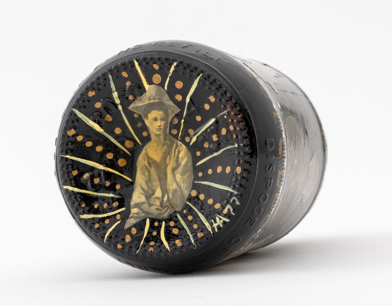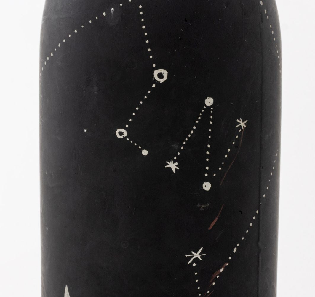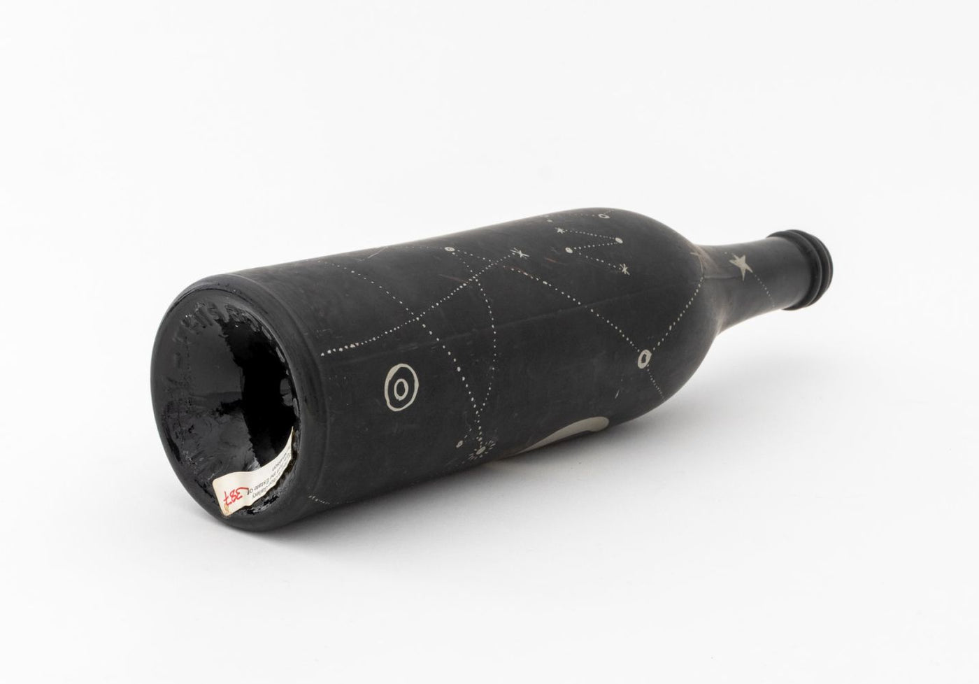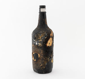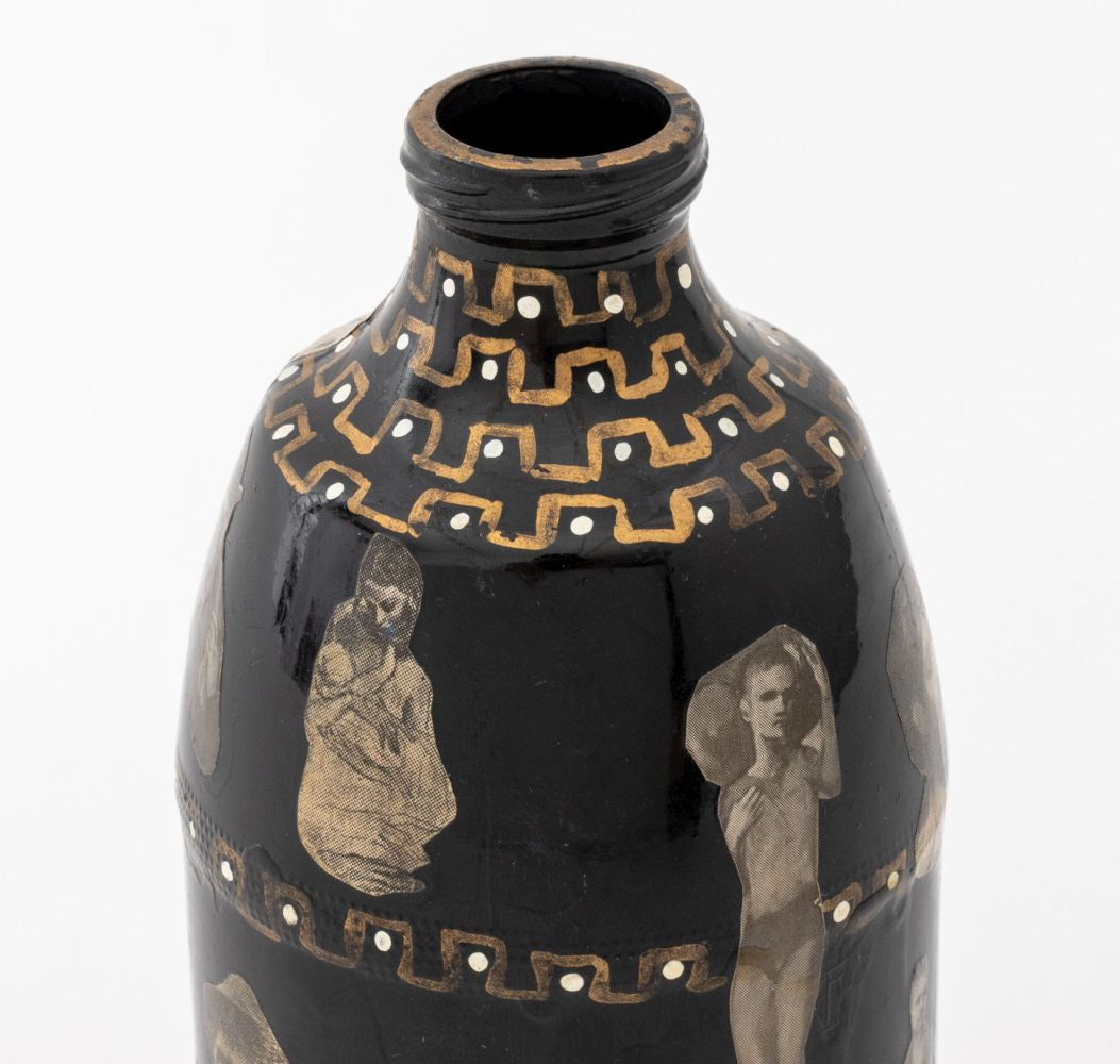 Collection of Three Painted and Collage Glass Bottles, comprising: small bottle with gold painted accents, 1977, signed "HA" and dated to the underside, one bottle with silver-painted constellations, and one bottle with textured collage, "Laurence Vail" label to the underside, each with Stamford Auction label, with acrylic display case.