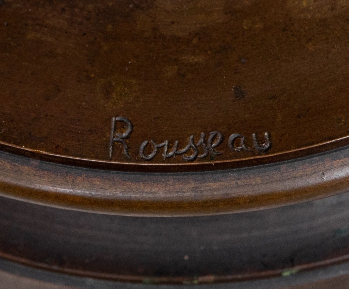 Victor Rousseau (Belgian, 1865-1954) "Cupid", Patinated Bronze Sculpture, early 20th century, the standing draped figure blowing a kiss, on a circular plinth, signed. 26" H x 8.5" W x 8.5" D. Keywords: Belgian Art, Neoclassical, Statue, Bronzier, Love, Cherub, Putti, Winged, Child, Continental School, Decorative Arts