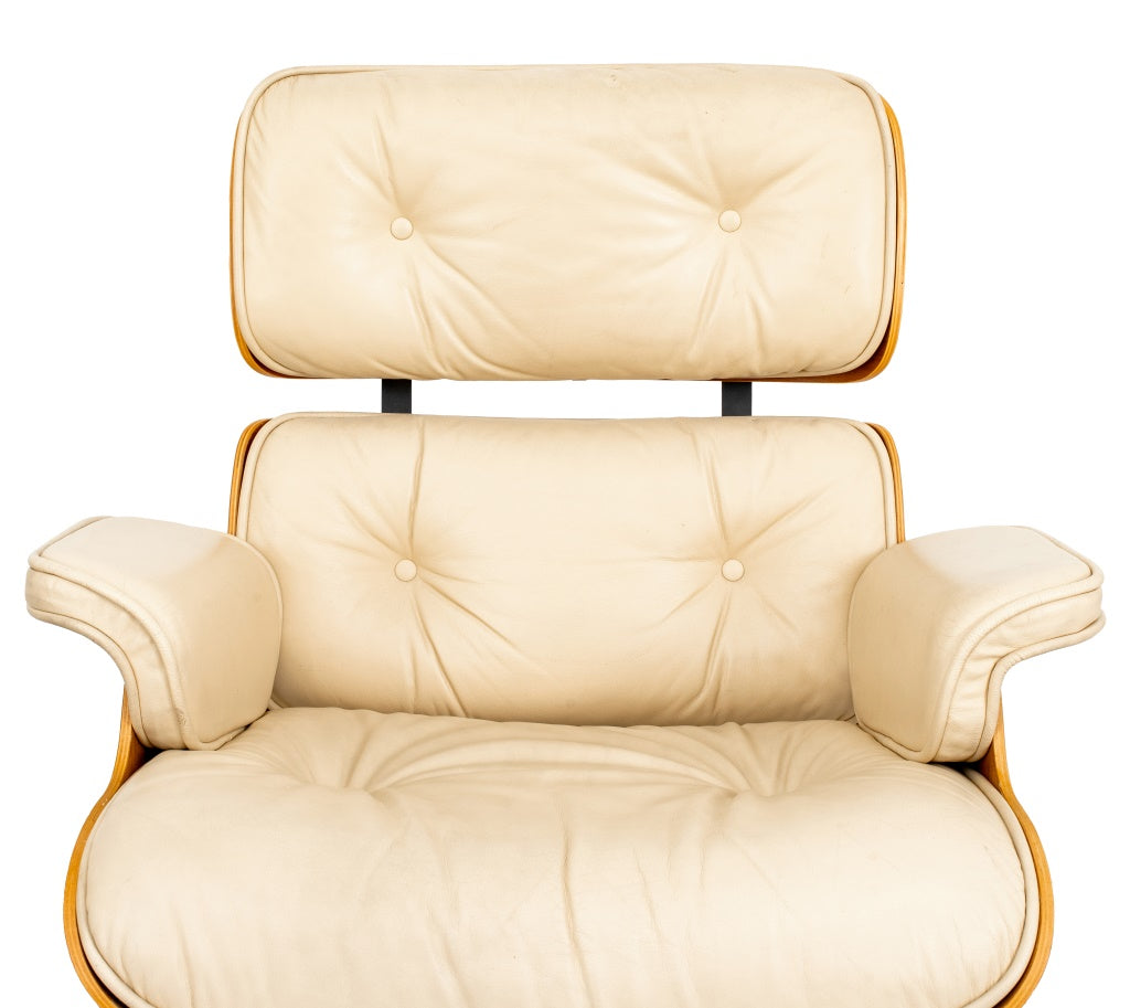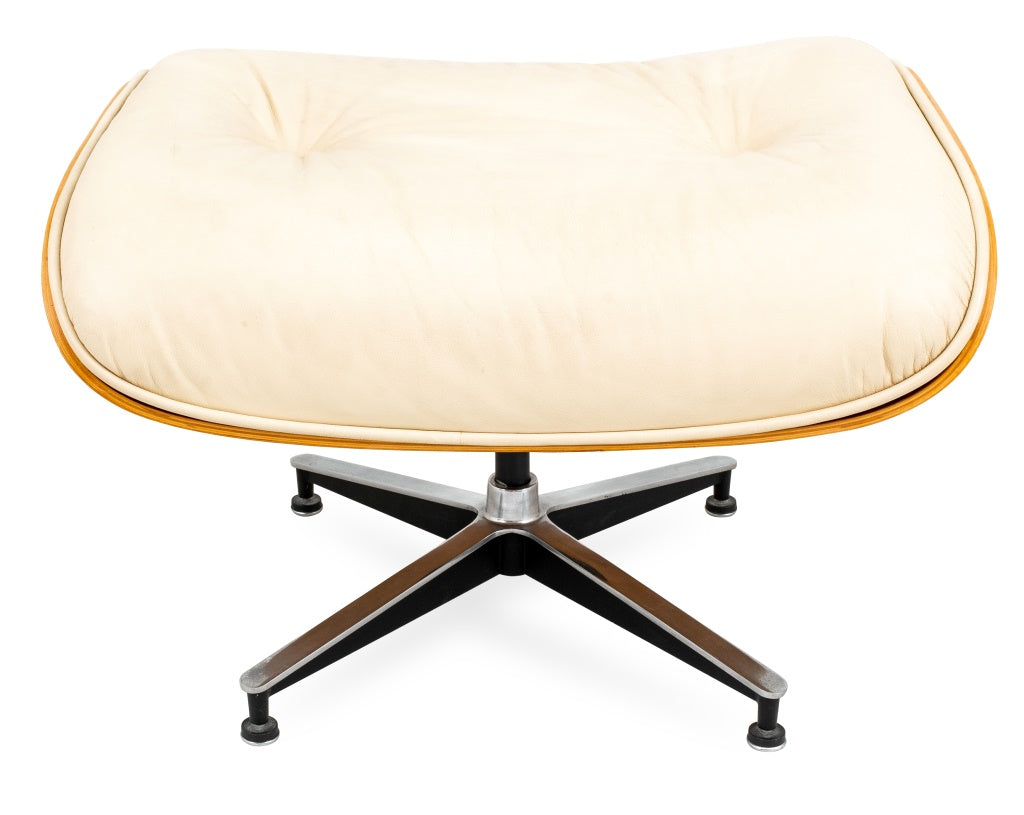 Eames Style Bentwood Swivel Lounge Chair and Ottoman, covered in beige leather, the chair on five leg aluminum base and ottoman on four leg aluminum base. Dimensions:  Chair: 33" H x 32" W x 26" D; seat: 16" H. Ottoman: 16.75" H x 25" W x 21" D.