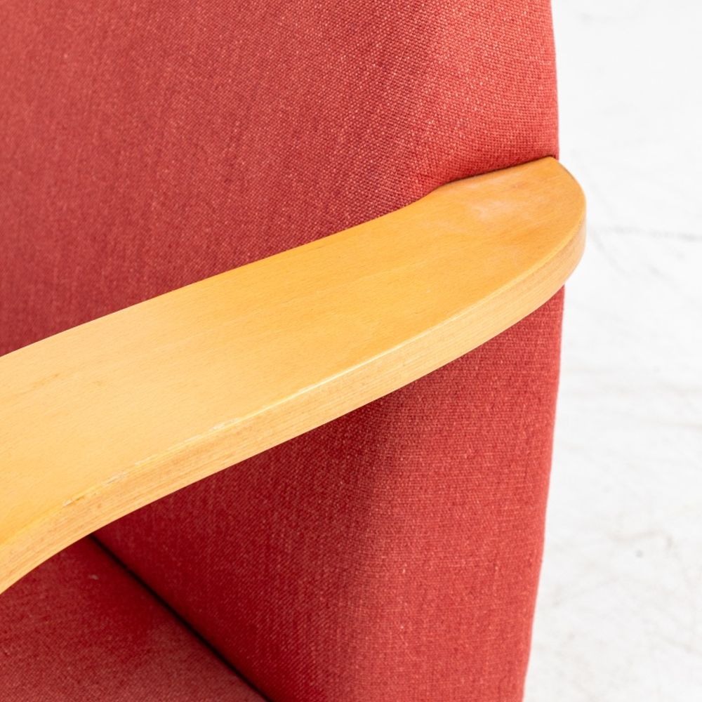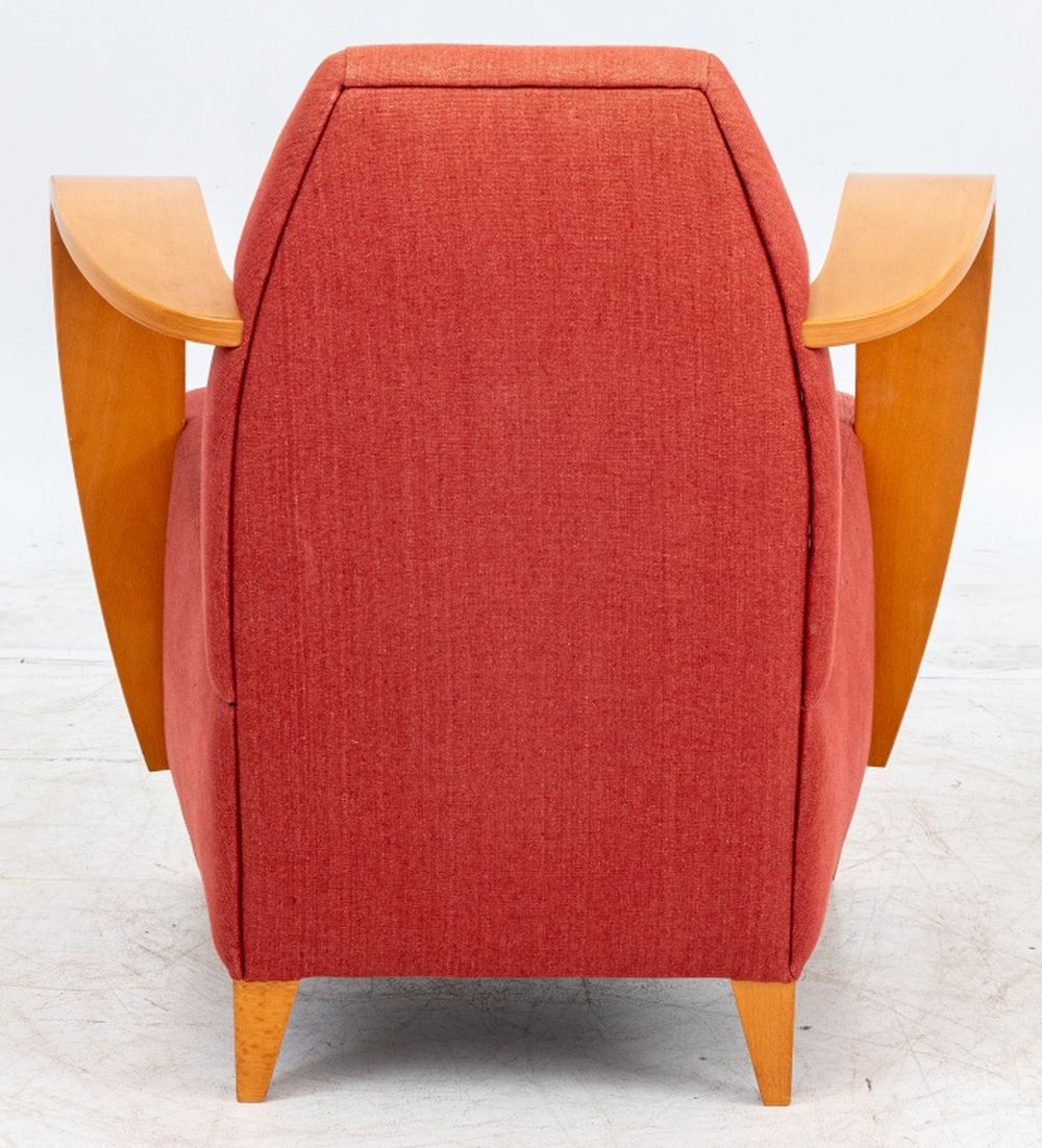 Mid-Century Modern Style Bentwood Club Chair, red upholstery, wide arms. 31.5" H x 27.5" W x 25.5" D; seat: 16.5" H; armrest: 25.75" H. Provenance: From a 20 East 74th Street Estate. Keywords: Modern Furniture, Armchair, Arm chair, Lounge chair, Seating, MCM Style, Retro, Interior design, Decorative Arts