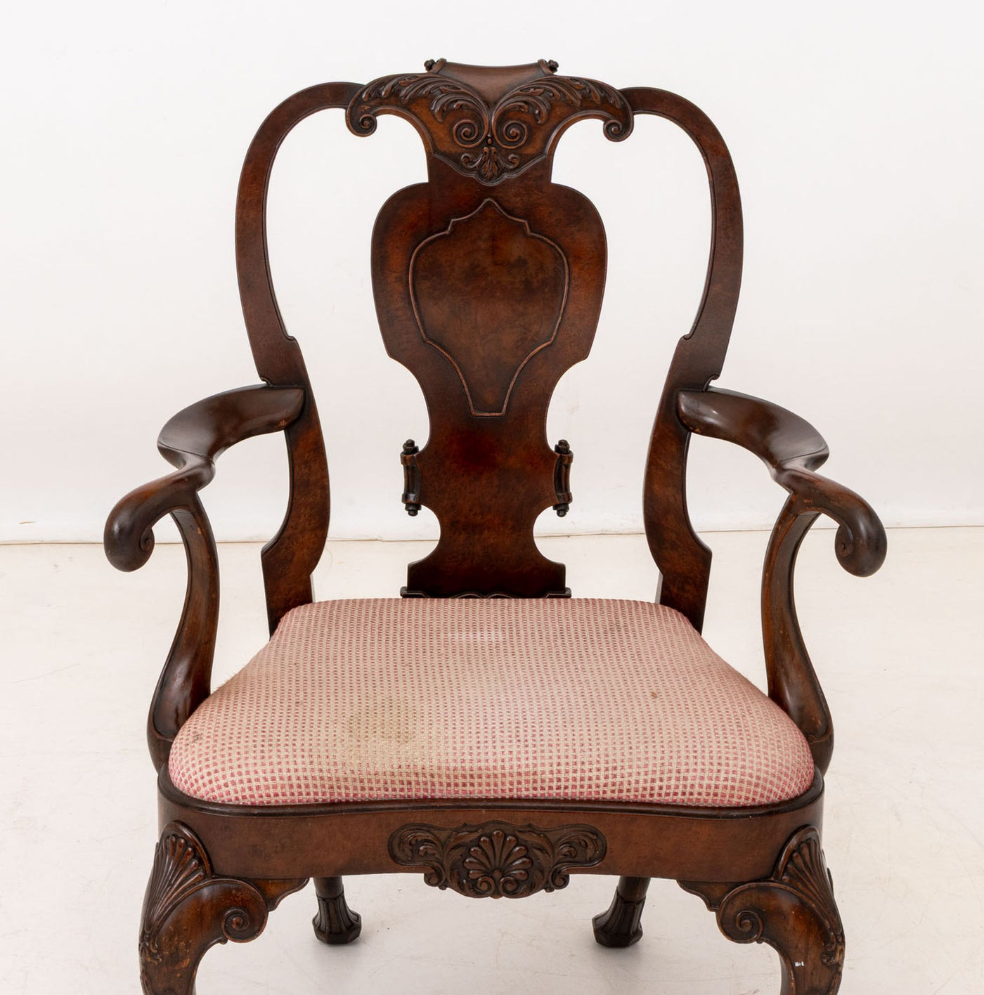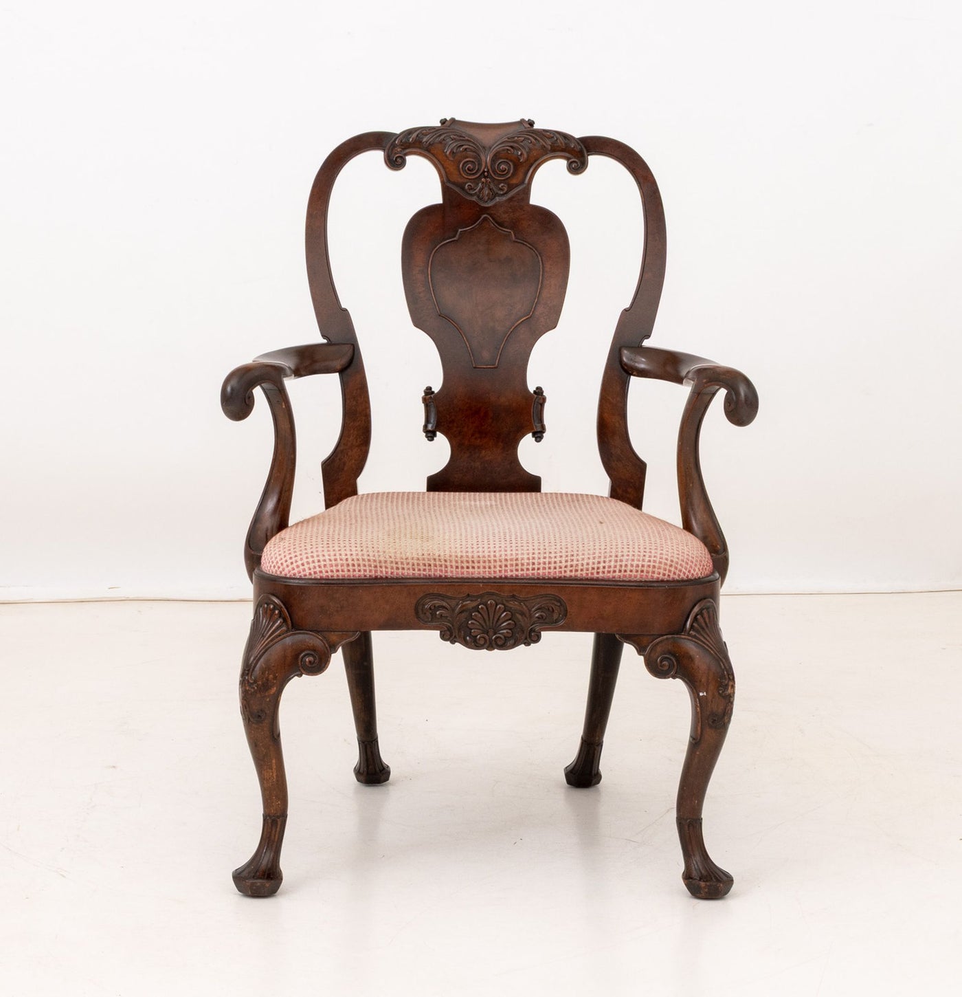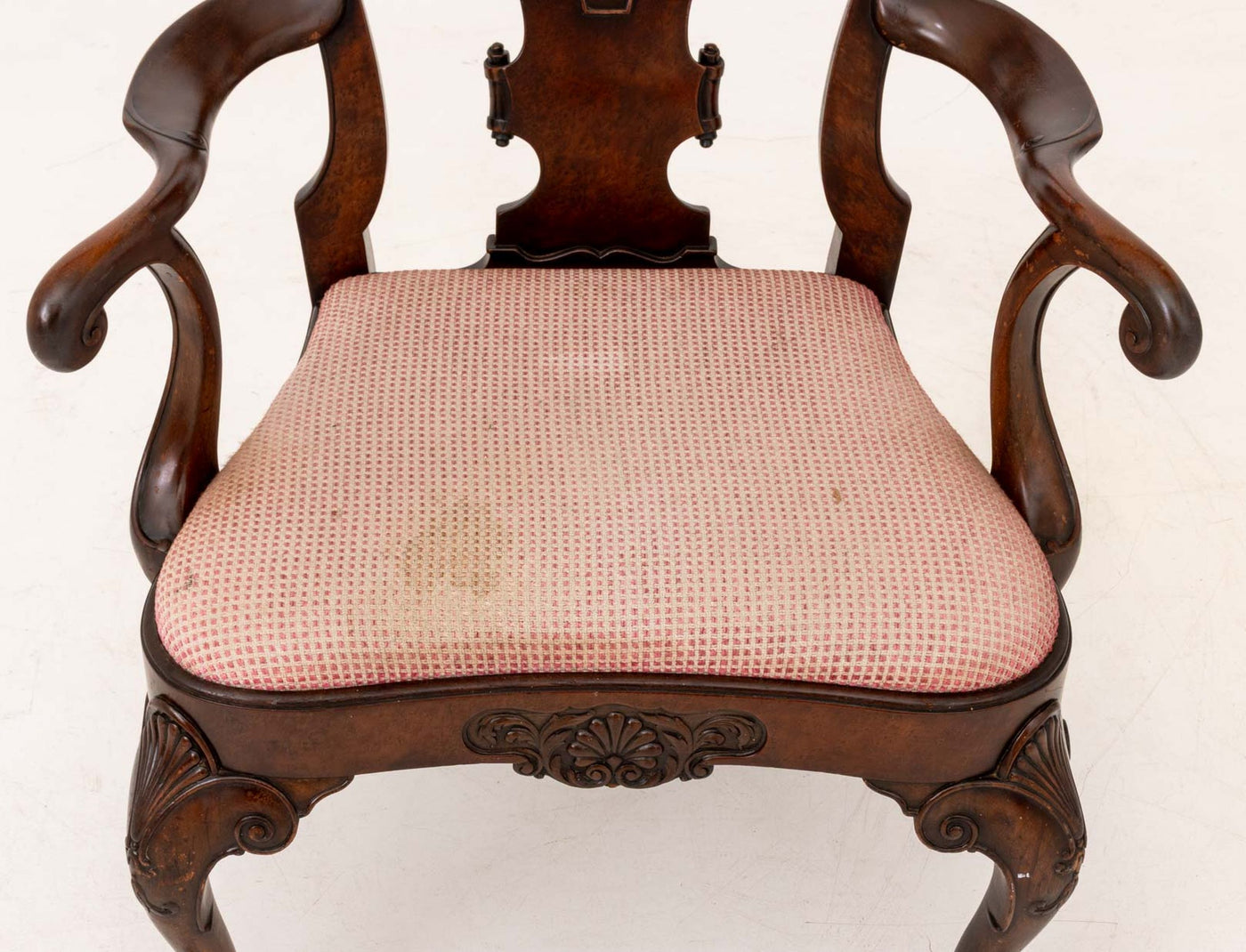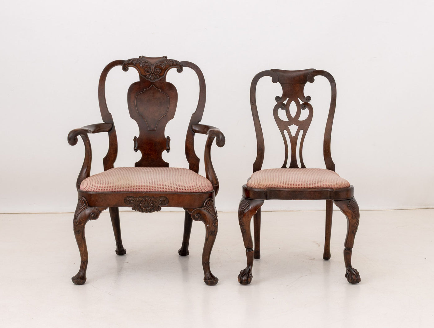Associated Pair of Queen Anne Style Mahogany Chairs, one armchair and one side chair on cabriole legs terminating in ball and claw feet, each with checkerboard upholstered seat.