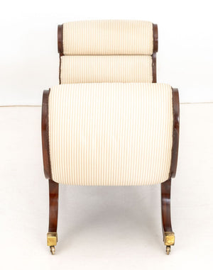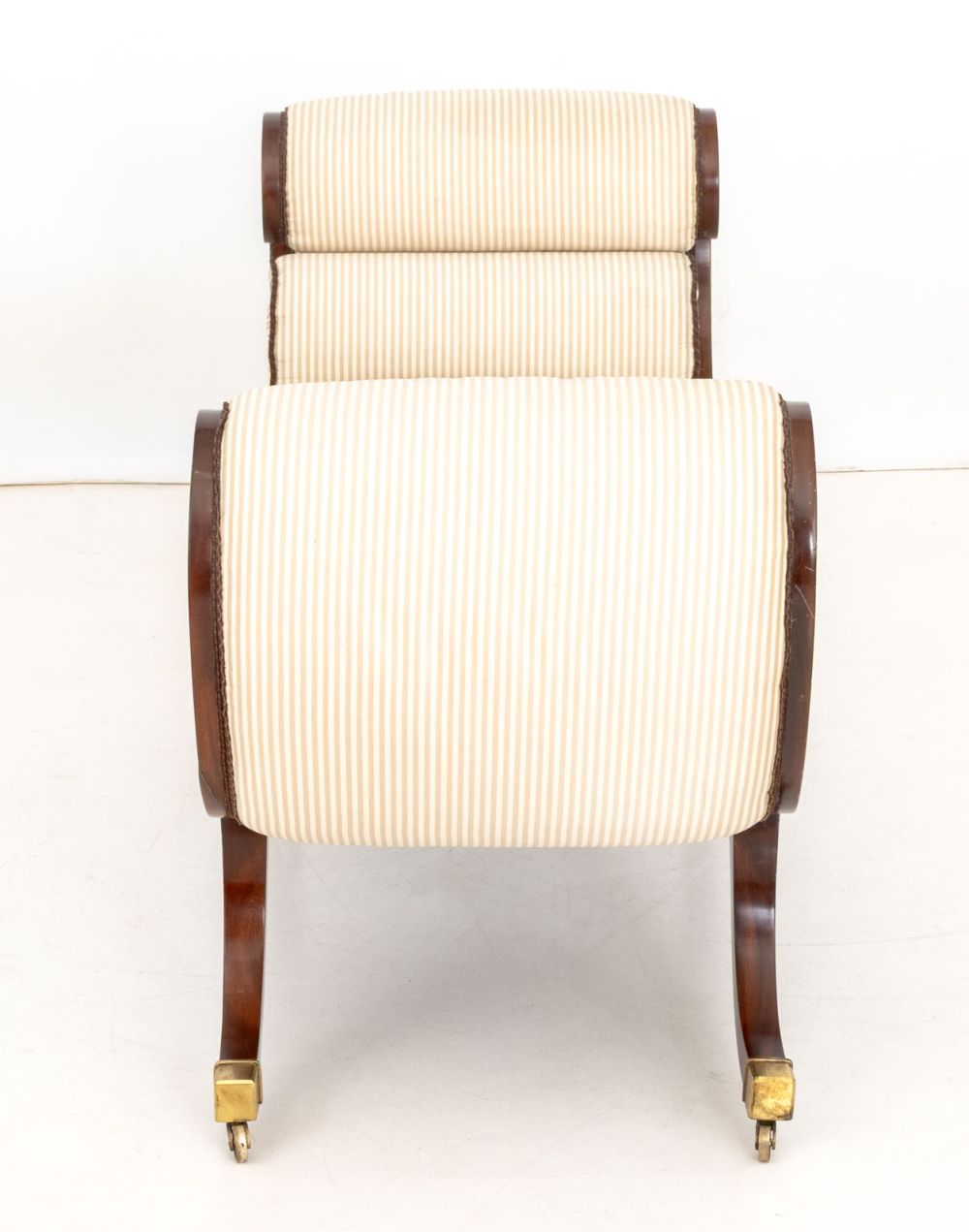 Regency Style Painted Mahogany Chaise Lounge, scrolled ends with painted floral design, striped upholstery, on brass casters. 27" H x 56" W x 20" D. Provenance: From a 955 Fifth Avenue Apartment. Keywords: Furniture, Seating, Recamier, Daybed, Sofa, Bench seat, English Style, British, Neoclassical, interior design, Decorative Arts