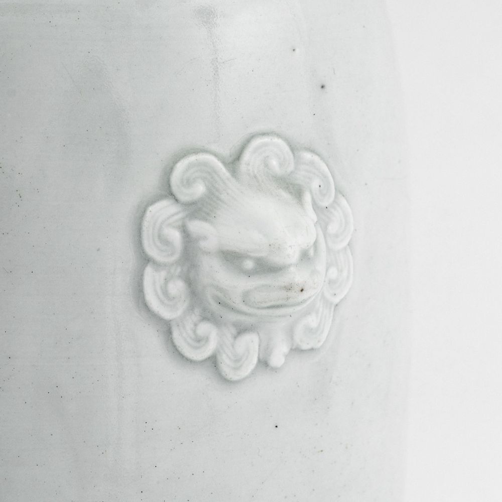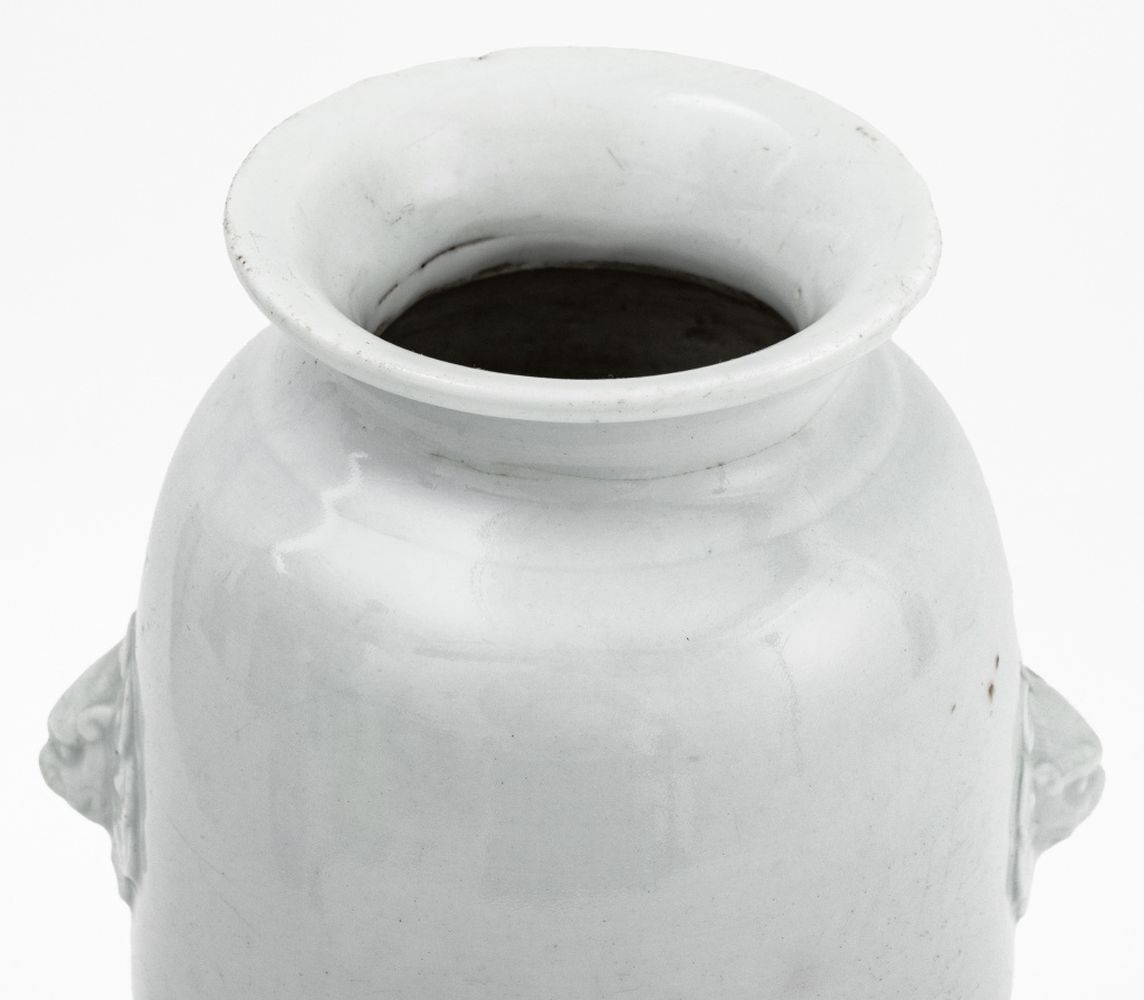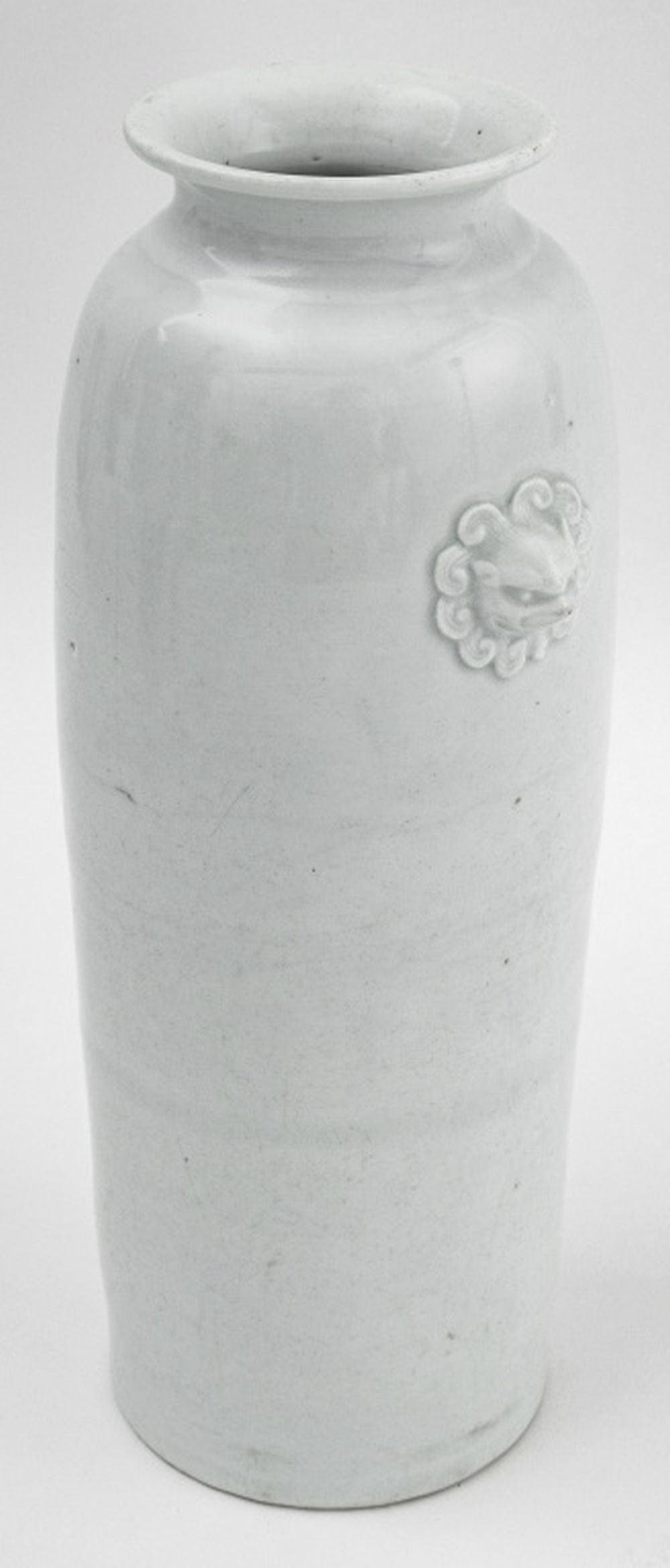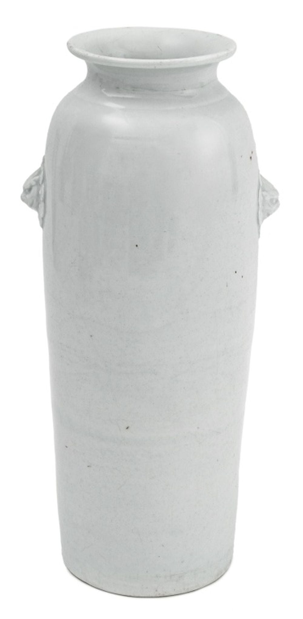 Chinese Blanc de Chine Porcelain Sleeve Vase, 18th century, with two mask form handles. 10.25" H 4.25" W x 4" D. Provenance: From a 35 East 75th Street Estate. Keywords: Asian Arts, China, Ceramics, Pottery, White glazed, Light Celadon, Vessel, Flower holder, 1700s, Antique, Decorative Arts