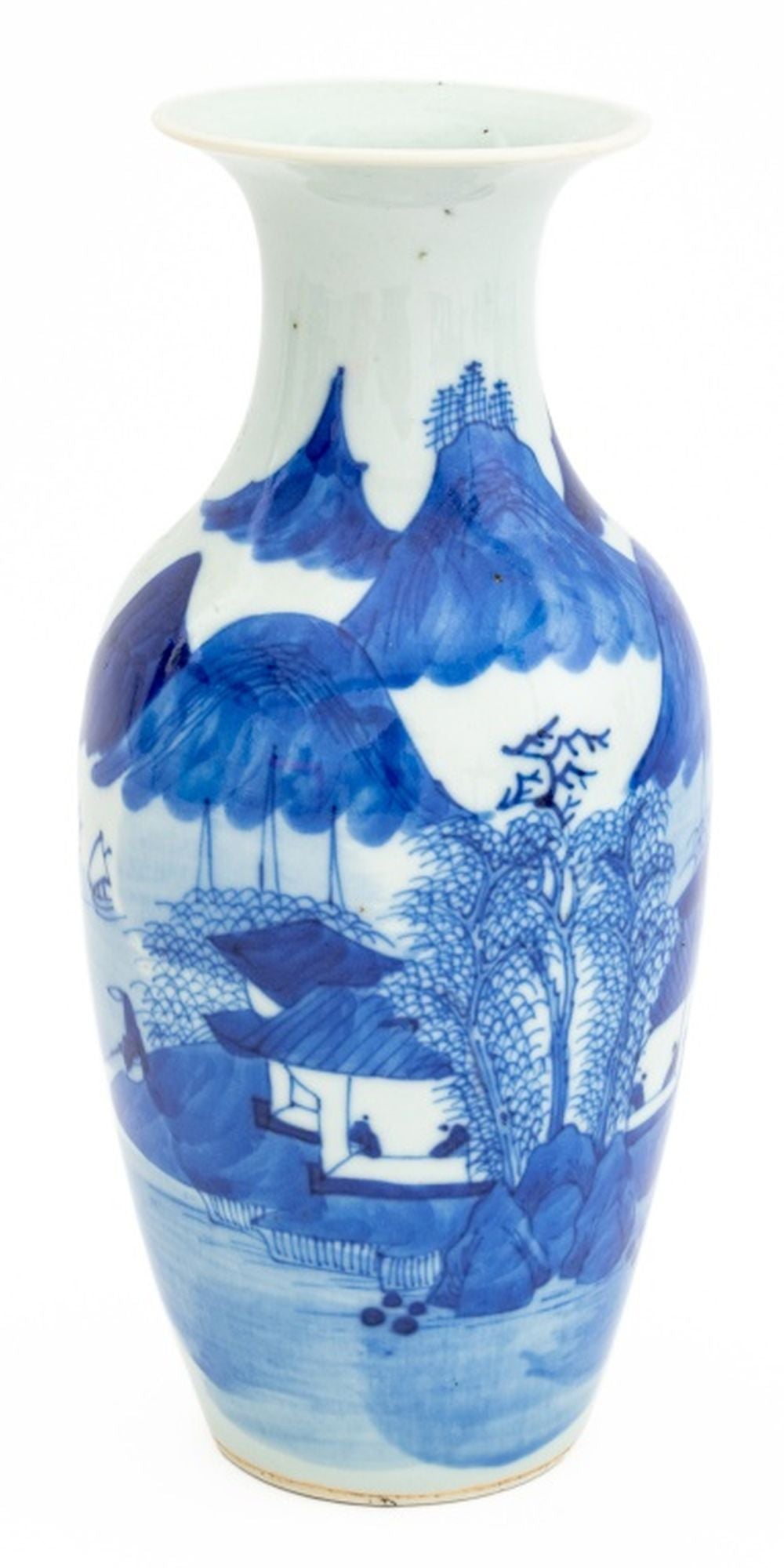 Collection of Five Chinese Blue and White Porcelain Vessels, comprising: crackle glazed bud vase with landscape scene and silver mounted rim, ovoid vase with landscape, square tapered vase with animal head handles and mountain landscape, baluster vase with figural fishing scene, and brush pot with figural courtyard scene. Silver tested. Largest: 10.25" H x 4.5" Diameter. Provenance: From an East 72nd Street Estate. Keywords: Asian Arts, China, Ceramics, Jars, Vessels, Flower holder, Cobalt blue decoration, Decorative Arts