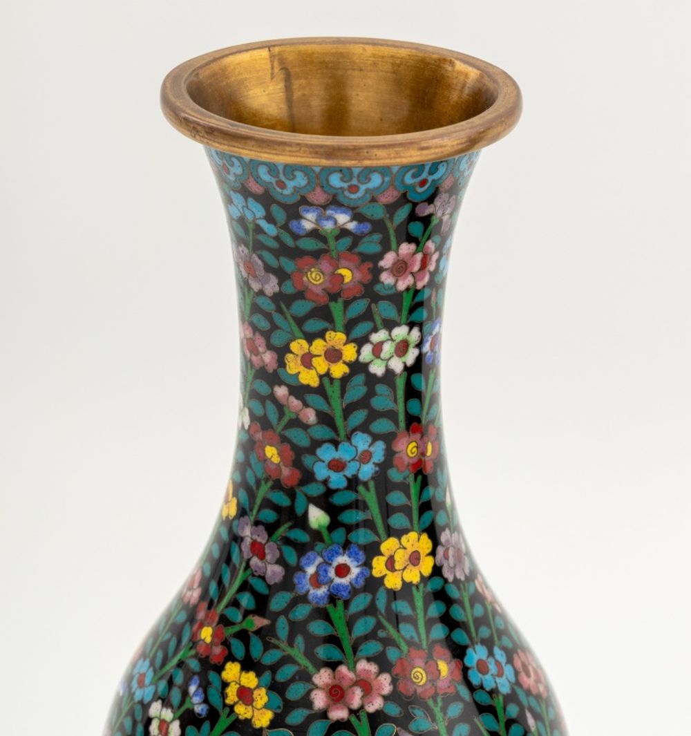 Pair of Chinese Cloisonne Floral Design Vases, polychrome flowers and vines on black grounds, each on carved wood base. Vase: 8" H x 3.5" Diameter. Provenance: From an East 72nd Street Estate. Keywords: Asian Art, China, Enamel, Blooms, Bouquet, Bud Vase, Interior design, Decorative Arts