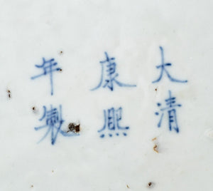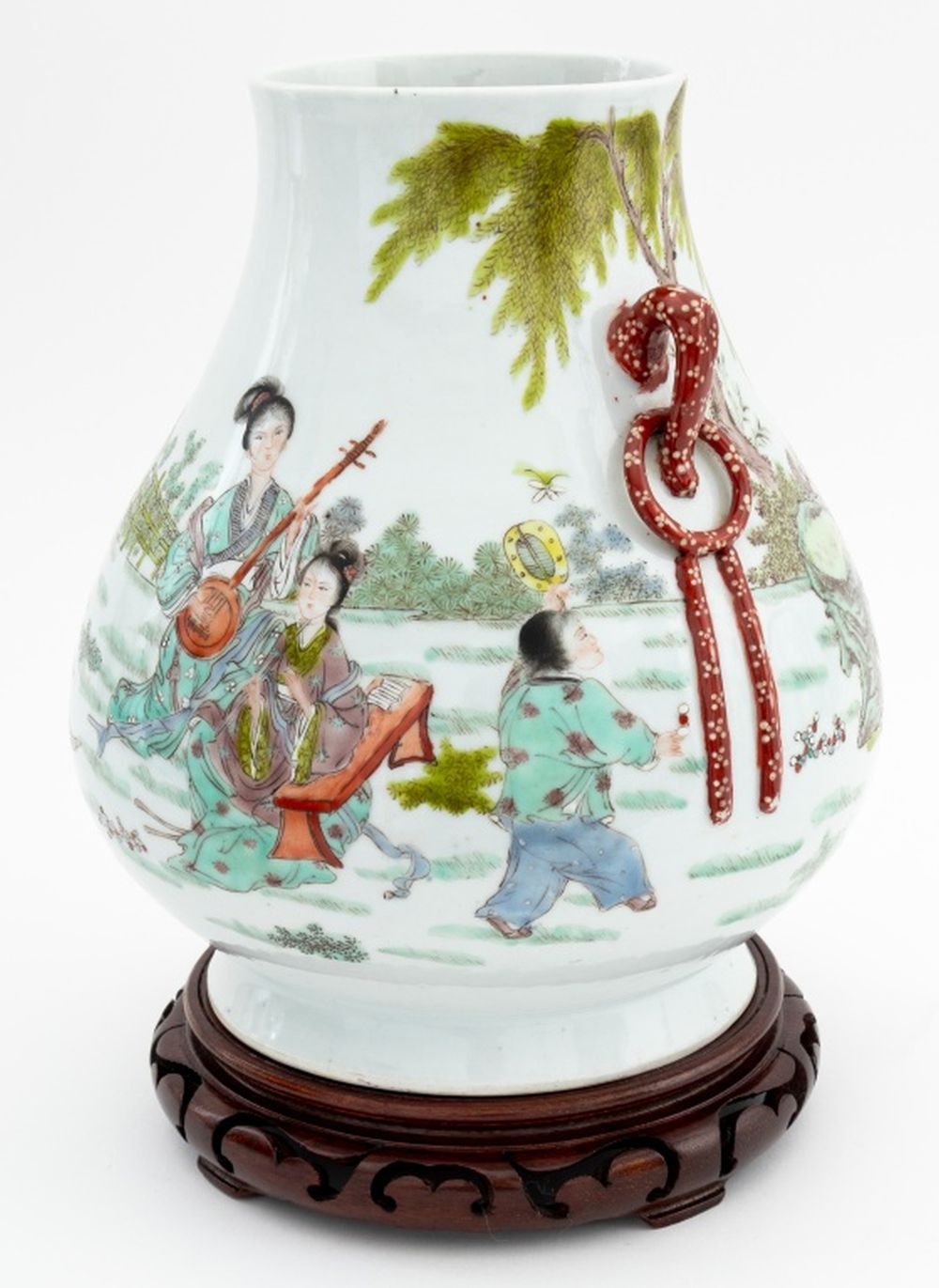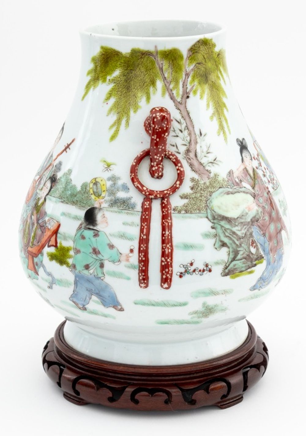 Chinese Famille Verte Porcelain Hu Vase, hand-enameled with courtly landscape and with two applied loop form handles, blue underglaze six character mark to underside, together with carved wood stand. Vase: 10.5" H x 9.5" Diameter. Provenance: From a Fifth Avenue Collection. Keywords: Asian Arts, China, Ceramics, Vessel, Hand-painted, Figural, Figurative, Lady, Beauty, Musician, Qing Dynasty, Antique, Decorative Arts