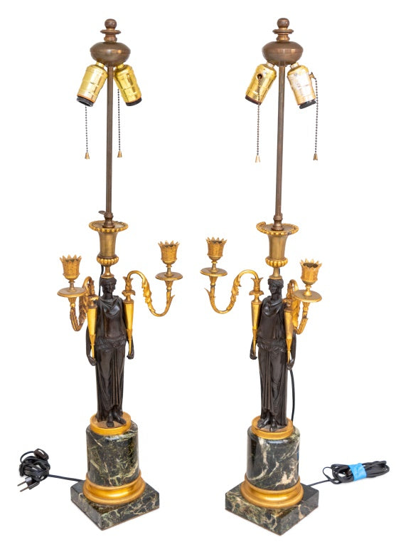Pair of Restauration Bronze Figural Candelabra Lamps