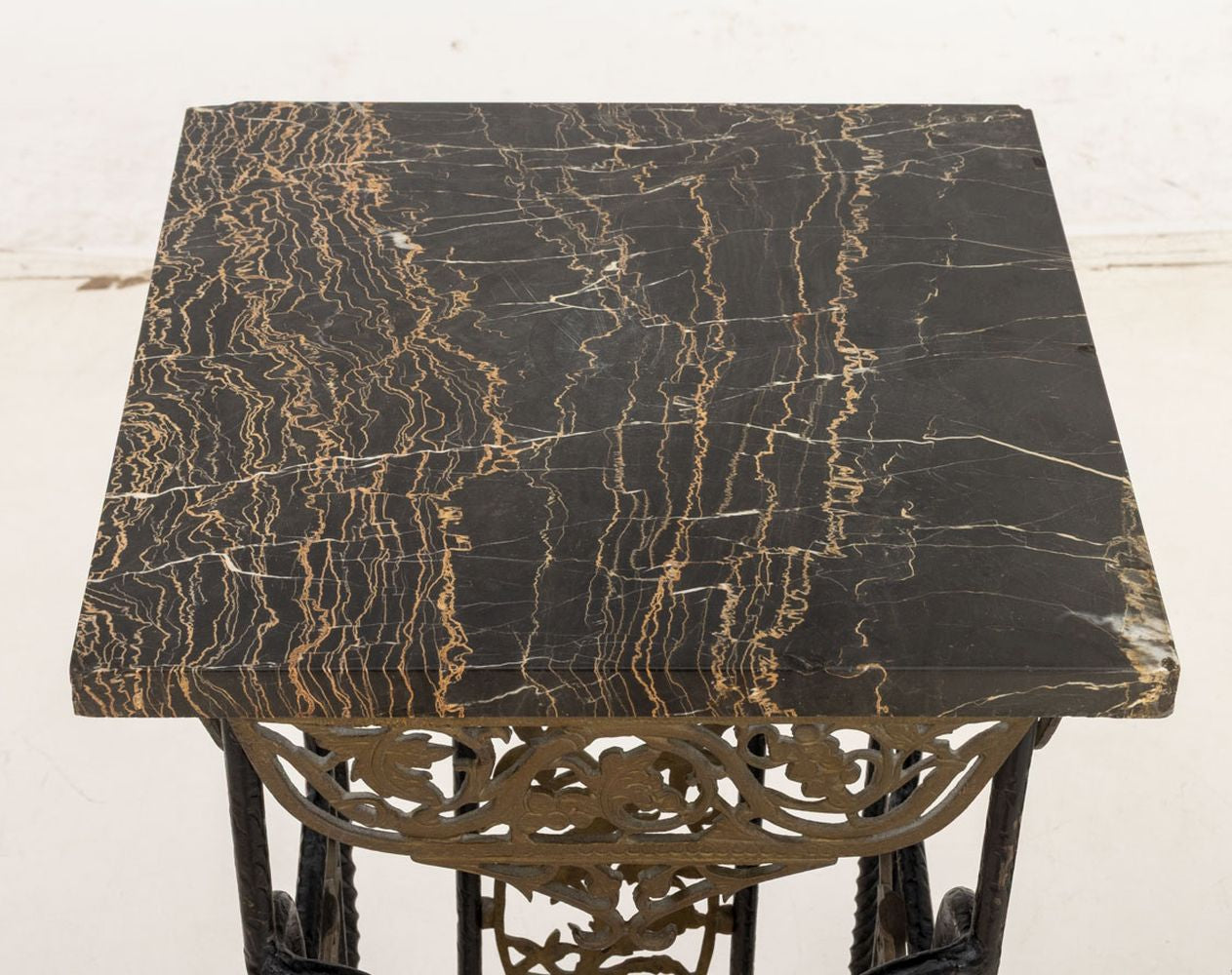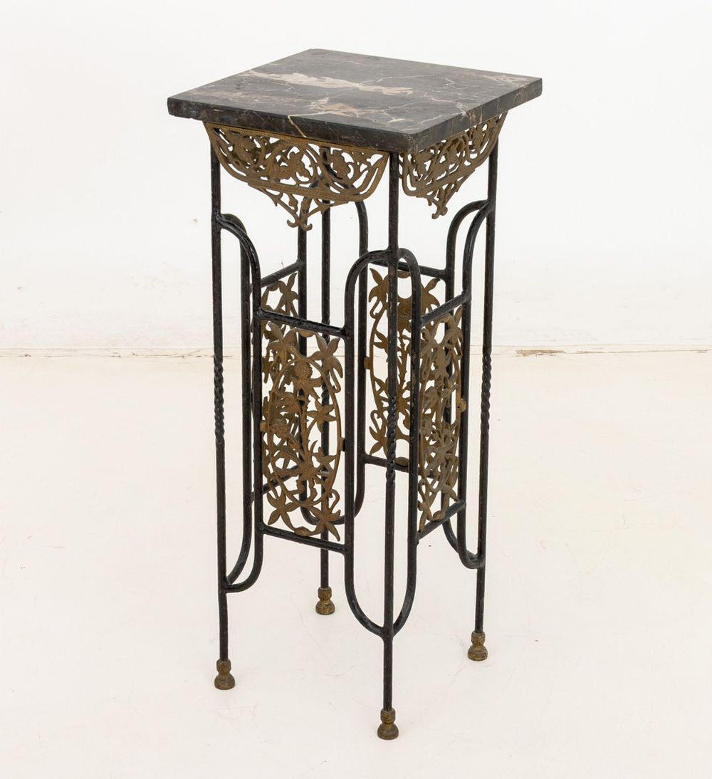 Pair of Wrought Iron Marble Top Pedestals in the Style of Edgar Brandt, with square nero portoro marble tops above pierced brass floral panel and four twist form legs on circular feet. 34" H x 14" W x 14" D. Provenance: From a Cobble Hill, Brooklyn Collection. Keywords: European Furniture Furniture, Side table, Display table, Plant stand, Metalwork, Occasional table, Continental, Interior design, Decorative Arts