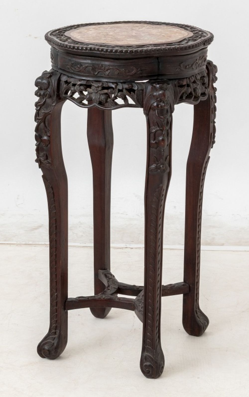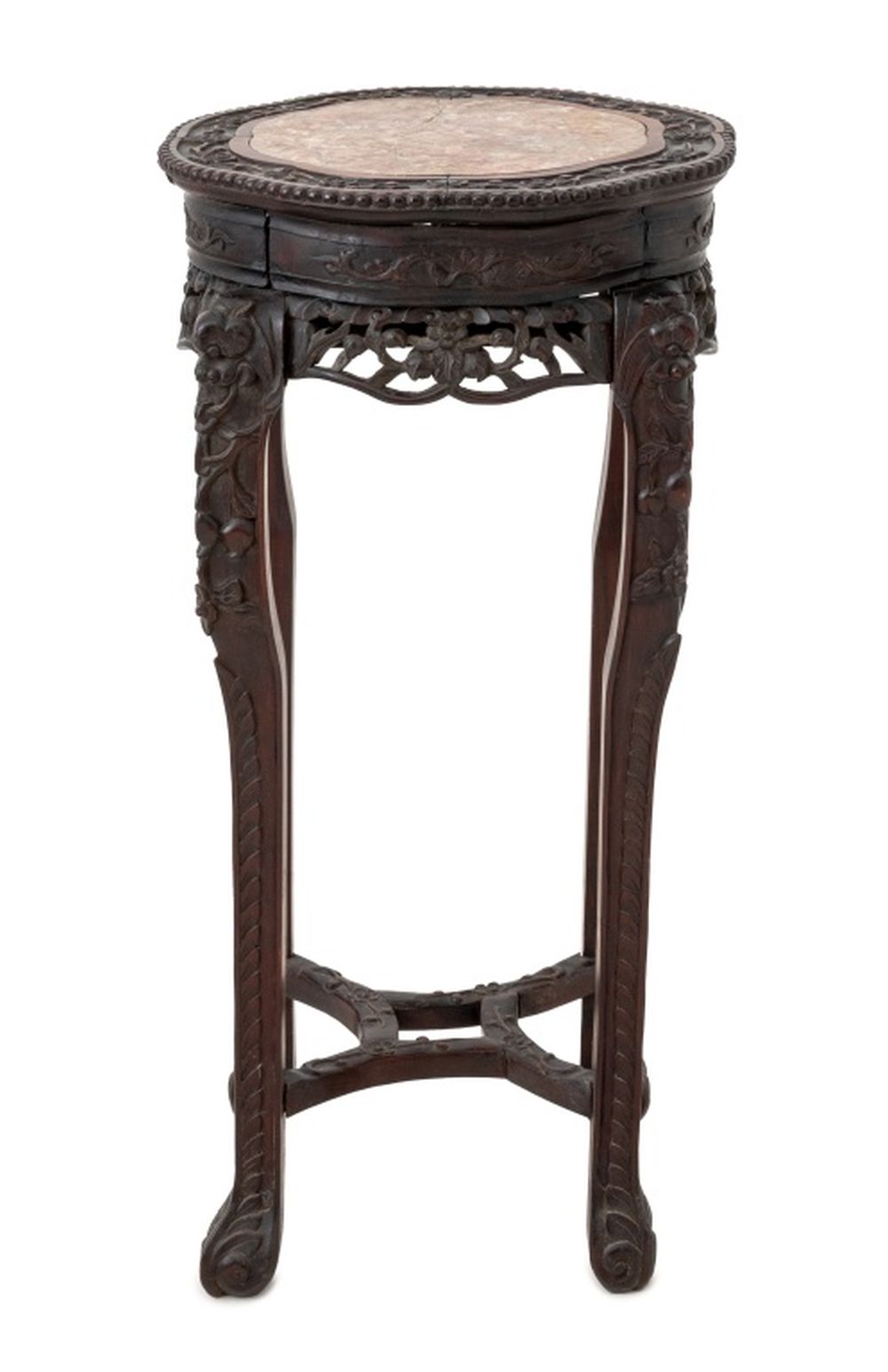 Chinese Carved Hardwood and Marble Pedestal Table, late 19th century, the lobed inset marble top with carved border and frieze, on four tall scrolled legs joined by stretcher. 36" H x 14.5" W x 14.5" D. Keywords: Asian Arts, Antique Furniture, Lamp table, Side Table, Display stand, Sculpture gallery, Plant stand, Specimen Marble, Interior Decor, Decorative Arts