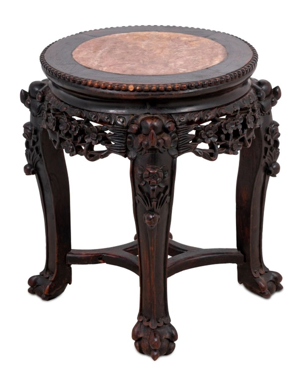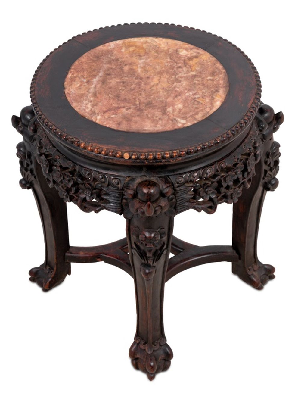 Chinese Carved Hardwood and Marble Circular Low Pedestal Table, late 19th century, the circular inset top above a carved frieze, on carved legs with claw and ball feet, joined by an X-stretcher. 8.5" H x 18" W x 18" D. Keywords: Asian Arts, Antique Furniture, Lamp table, Side table, Display stand, Sculpture gallery, Plant stand, Interior design, Decorative Arts