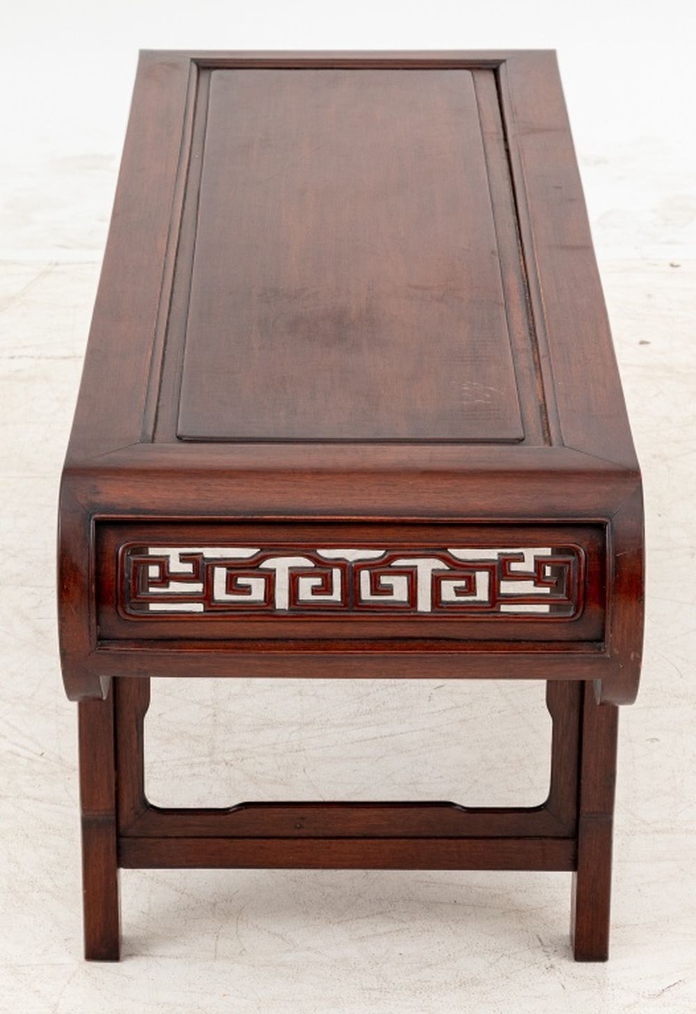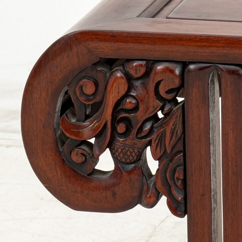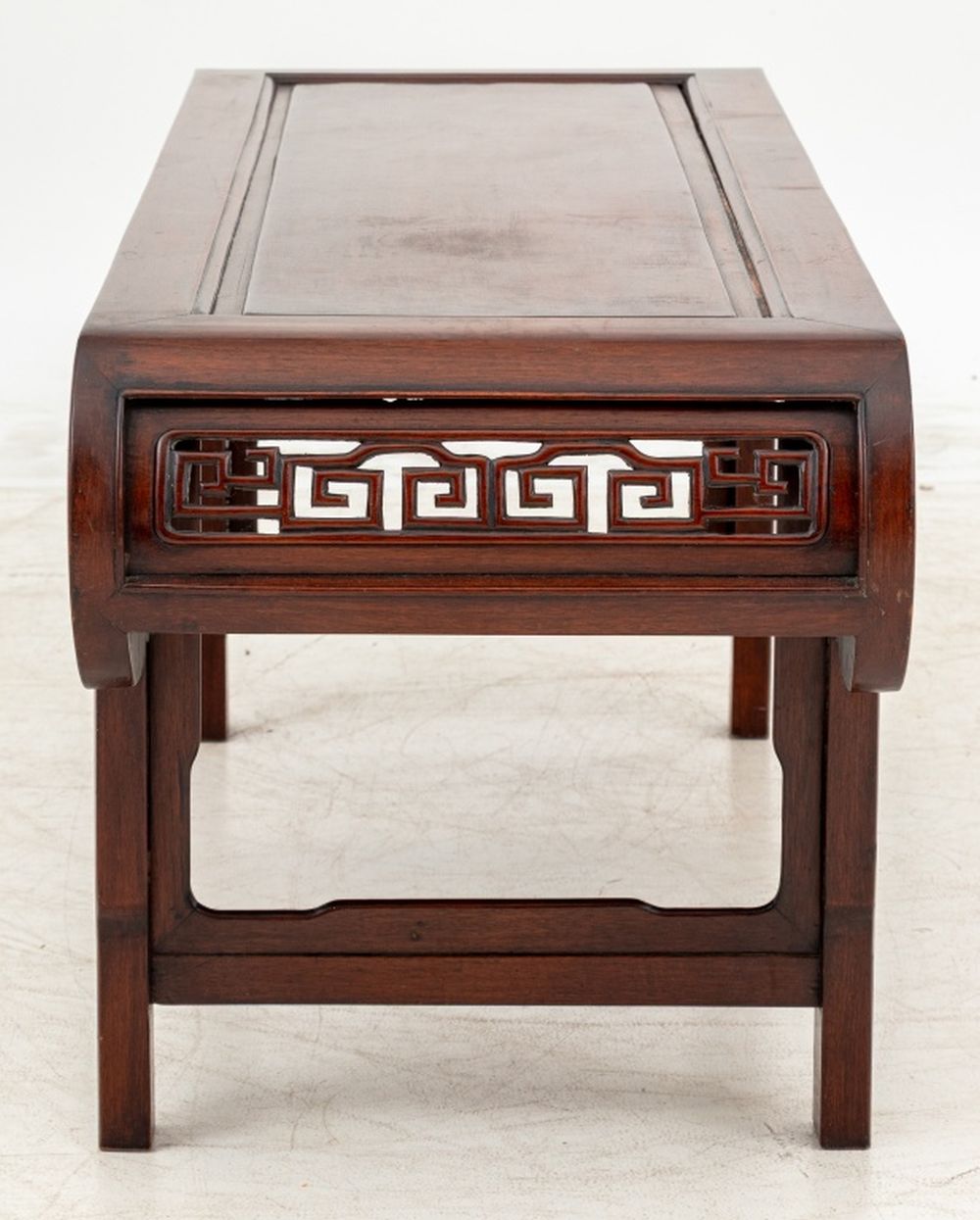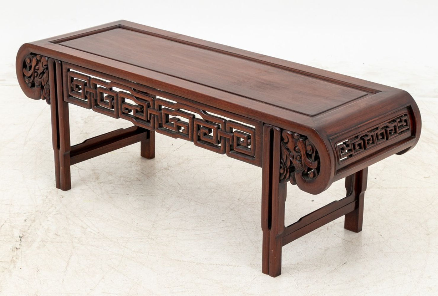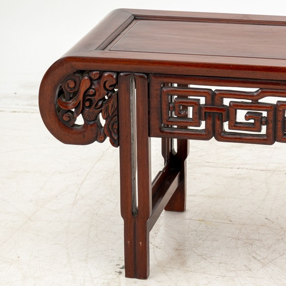 Chinese Hardwood Low Table, with reticulated scrollwork apron. 16.75" H x 45.5" W x 15" D. Provenance: From a 35 East 75th Street Estate. Keywords: Asian Furniture, Carving, Carved wood, Kang zhou, Altar table, Coffee table, Cocktail table, Interior design, Decorative Arts