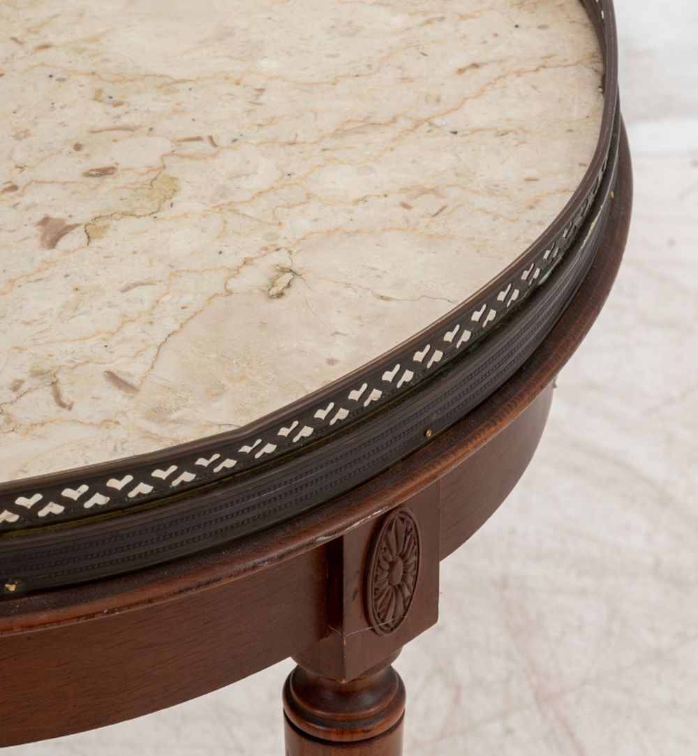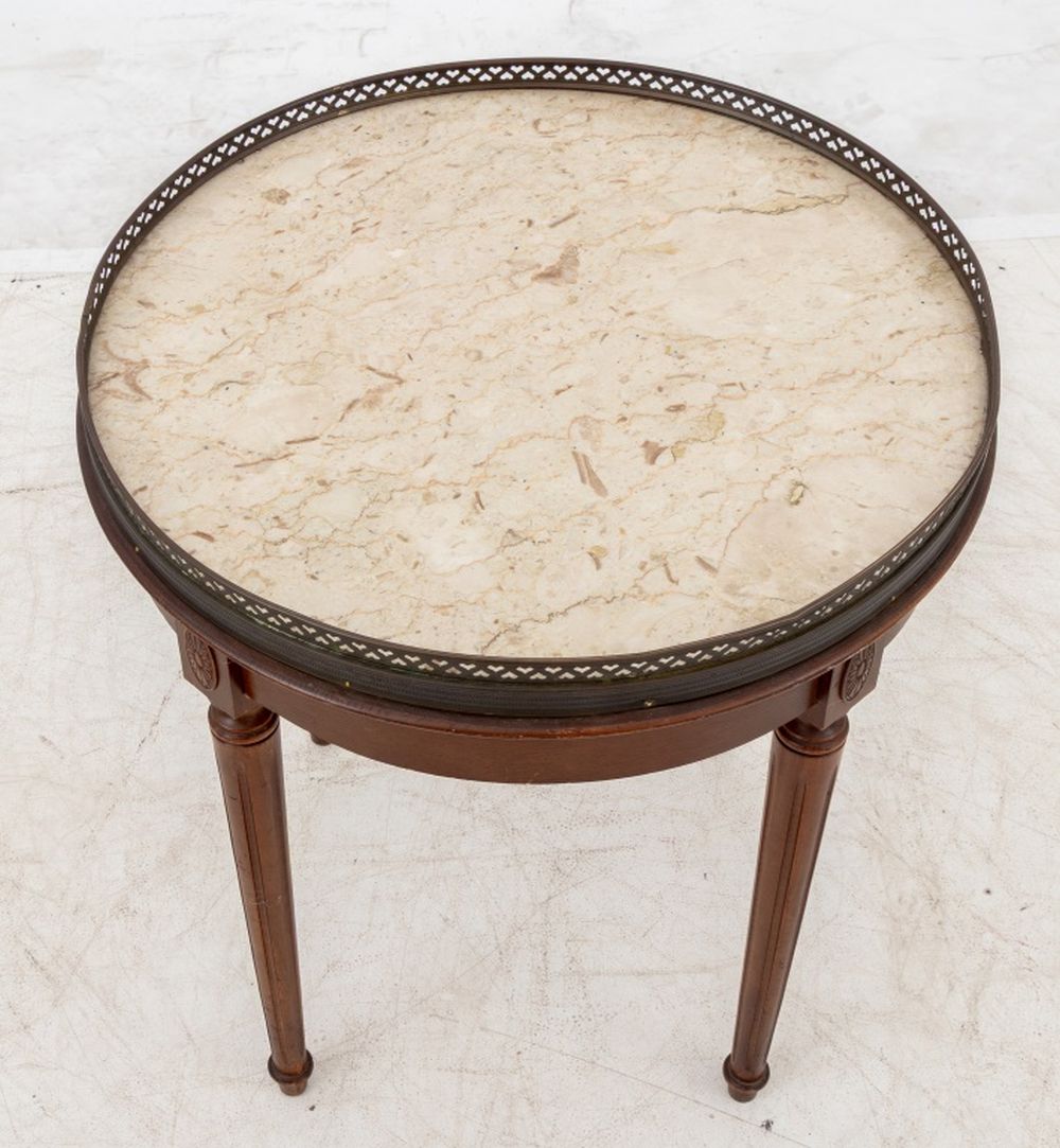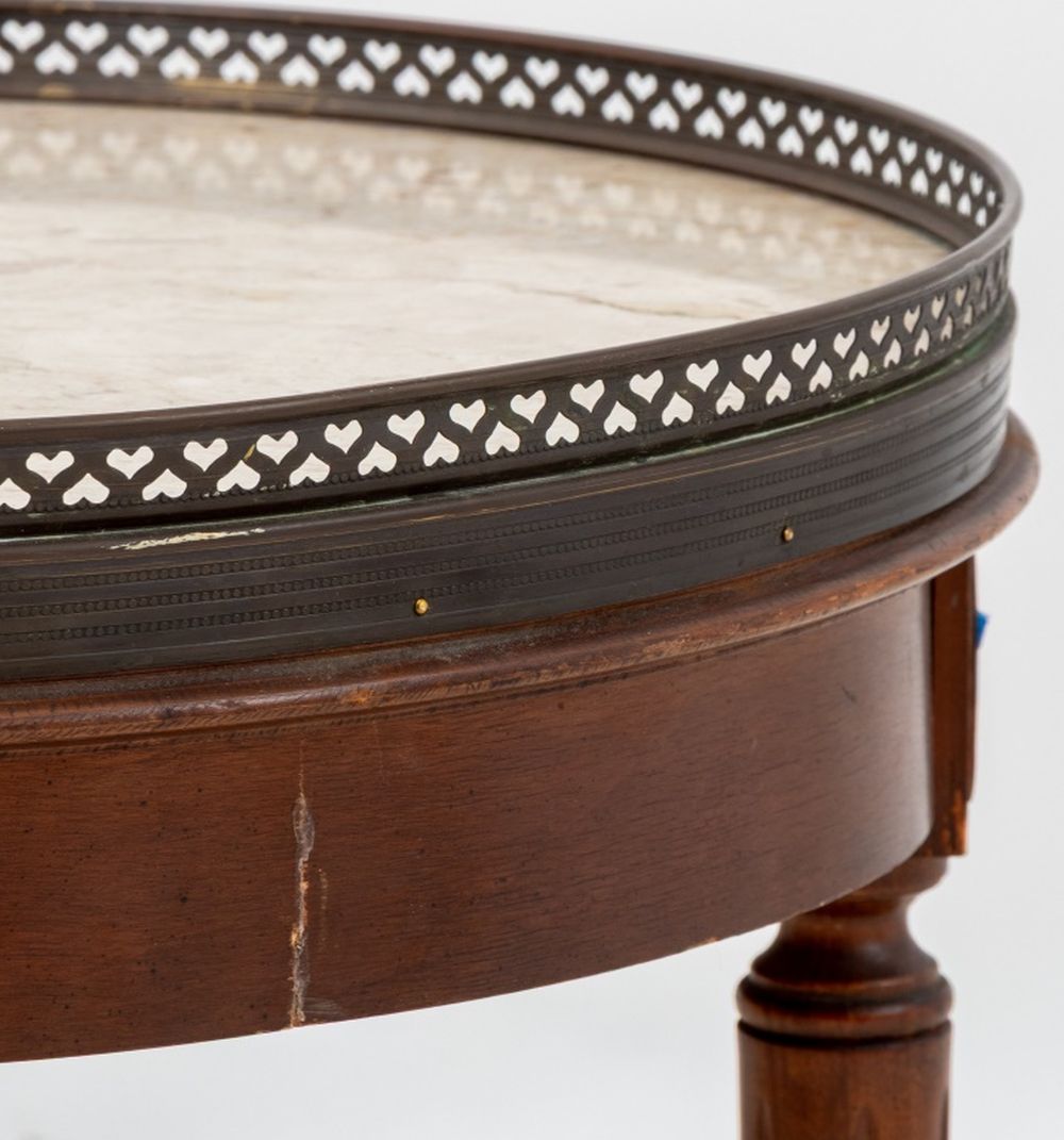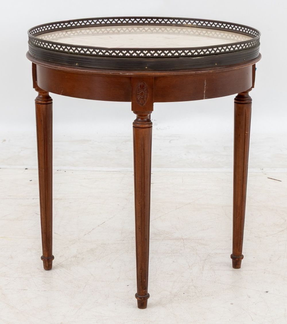 Louis XVI Style Walnut Marble Top Circular Table, with pierced brass galleried top, with single drawer on fluted tapered legs with brass tipped feet. 22.5" H x 20.5" Diameter. Provenance: From an Upper East Side Collection. Keywords: Furniture, Side table, Lamp table, Accent table, French style, Hearts, Interior design, Decorative Arts, Vintage