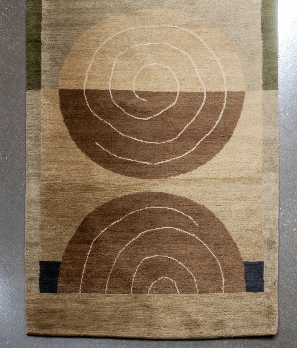 Modern Wool Pile Green Runner, with circle pattern.11' 8" L x 3' 1" W. Provenance: From a New York City Collection. Keywords: Rugs, Carpets, Floor covering, Textile, Geometric design, Decorative Arts