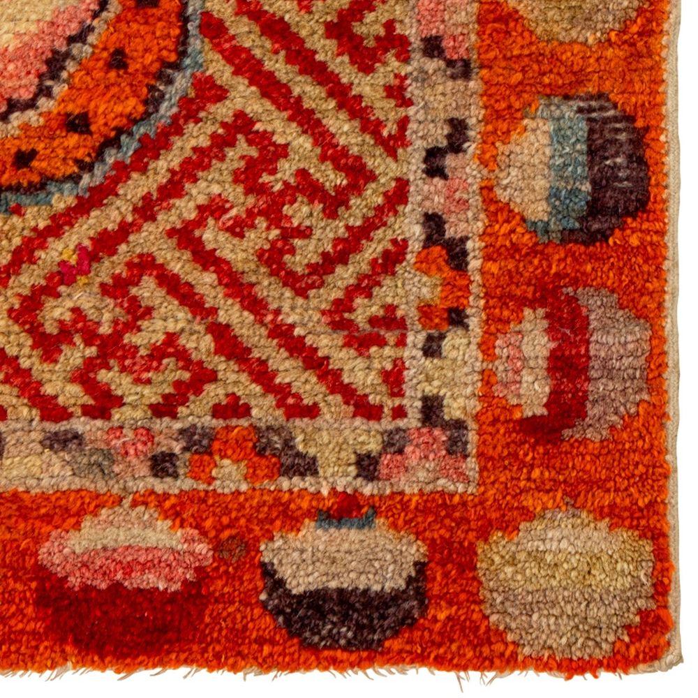 Tibetan Meditation Mat, early 20th century, circular center design with red patterning, orange border with circular patterns. 1' 8" L x 1' 9" W. Provenance: From the Upper East Side Apartment of a Former Ambassador. Keywords: Textiles, Carpets, Knotted Pile, Vegetable Dyed, Sitting rug, Square, Wall hanging, Prayer rug, Drumze, Khagangma, Pink, Wholeness, Lunar, Moon Phases, Buddhist, Buddhism, Antique, Interior design, Decorative Arts