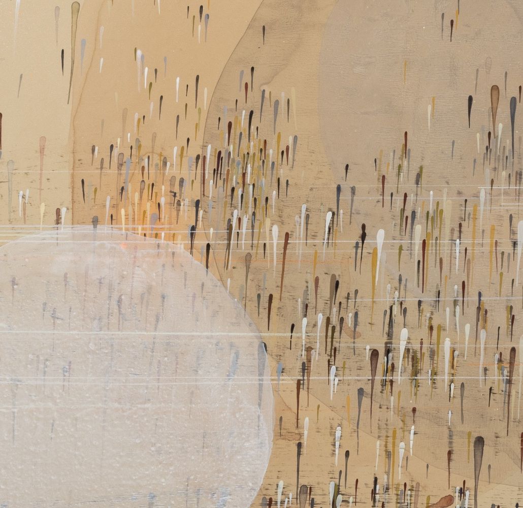 Abstract Composition Diptych, Mixed Media on Paper, laid on board, overlapping transparent circles with a flock of teardrops, apparently unsigned, unframed. Panel: 24" H x 24" W. Provenance: From a Brooklyn Composition. Keywords: Painting, Works on Panel, Gouache, Watercolor, Watercolour, Abstraction, 20th Century School, Post-War and Contemporary Art