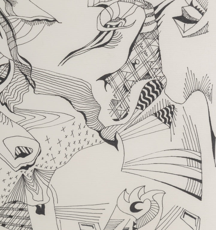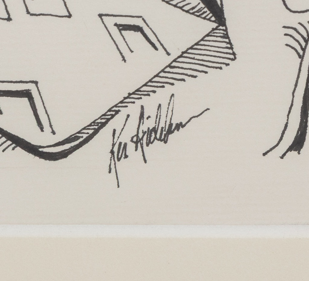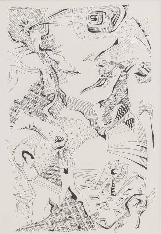 Contemporary School, Surrealist Composition, Ink on Paper, illegibly signed "Ken ....?" lower right, wood frame. Image: 9.5" H x 6.25" W; frame: 16" H x 13" W. Provenance: From a Central Park West Collection. Keywords: Drawing, Illustration, Works on Paper, Abstract, Abstraction, Surrealism, Pattern, Texture, Architectural, Contemporary Art