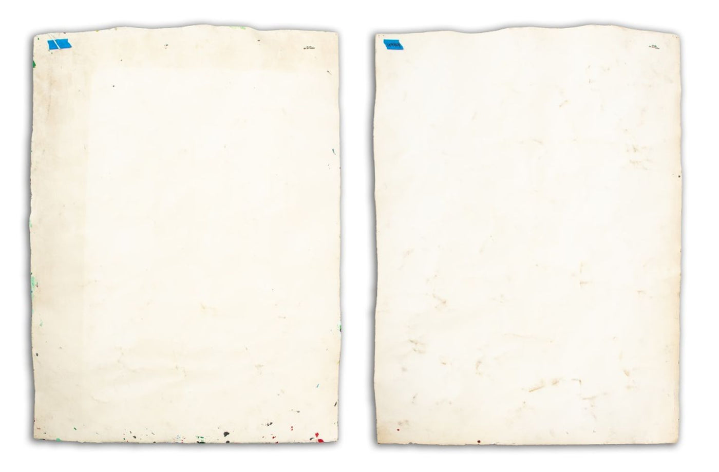 Elfi Schuselka (Austrian, b. 1940), Two Abstract Compositions, Mixed Media Collage on Paper, raised sculpted ridges with painted tips on black ground with painted edges, apparently unsigned, each stamped "Studio Elfi Schuselka" to verso, unframed. 39.75" H x 29.5" W x 1.5" D. Provenance: From the collection of the artist. Note: Schuselka studied photography, art history, and theater at the University of Vienna. She moved to New York in 1964. Her work has been exhibited internationally in the United States, Italy, France, and Japan, as well as at the Cracovia Biennial, Yugoslavia, Ibiza Biennial, Spain, and the Sao Paulo Biennial. Her work is part of the permanent collections of the Museum of Modern Art (MoMA), New York, the Amon Carter Museum of American Art, Fort Worth, and the International Centre of Graphic Arts, Slovenia. Long a regular exhibitor at the famed 55 Mercer Gallery, Schuselka is well-known in New York art circles together with her husband, Domenick Capobianco (American, b. 1928). Keywords: Drawing, Multimedia, Works on Paper, Illustration, Abstraction, Geometric, Found object, Relief, Polychrome, Postmodern, Post-War and Contemporary, Three-Dimensional Art, 3-D, Women Artists
