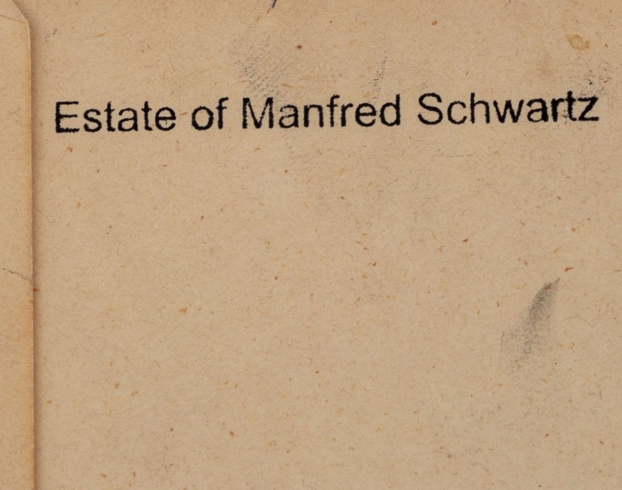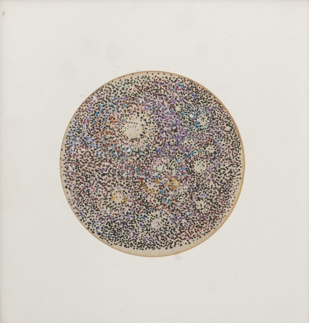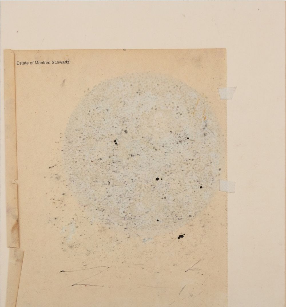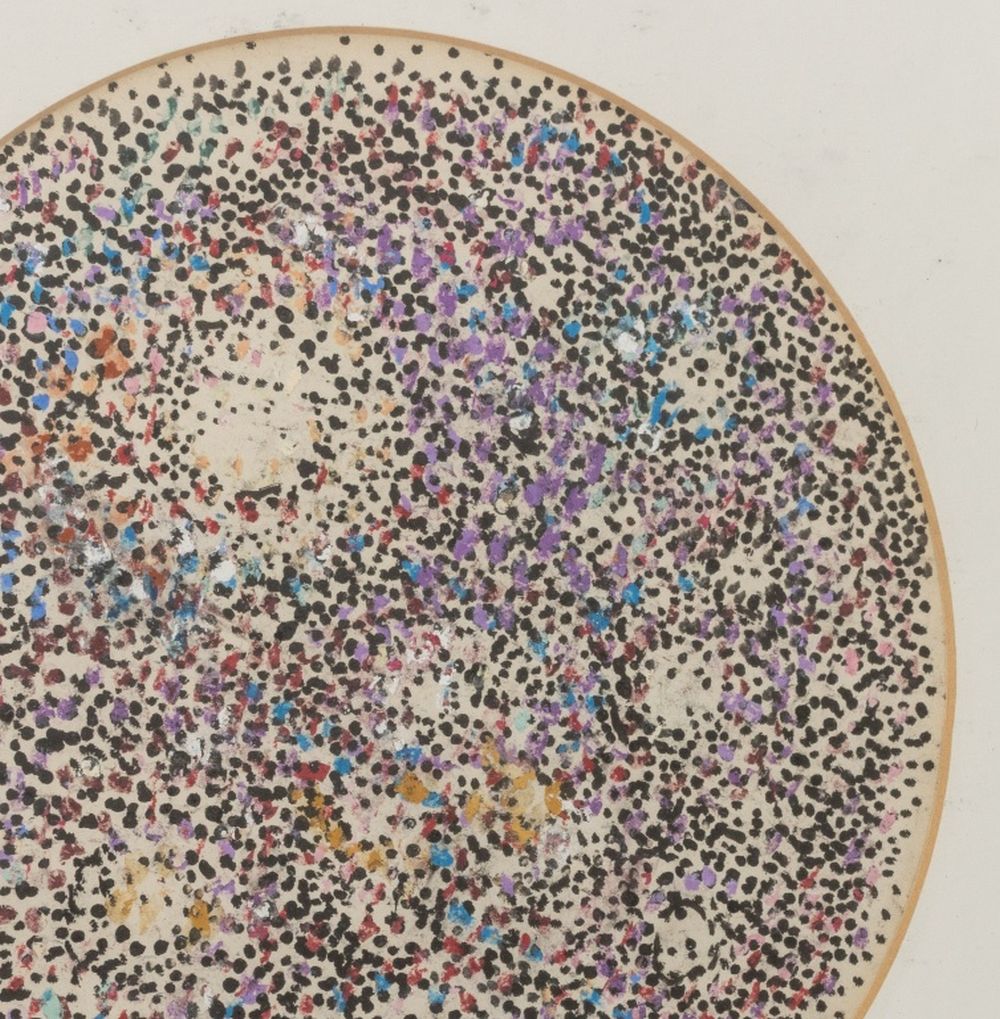 Manfred Schwartz (American, b. Poland, 1909-1970), Celestial Tondo, Pointillist Composition, Gouache on Paper, apparently unsigned, artist estate stamp to verso, with red dot sticker to the verso, silver-tone frame. Image: 7" Diameter; frame: 13.5" H x 12.75" W. Provenance: From a 35 East 75th Street Estate. Keywords: Drawing, Works on Paper, Ink, Abstract, Abstraction, Tondo, Art Students League, Polychrome, Dots, Pointillism, Modernist, American Modernism, Post-War and Contemporary Art, 20th Century Art