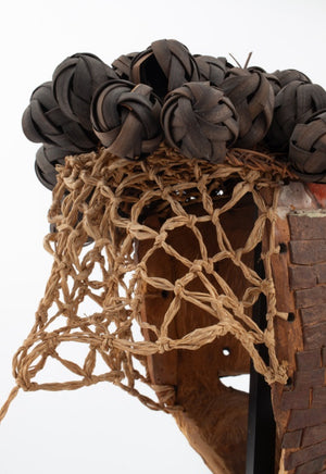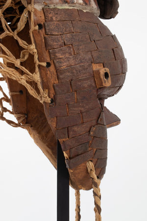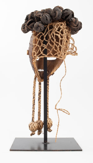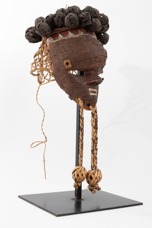 African Salampasu Helmet Mask, carved wood, copper, and raffia, together with metal stand. Mask: 25" H x 10.75" W x 9" D.