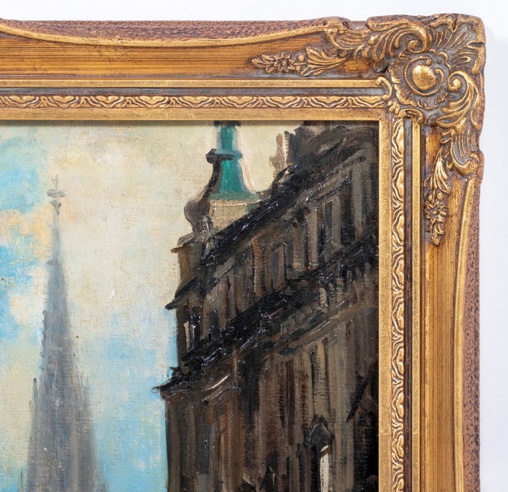 Austrian School, Vienna Street Scene, Oil on Board, 20th century, with St. Stephen's Cathedral in the distance, signed illegibly lower right, giltwood frame. Image: 20" H x 16" W; frame: 23.5" H x 19.5" W. Keywords: Painting, Oil painting, Stephansdom, 1010 Wien, First District, Innere Stadt, Old Town, Cityscape, Architecture, Viennese, Figures, Figural, Figurative, Impressionism, Post-Impressionist, Continental School, 20th Century School, European Art