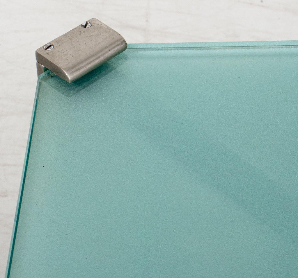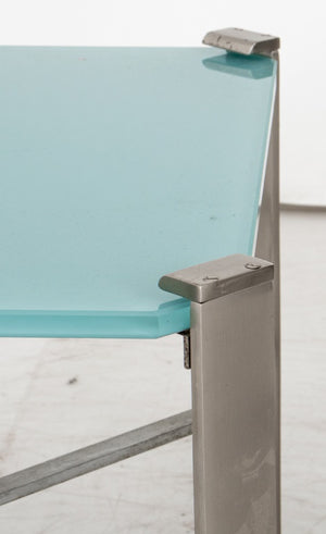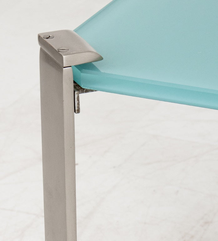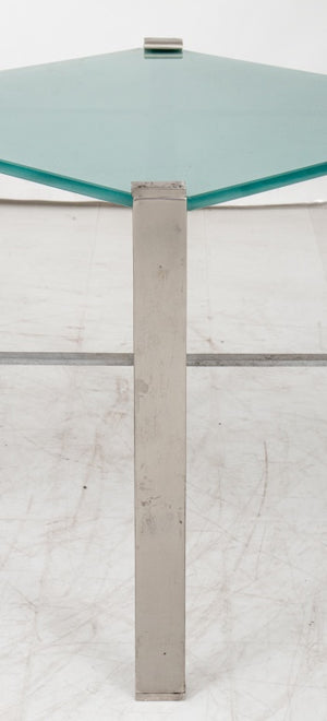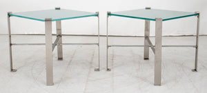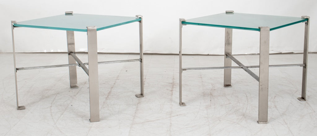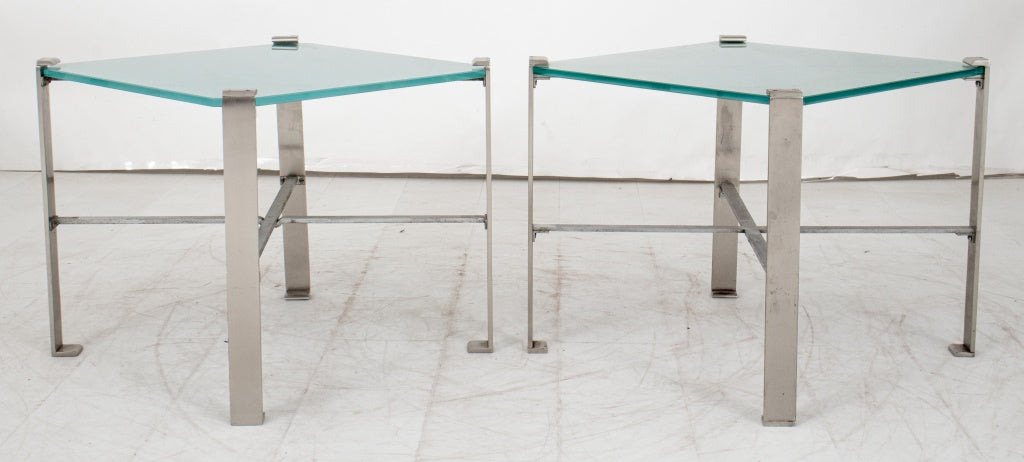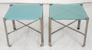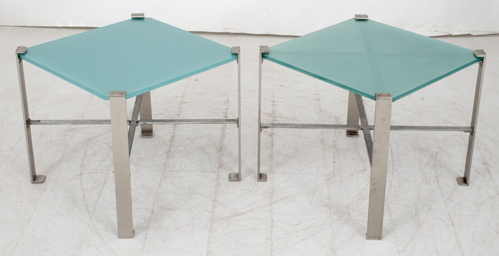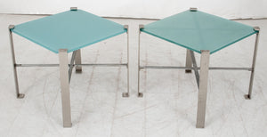 Pair of Donald Deskey (American, 1894-1989) Style Art Deco Steel Coffee Tables, with canted square green glass tops.