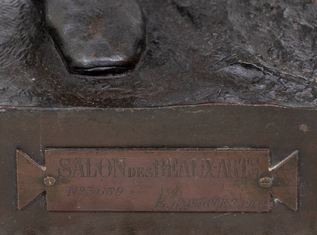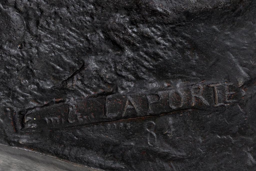 Emile Henri Laporte (French, 1858-1907) "King of the Gauls and his Son" also known as "Vercigentorix with His Son" Patinated Bronze Sculpture, late 19th century, depicting the King of the Gauls with his hand on the shoulder of his son, signed to base and dated "'84", stamped "4083", and with label inscribed "Salon des Beaux Arts / No. 3659 / E. Laporte sculptr". 34.25" H x 21" W x 16" D.