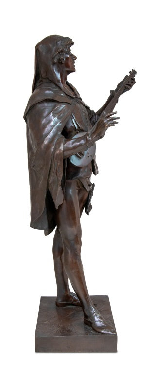 Emile-Louis Picault (French,1833-1915) "Joueur de Luth" [Lute Player] Patinated Bronze Figural Sculpture, late 19th century, the standing figure in Renaissance style costume playing a lute, on a square plinth, signed to base. 30" H x 13" W x 12" D. Keywords: French Art, Bronzier, Belle Epoque, Salon de Beaux Arts, Statue, Renaissance Revival, Figurative, Musician, Minstrel, Interior decor, Antique, Decorative Arts