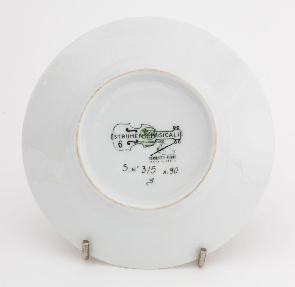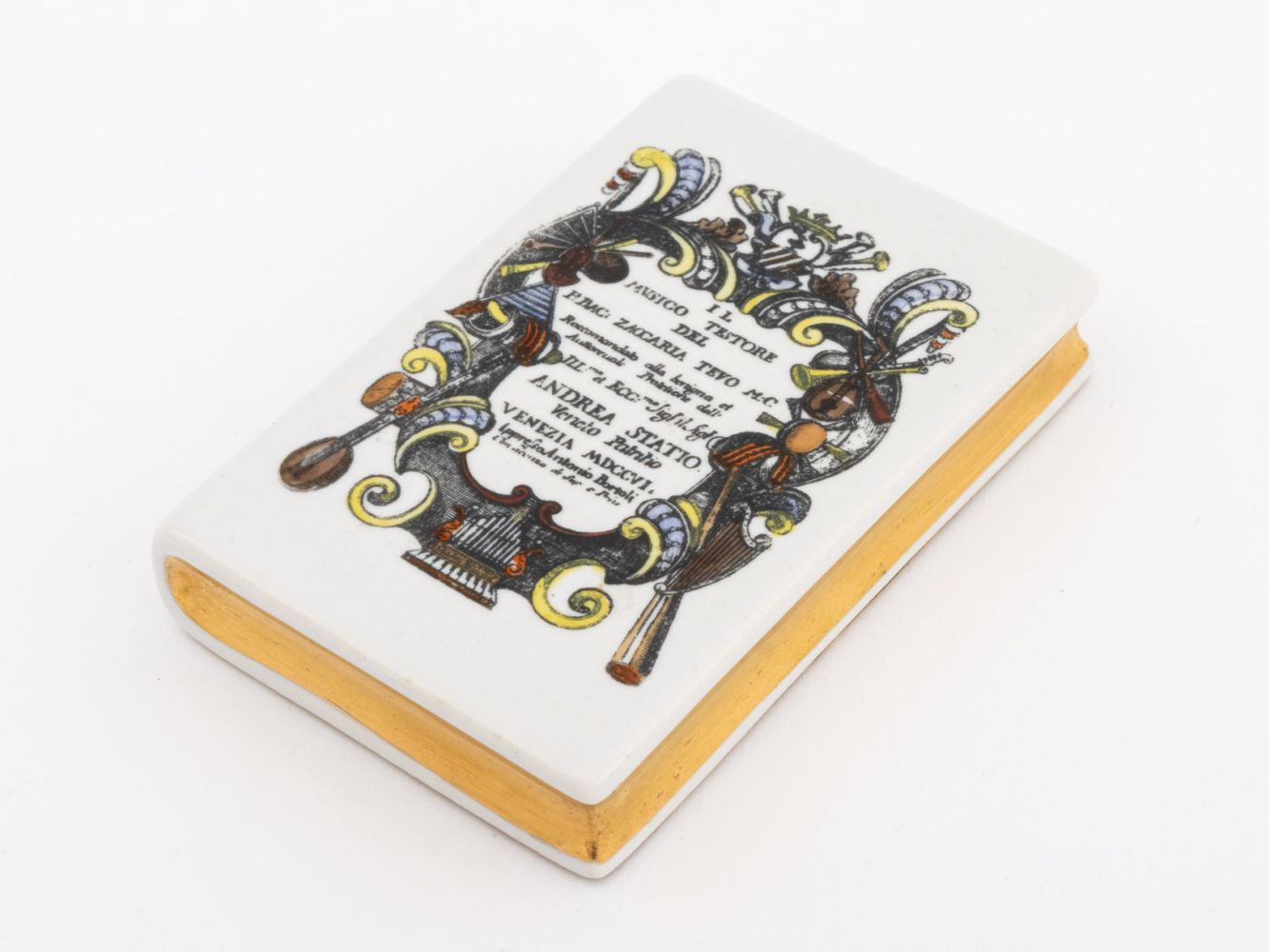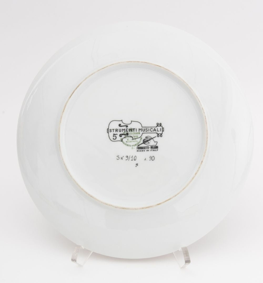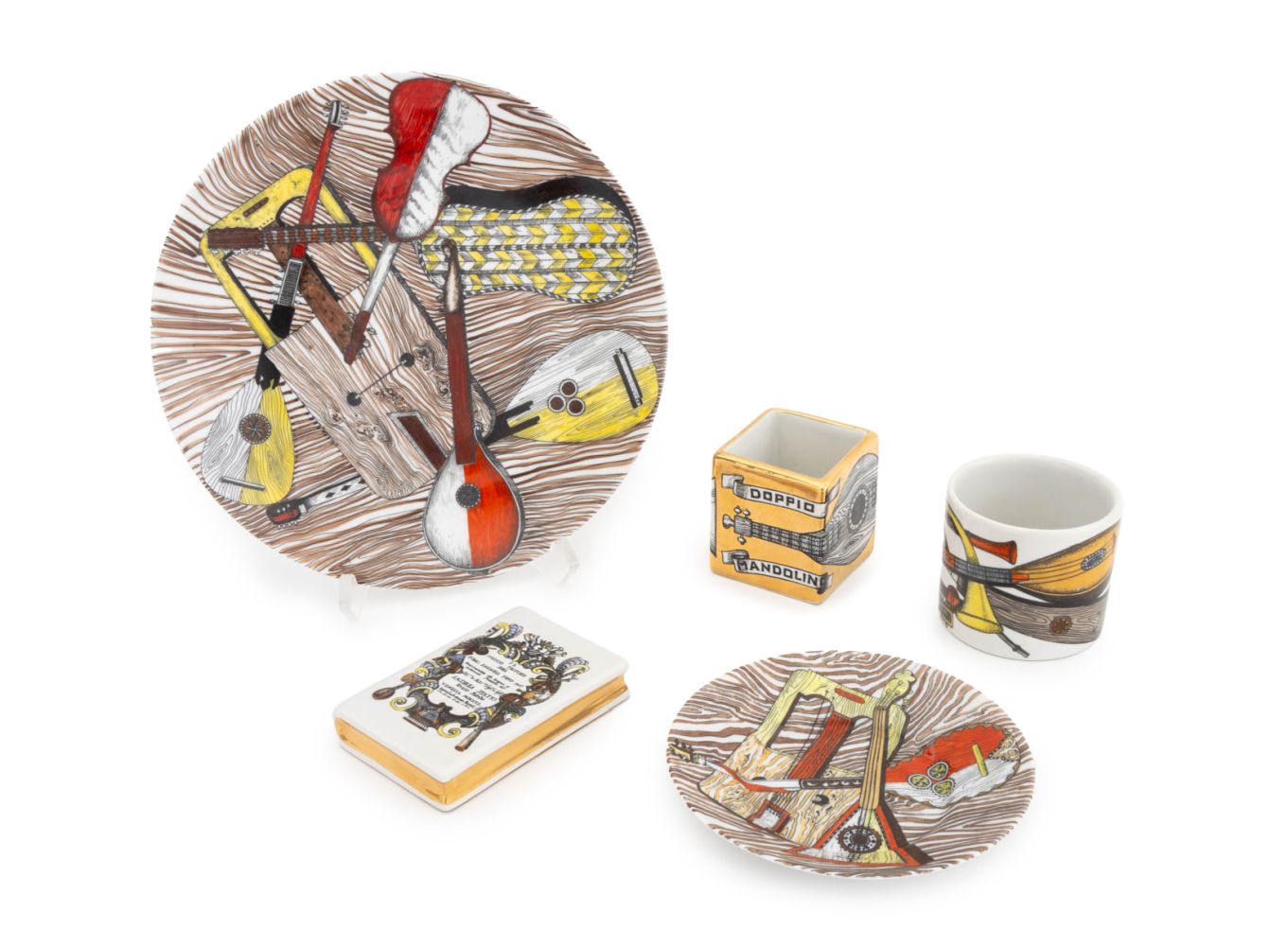 Collection of Five Fornasetti Porcelain Musical Instrument Tableware Pieces, comprising: (2) two "Instrumenti Musicali", plate and small dish, marked "Fornasetti Milano / Made in Italy", (1) one cup, marked "Fornasetti Milano Made in Italy" to the underside, (1) one "Trombone Basso / Doppio Mandolin" square cup with gilded ground, marked "Fornasetti Milano / Made in Italy" to the underside and (1) one book form paperweight, with instrumental crest to the top, gilded foredge, marked "Fornasett Milano / Made in Italy" to the underside. Largest: 9.5" Diameter. Provenance: From the Collection of Laura and Lewis Kruger. Keywords: Ceramics, Italian, Piero Fornasetti, Gilding, Table decor, String instruments, Woodwinds, Sound, Designer,  Decorative Arts