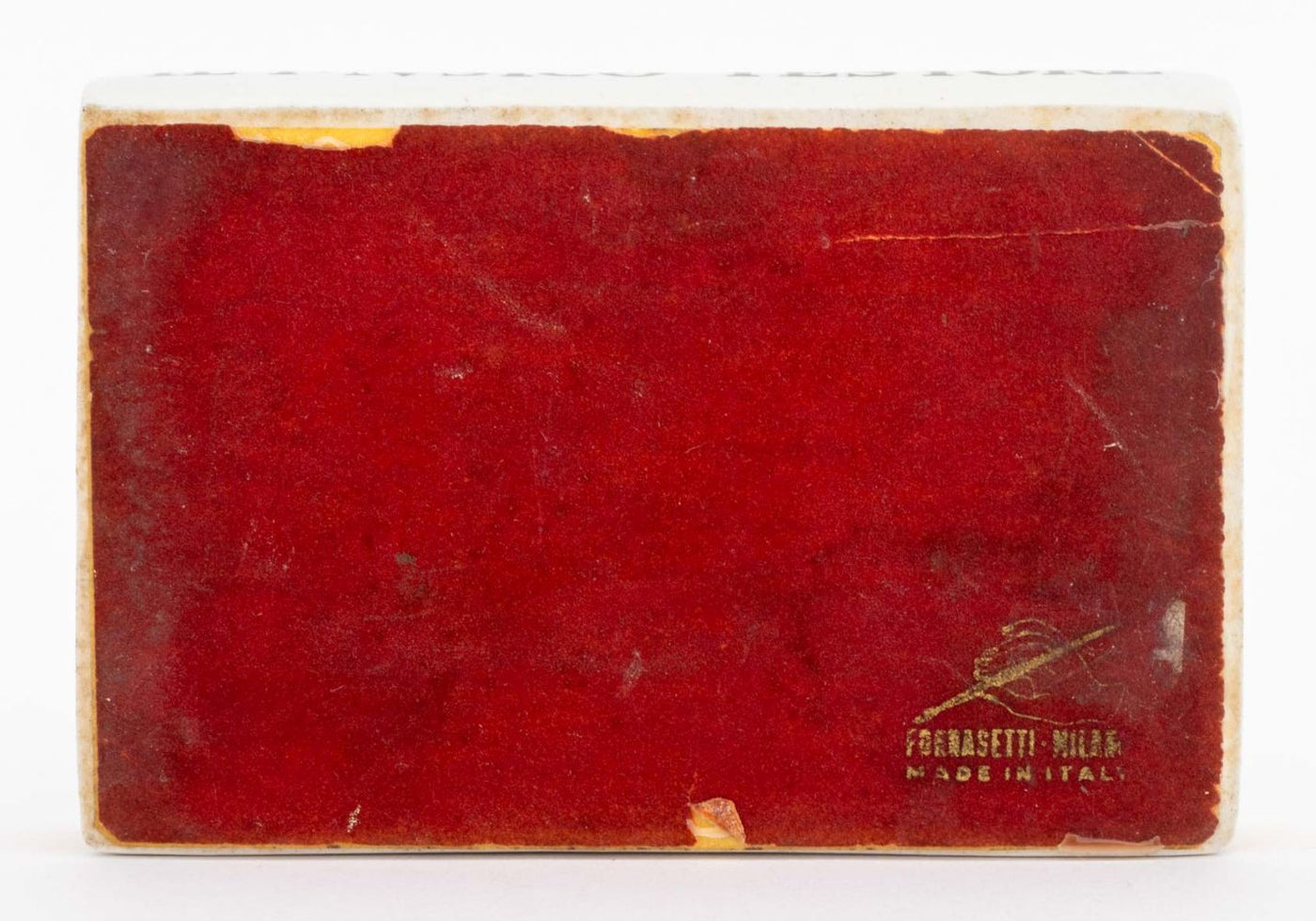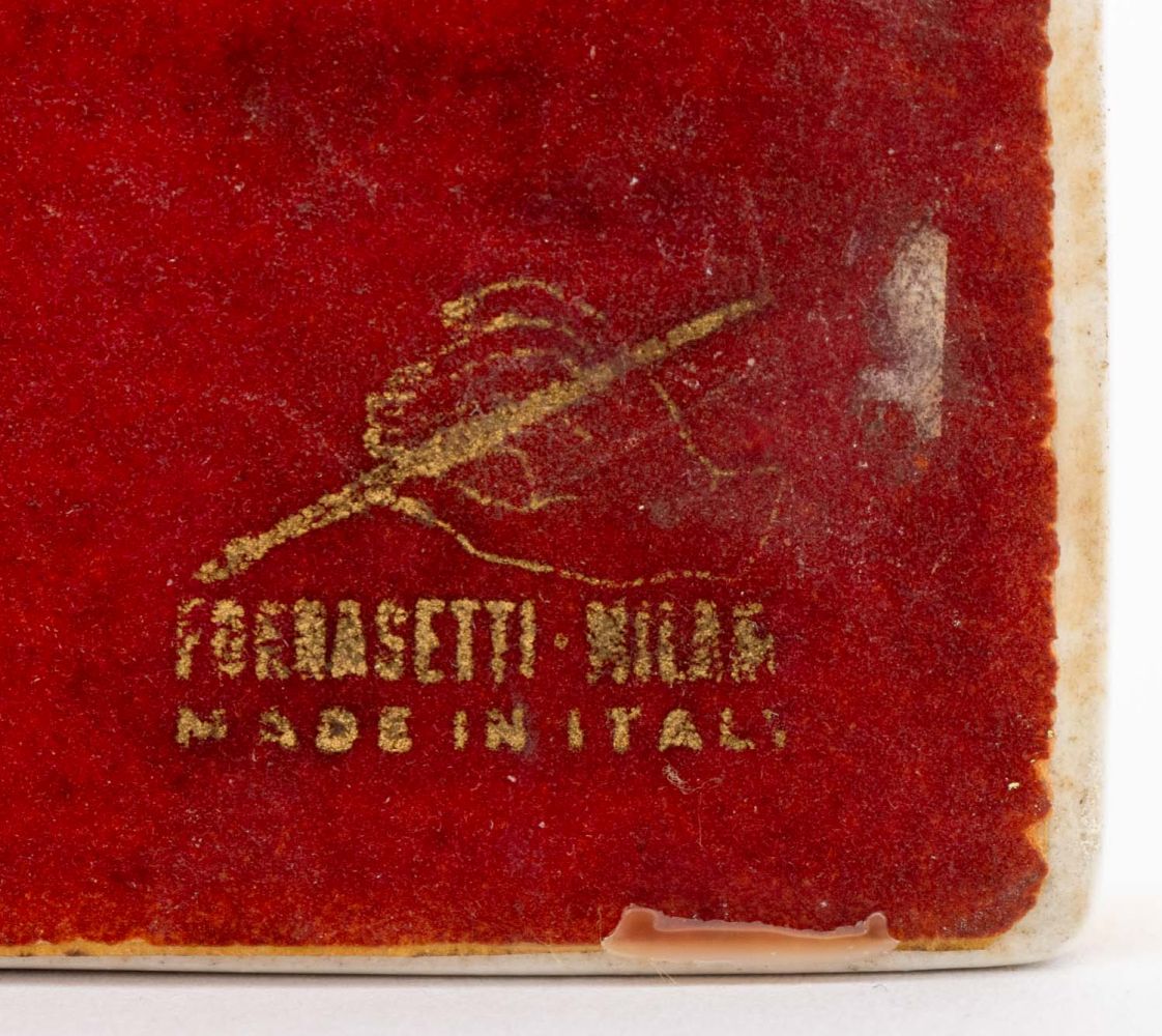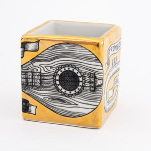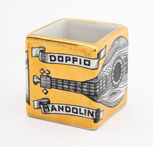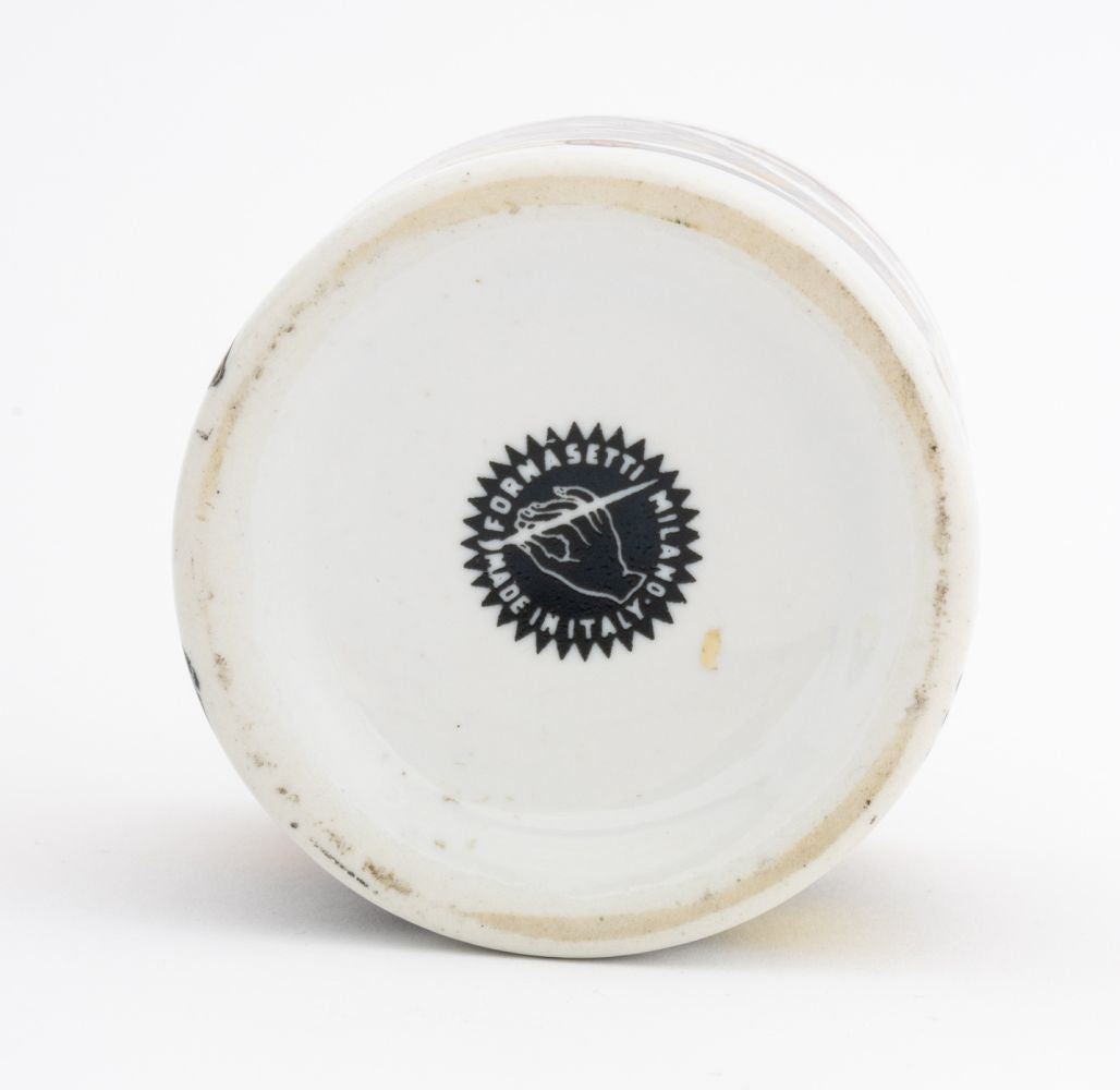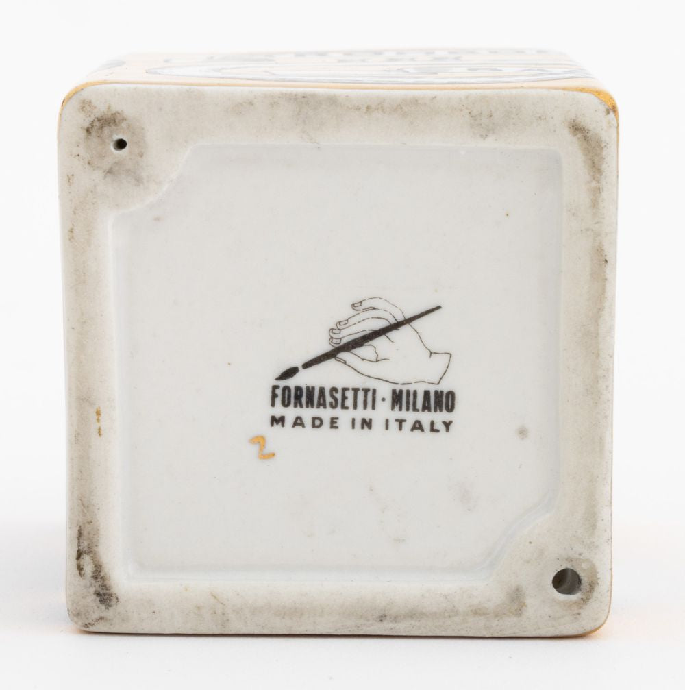 Collection of Five Fornasetti Porcelain Musical Instrument Tableware Pieces, comprising: (2) two "Instrumenti Musicali", plate and small dish, marked "Fornasetti Milano / Made in Italy", (1) one cup, marked "Fornasetti Milano Made in Italy" to the underside, (1) one "Trombone Basso / Doppio Mandolin" square cup with gilded ground, marked "Fornasetti Milano / Made in Italy" to the underside and (1) one book form paperweight, with instrumental crest to the top, gilded foredge, marked "Fornasett Milano / Made in Italy" to the underside. Largest: 9.5" Diameter. Provenance: From the Collection of Laura and Lewis Kruger. Keywords: Ceramics, Italian, Piero Fornasetti, Gilding, Table decor, String instruments, Woodwinds, Sound, Designer,  Decorative Arts