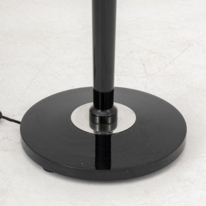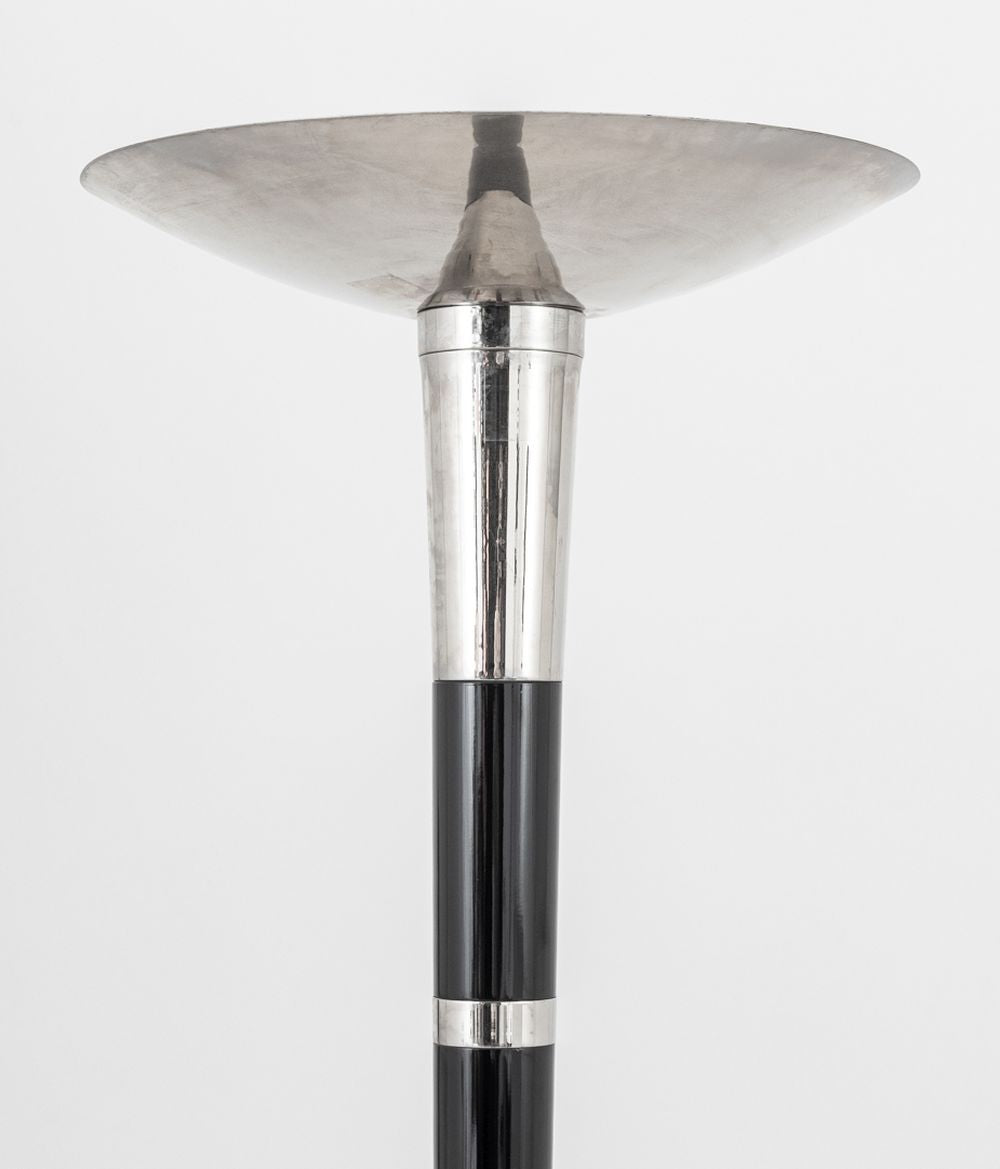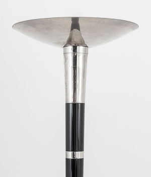 French Art Deco Style Chrome and Ebonized Floor Lamp, with saucer shade. 73.75" H x 23" Diameter. Provenance: From an East 78th Street, New York Estate. Keywords: Lighting, Vintage lamp, Standing lamp, Torchere, Torchiere, Interior design, Decorative Arts