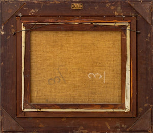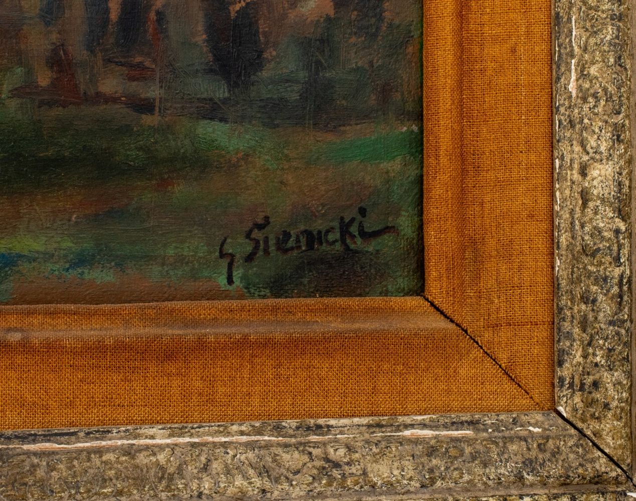 George Rene Sinicki (Russian/French, b. 1910), Village Landscape Scene, Oil on Canvas, depicting a forest path beside a town with buildings visible through the trees, signed "G. Sienicki" lower right, carved wood frame. Image: 14.5" H x 17.75" W; frame: 23.25" H x 26.5" W x 2.5" D. Provenance: From a 20 East 74th Street Estate. Keywords: Paintings, Oil painting, Works on Canvas, Post-Impressionist, Post-Cubist, Modernist, Modernism, 20th Century Art
