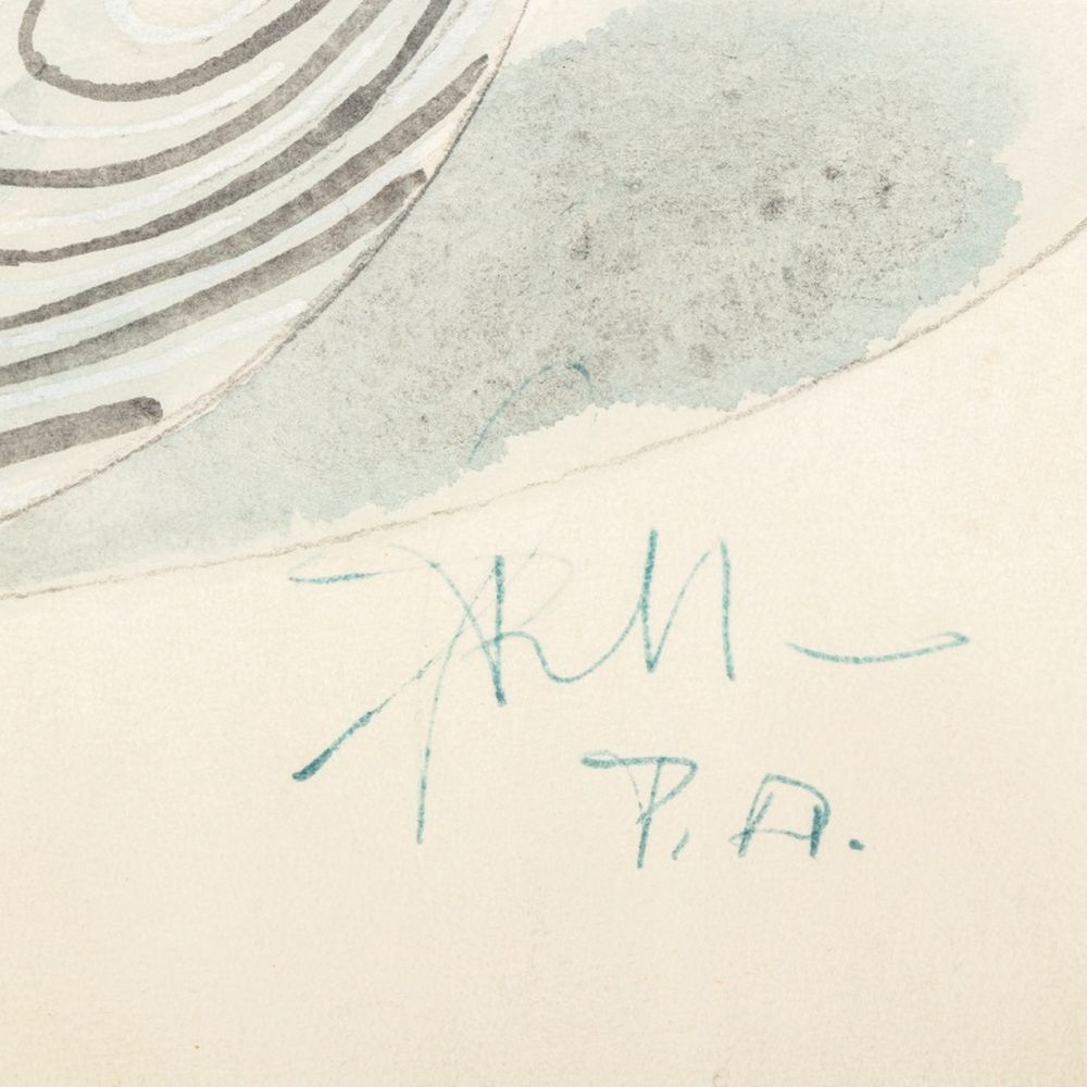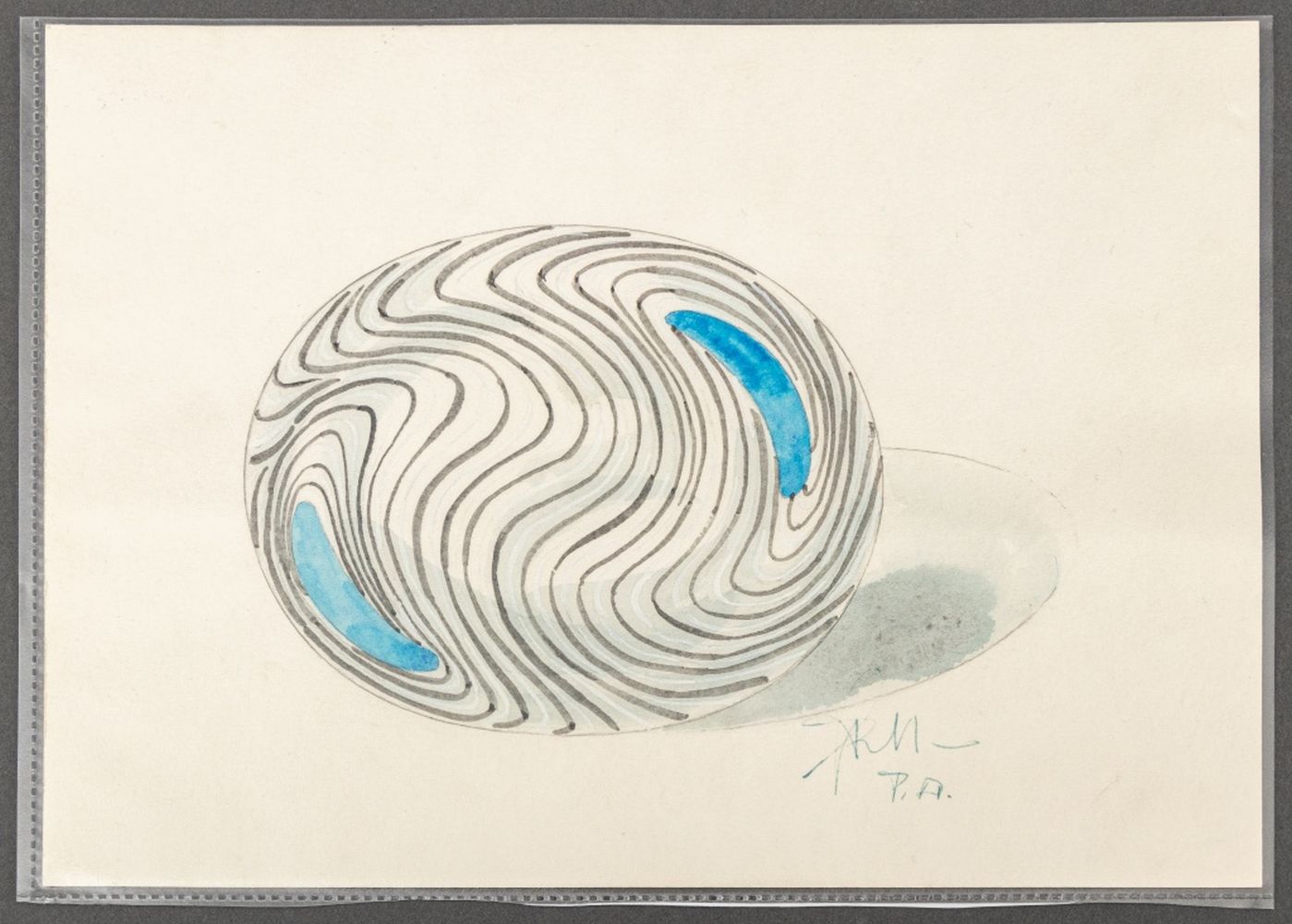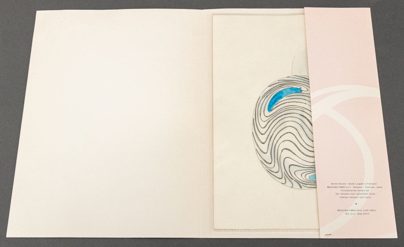 Giampaolo Seguso (Italian, b. 1942) Murano Art Glass Plate, 1993, with black and blue abstract design, artist's proof, signed, dated, and inscribed "Murano / Provo d'artiste" to underside, with chrome and blue glass stand, accompanied by Giampaolo Seguso watercolor sketch of design, signed lower right. 25.75" H x 19.25" Diameter. Provenance: From an Upper East Side Estate. Keywords: Studio Glass, Glassworks, Hand blown glass, Venetian glass, Charger, Statue, Sculpture, Black ribbon, Clear glass, Designer, Glass artist, Transparent, Decorative Arts