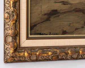 Janos Vaszary (Hungarian, 1867-1939), View of Town at Dusk, Oil on Panel, signed "Vaszary J." lower left, carved giltwood frame. Image: 11.75" H x 16.75" W; frame: 16.75" H x 21.75" W. Provenance: From a 33 East End Avenue Estate. Keywords: Painting, Oil painting, Works on Board, Landscape scene, Village, Houses, Cemetery, Trees, European, Continental School, Impressionist, Impressionism, Modernist, Modernism, Art Nouveau, Kepzomuveszek Uj Tarsasaga, New Society of Artists, KUT, Fountain, Modern Art