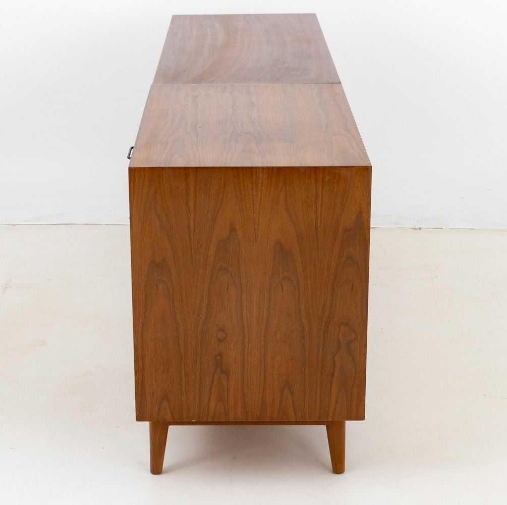 Jens Risom Walnut Two-Piece Credenza, the left side having single cabinet with three shelves and white vinyl tambour door opening to two shelves, the right side with four drawers having brass pulls, each piece on four tapered legs. 31.75" H x 90.25" W x 21" D. Provenance: From a 5th Avenue Estate. Keywords: Vintage Furniture, Danish Furniture, Modern Furniture, Sideboard, Buffet, Cabinets, Storage, MCM, Mid-Century Modern, Scandinavian design, Retro, Interior design, Decorative Arts