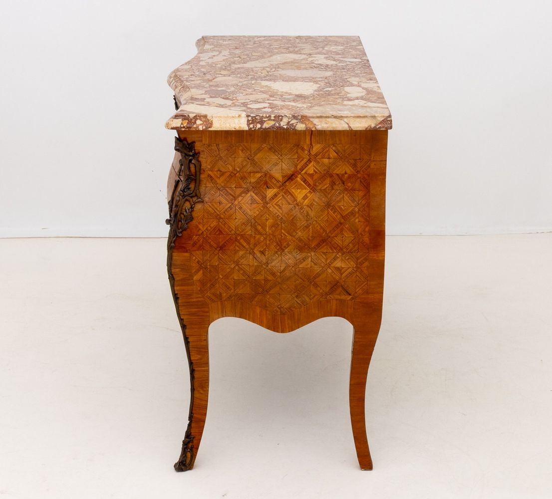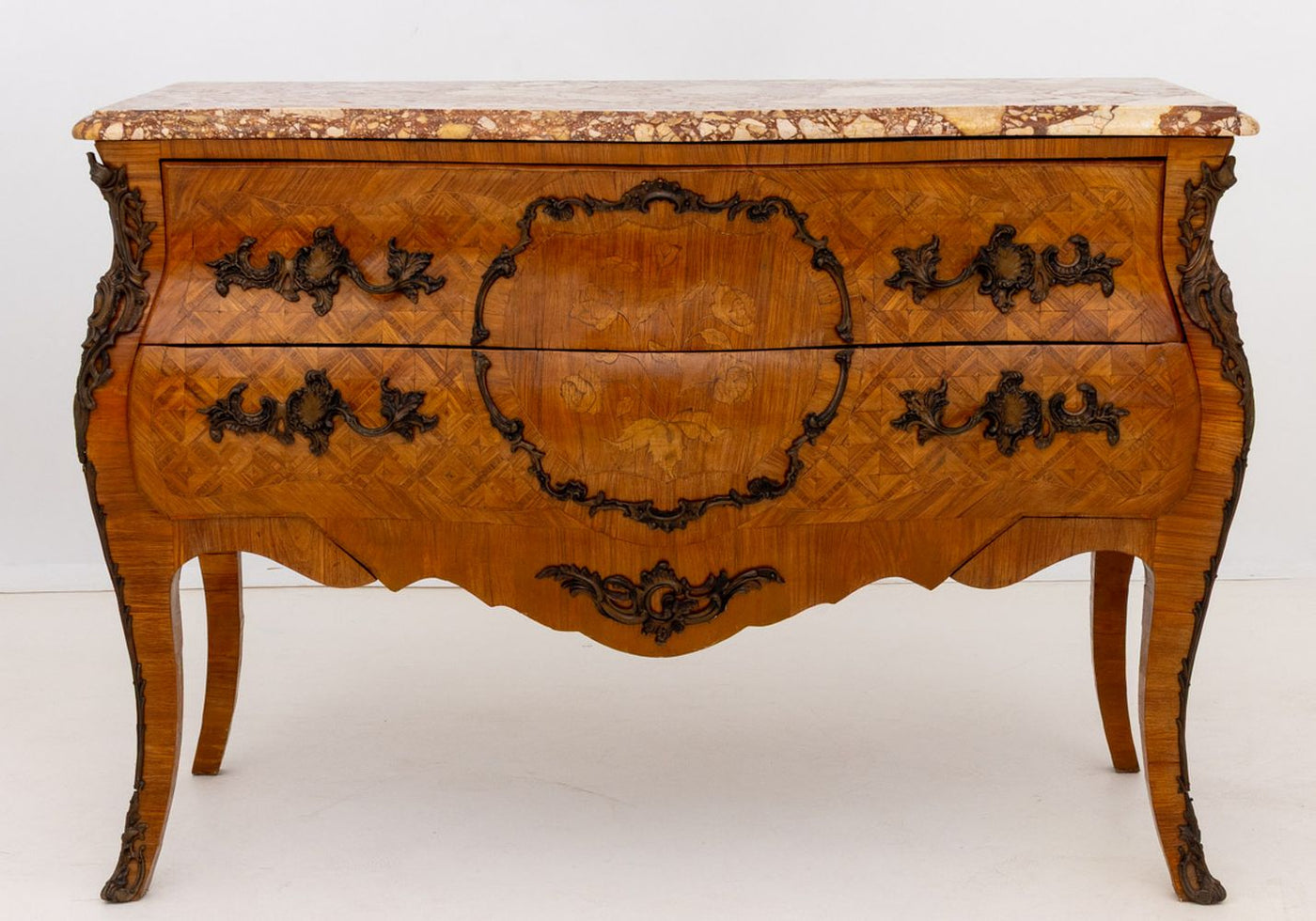 Louis XV Style Walnut Marquetry Bombe Commode, 19th century, with breccia pernice serpentine marble top above two drawers with bronze floral mounts and drawer pulls on four cabriole legs. 35.75" H x 51" W x 22" D. Provenance: From an Upper East Side Estate. Keywords: Antique Furniture, French Furniture, Dresser, Bureau, Chest, Chest of Drawers, Storage, Inlay, Interior design, Decorative Arts